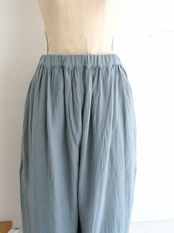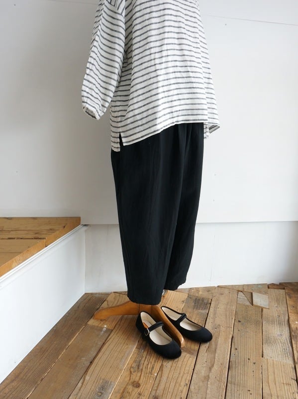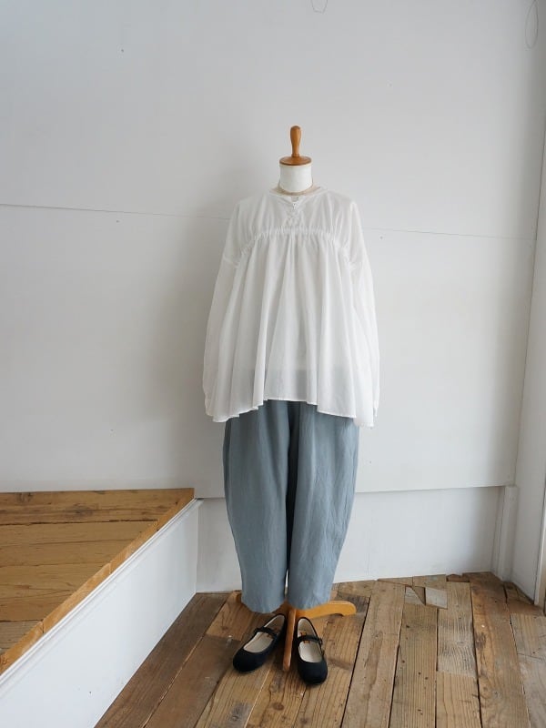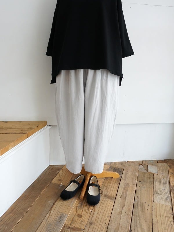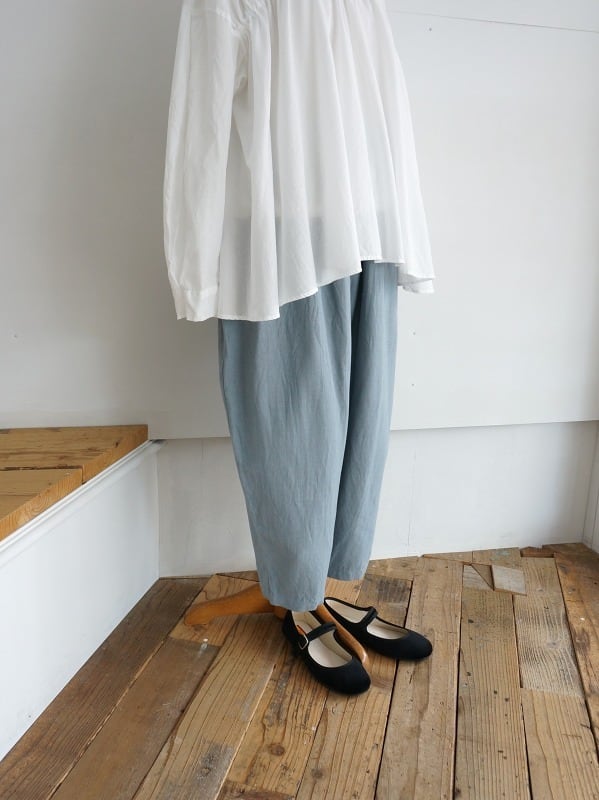 綿麻素材のさらっとした清涼感のあるバックサテンの生地を使っています。ウエストにたっぷりギャザーを寄せたまるみのあるシルエットが特徴のパンツです。レングスは8分から9分丈の足首が出るくらい。ブラウスにもTシャツにも合わせやすくて、軽い印象でコーディネートしていただけます。