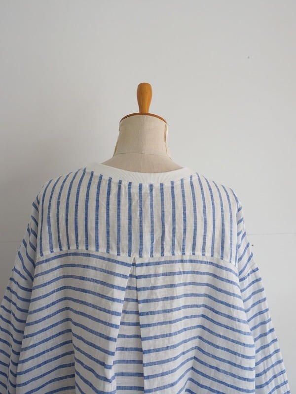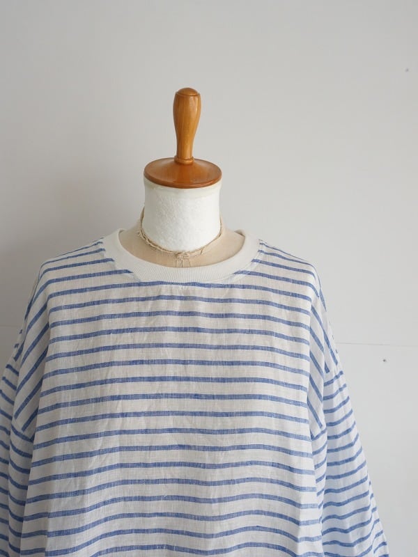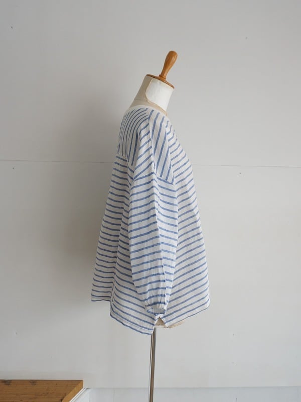 清涼感のあるさらさらの麻の生地を使ったプルオーバーです。丸首、ドロップショルダーのボックスシルエット。ややパフになった袖は7分丈になっています。