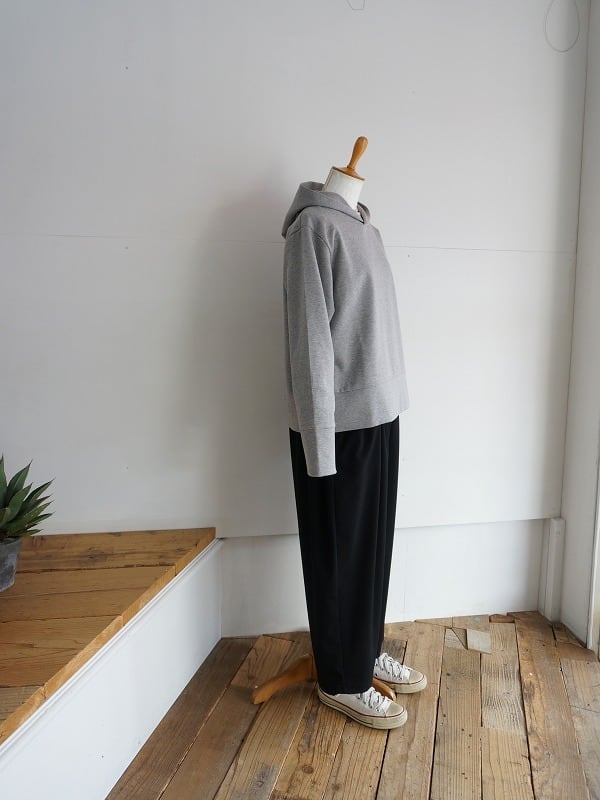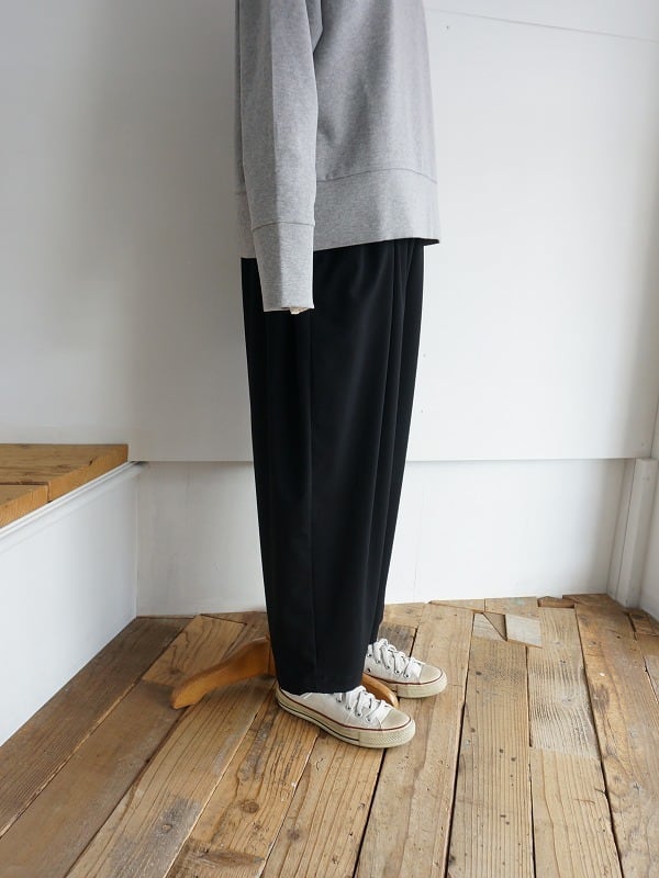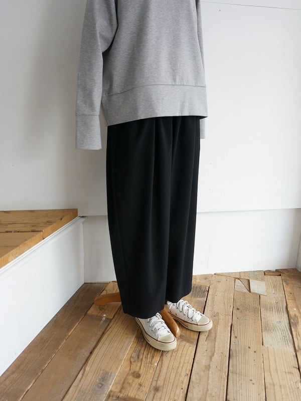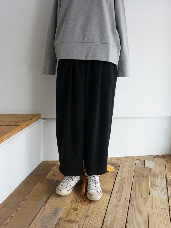 さらっとしたドライな質感でストレッチの効いた生地を使っています。ウエストにギャザーをたっぷり入れたイージーパンツ。ボリュームがありながらも、落ち感があって収まりがきれい。リラックスして穿けつつ、きちんと感も備わっているので、落ち着いた雰囲気にコーディネートがまとまります。
