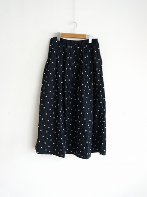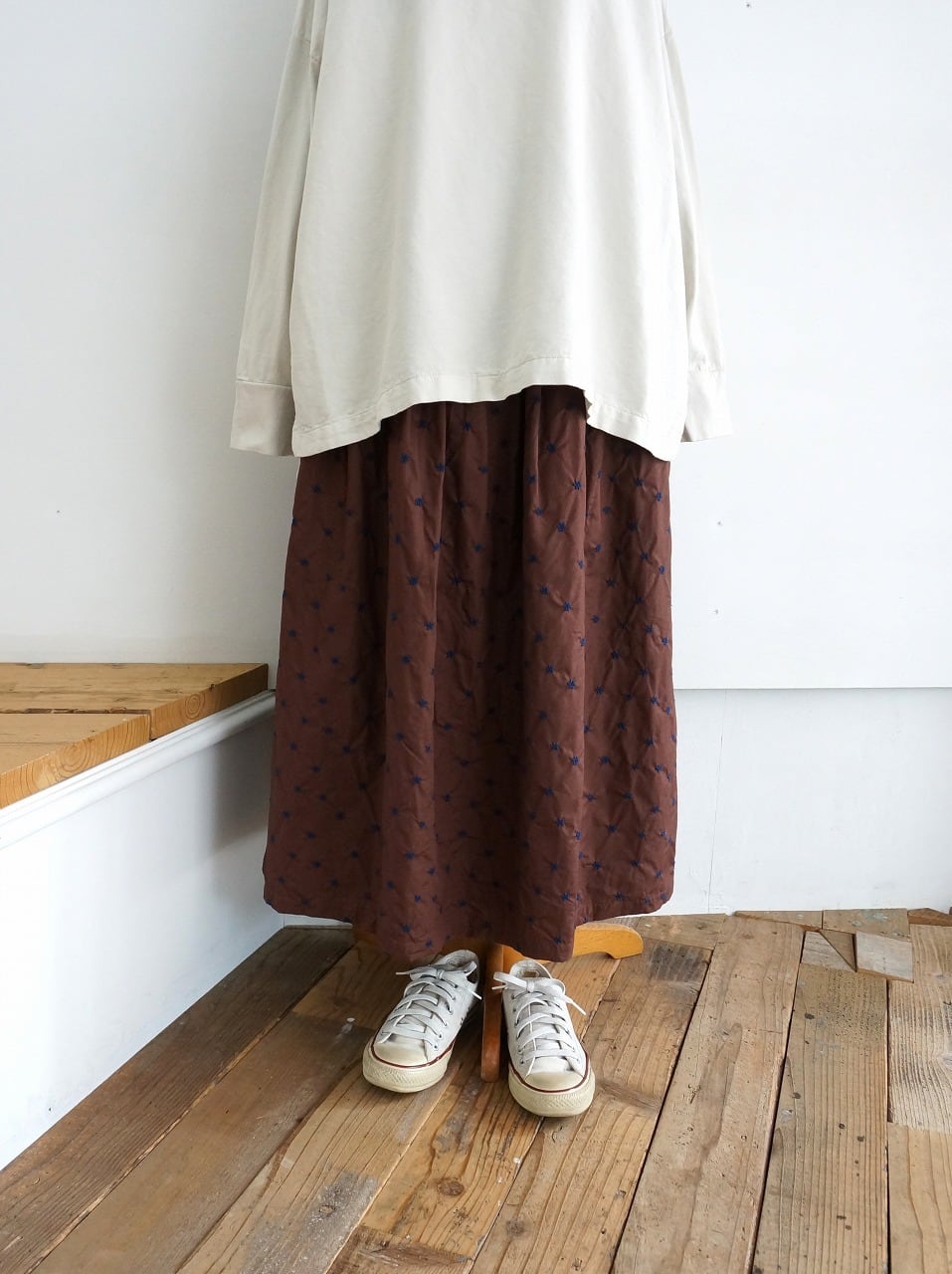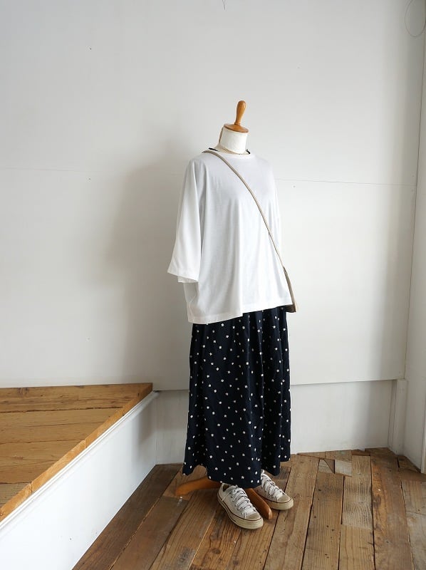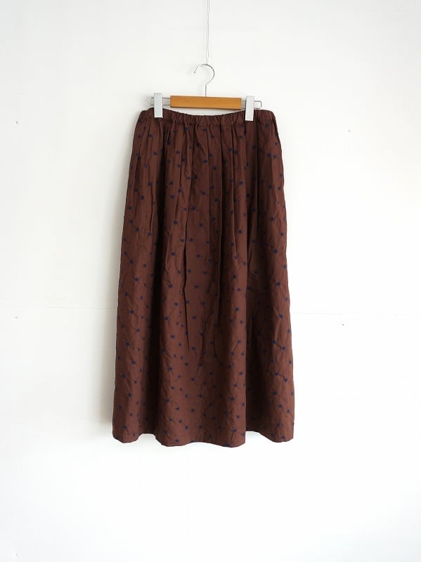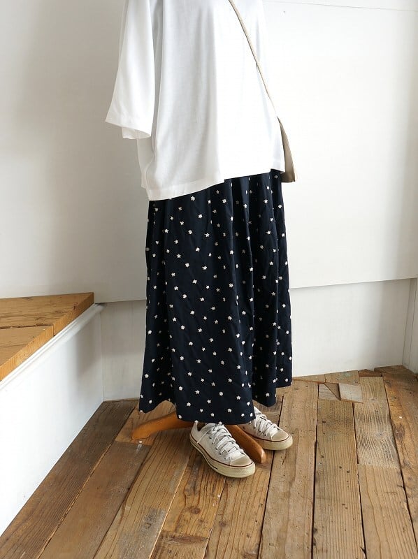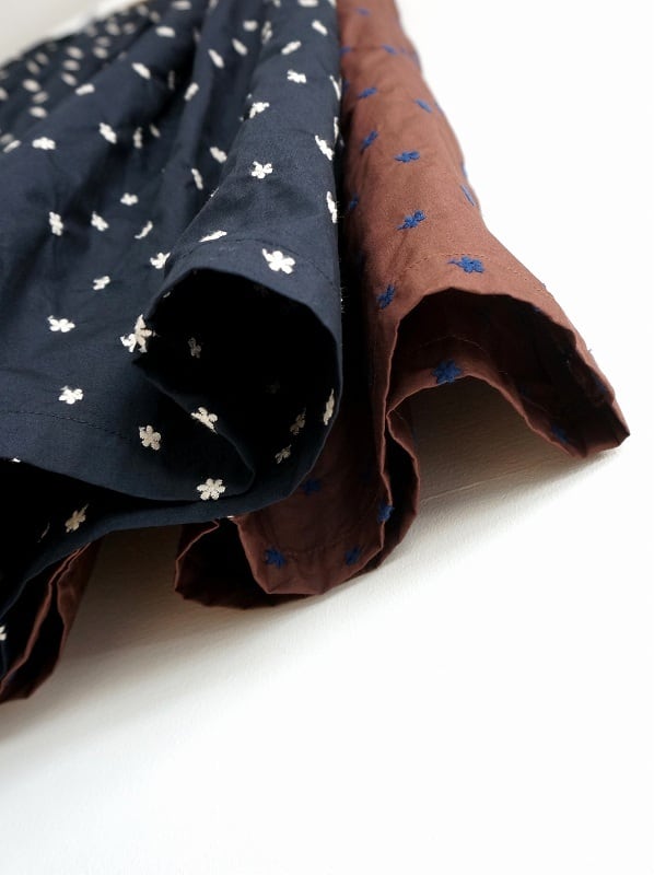 コーマブロードの生地に小さな花が刺しゅうされたナチュラルランドリーのオリジナル素材を使ったスカートです。製品洗いをすることでシボ感のある表情に仕上がっています。