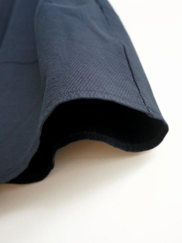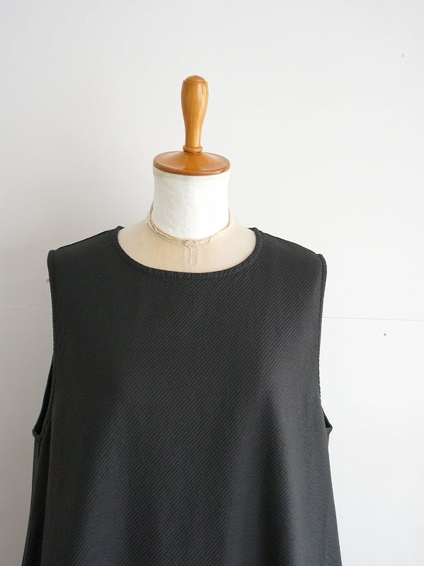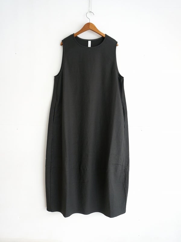綾の目に入った凹凸感が特徴の生地を使ったワンピース。丸首、ノースリーブのプルオーバータイプで、裾に切り替えをとってコクーンシルエットに仕上げています。