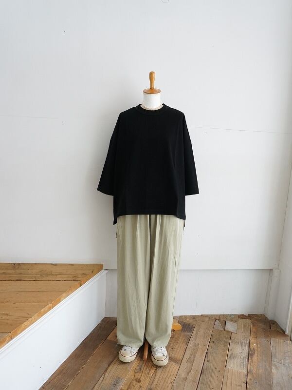 形はシンプル、ストンと落ちるワイドストレートのシルエット。トップスを選ばずに合わせやすく、ちょっとキレイめにもカジュアルにも組み合わせられる1本に仕上がっています。