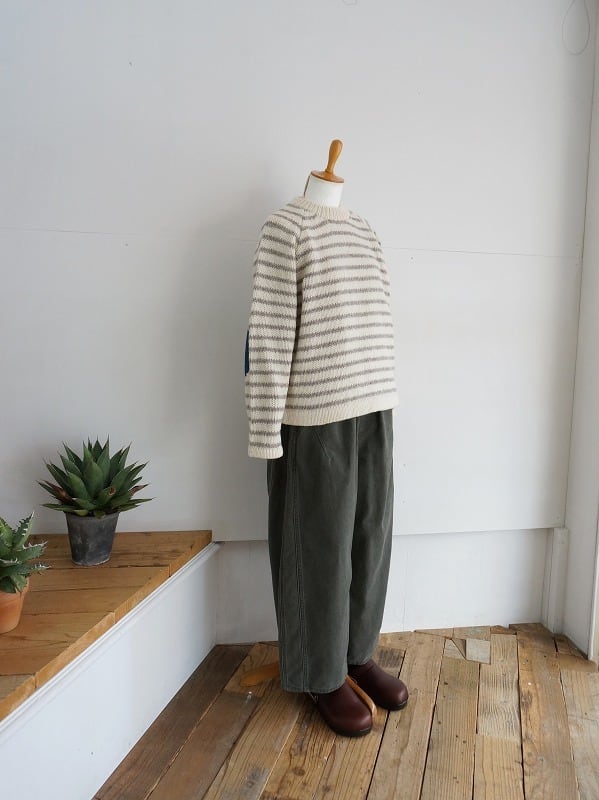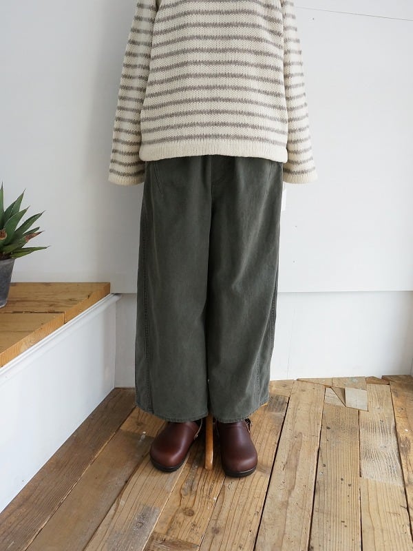 ウエストゴムのらくちんイージーパンツ仕様。ワタリに少しふくらみをとってまるみを持たせたコクーンシルエット。深めの股上、低めのバックポケット、抜け感のあるツムグならではのデザインになっています。レングスは8分から9分丈くらいの仕上がりです。