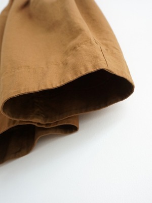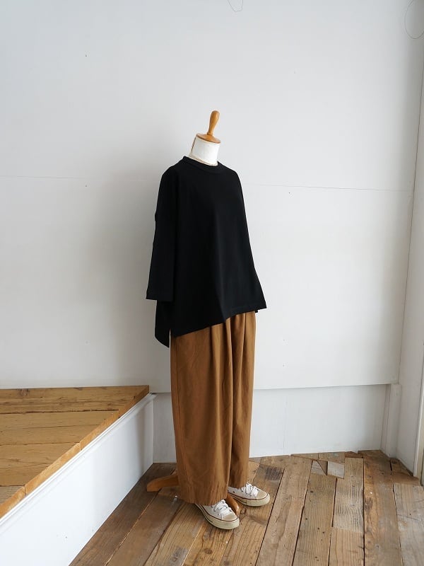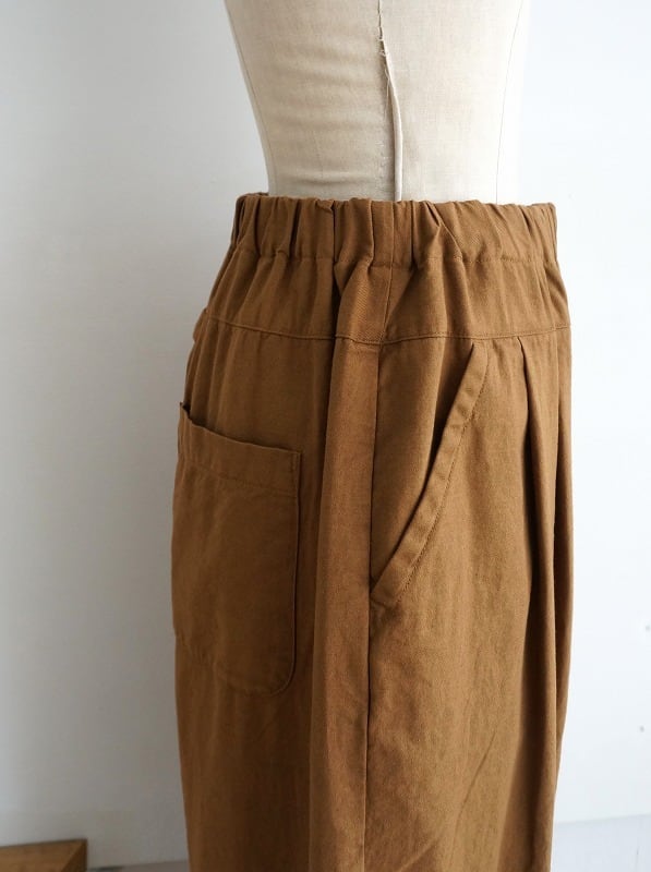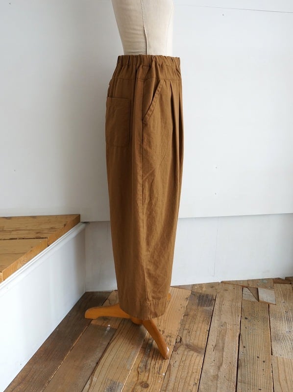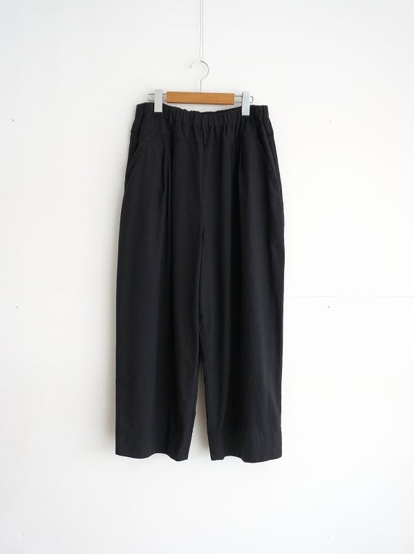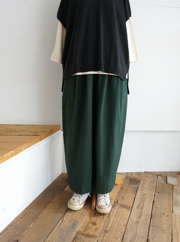 ウエストはゴム仕様、タックが入り収まりの良いウエストラインになっています。ちょっとボリュームがありながらも生地には落ち感があり、自然なドレープがきれい。ウール混じりのメランジ調の色合いもいい感じで、落ち着いた雰囲気でコーディネートしていただけます。