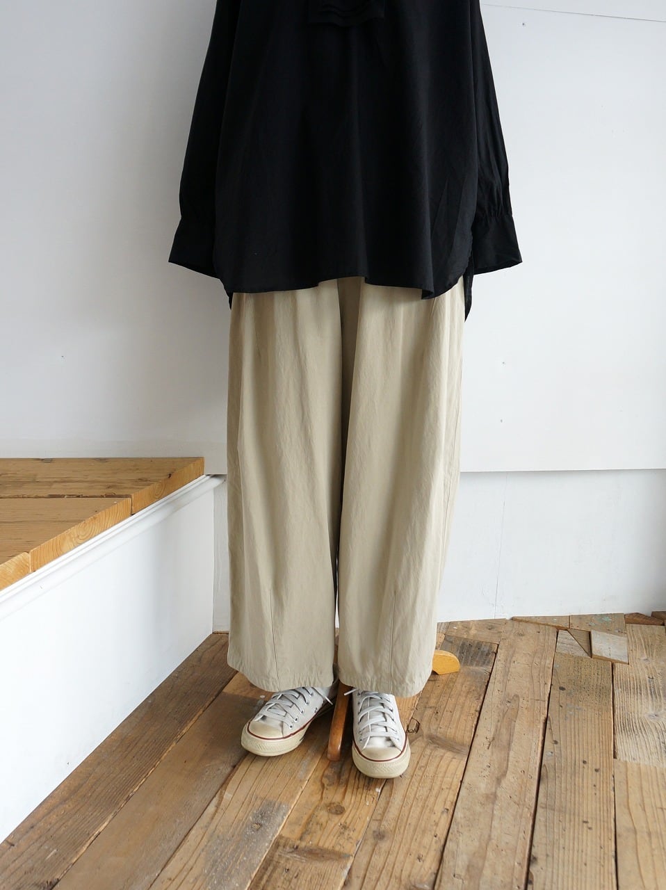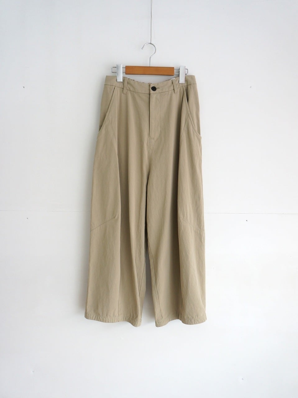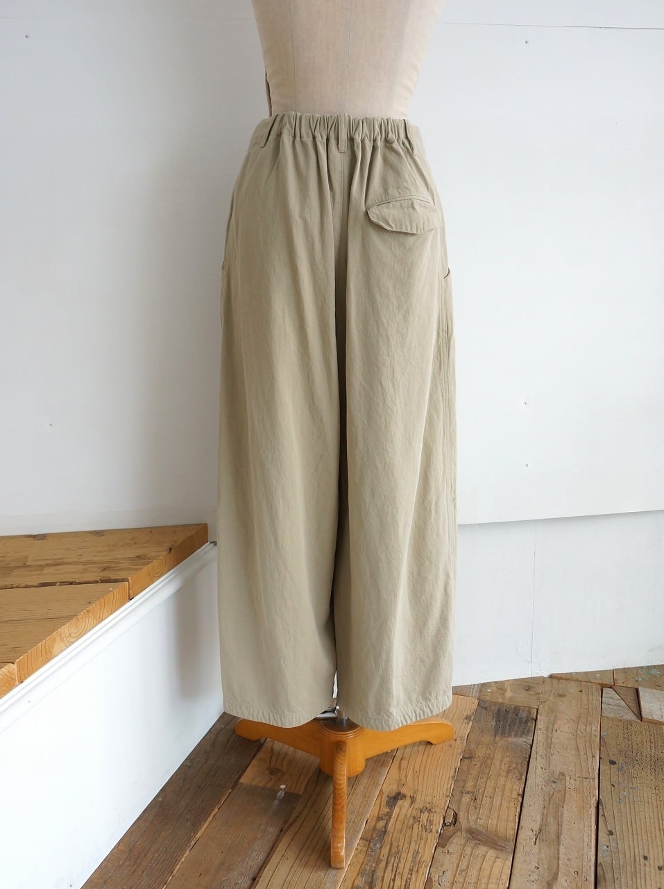 形は少し丸みを帯びたコクーンシルエット。裾とひざとポケット口に入ったダーツがパンツに自然な立体感をもたらして動きやすさがアップしています。ウエストは後ろ側がゴム仕様。さらっと穿けて、カジュアルな雰囲気の中にもきちんと感が備わった1本になっています。
