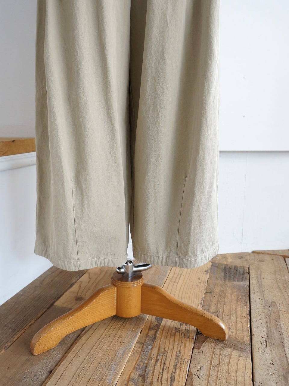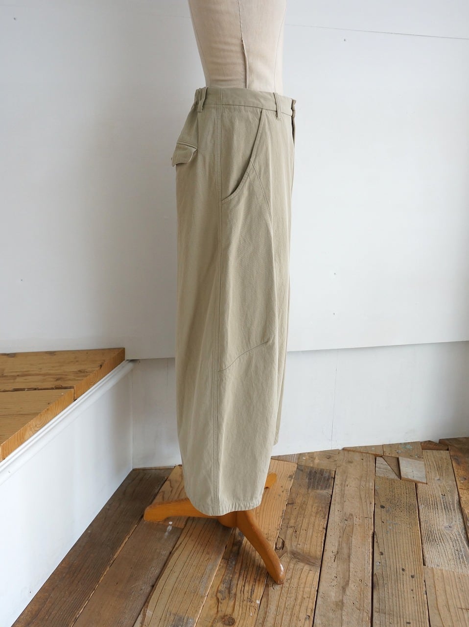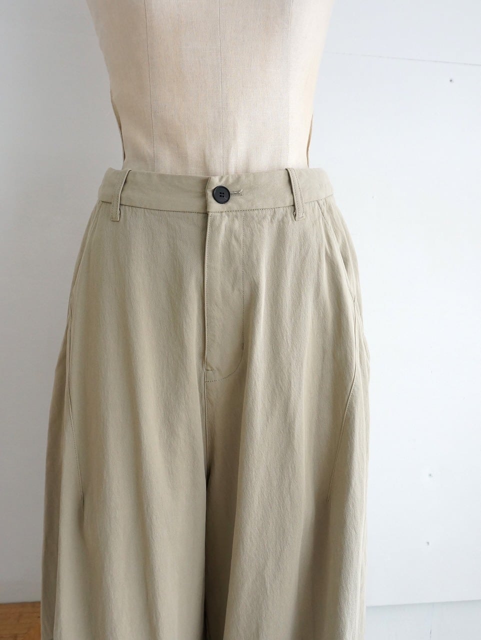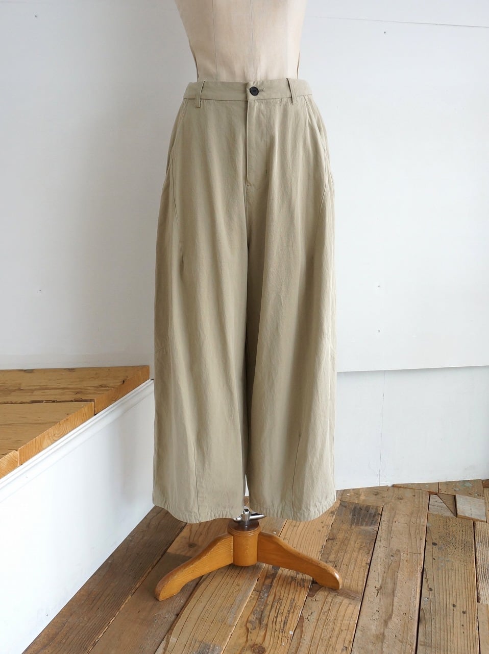 形は少し丸みを帯びたコクーンシルエット。裾とひざとポケット口に入ったダーツがパンツに自然な立体感をもたらして動きやすさがアップしています。ウエストは後ろ側がゴム仕様。さらっと穿けて、カジュアルな雰囲気の中にもきちんと感が備わった1本になっています。