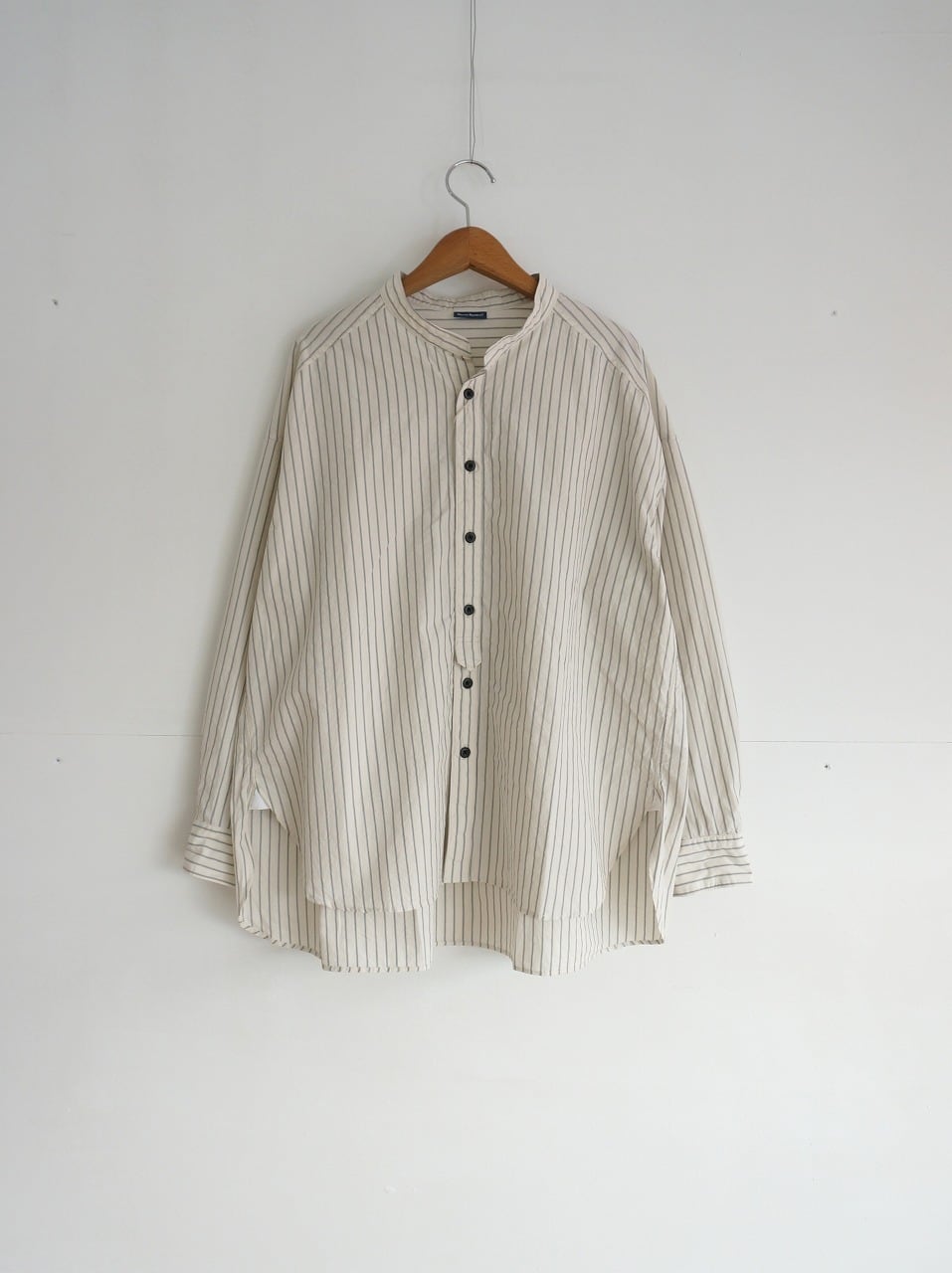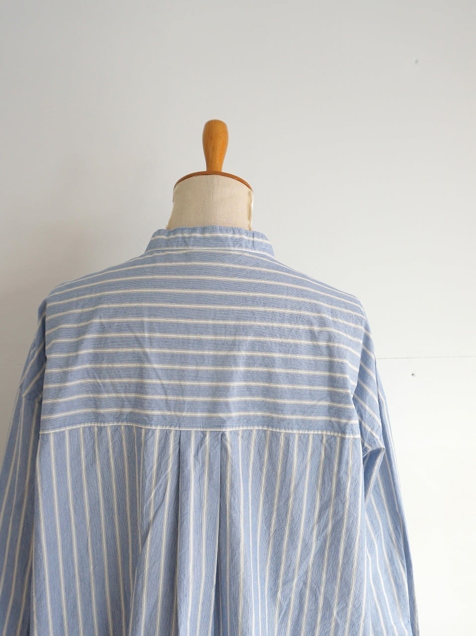 ストライプのタイプライター素材をダブルワッシャー加工でふっくら仕上げています。立体感のあるワイドシルエットのシャツです。