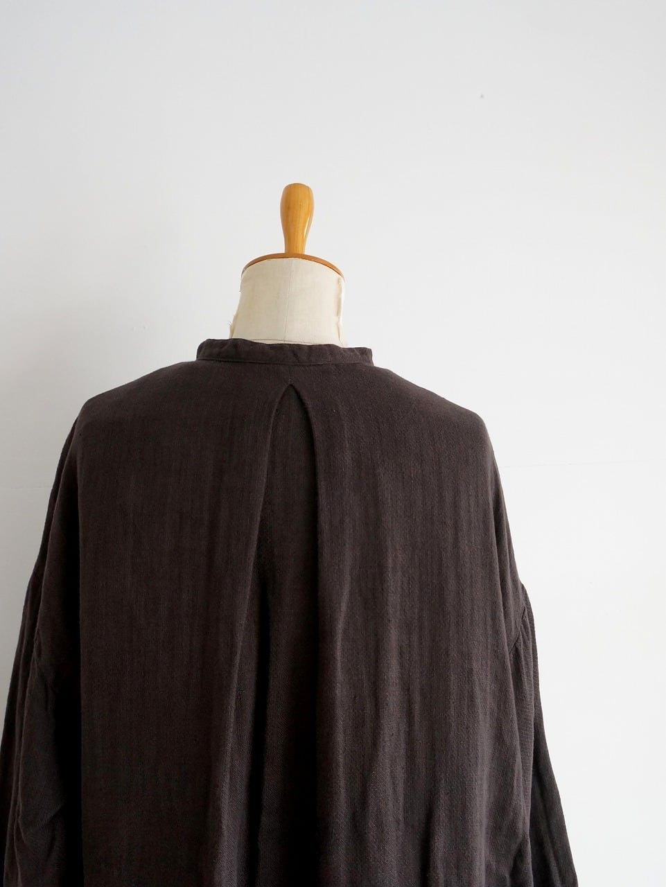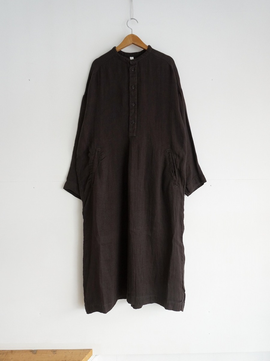フレンチリネンで織り上げた、ざっくりとした表情が特徴的なドビークロスを使用しています。プルオーバータイプのスタンドカラーワンピースです。