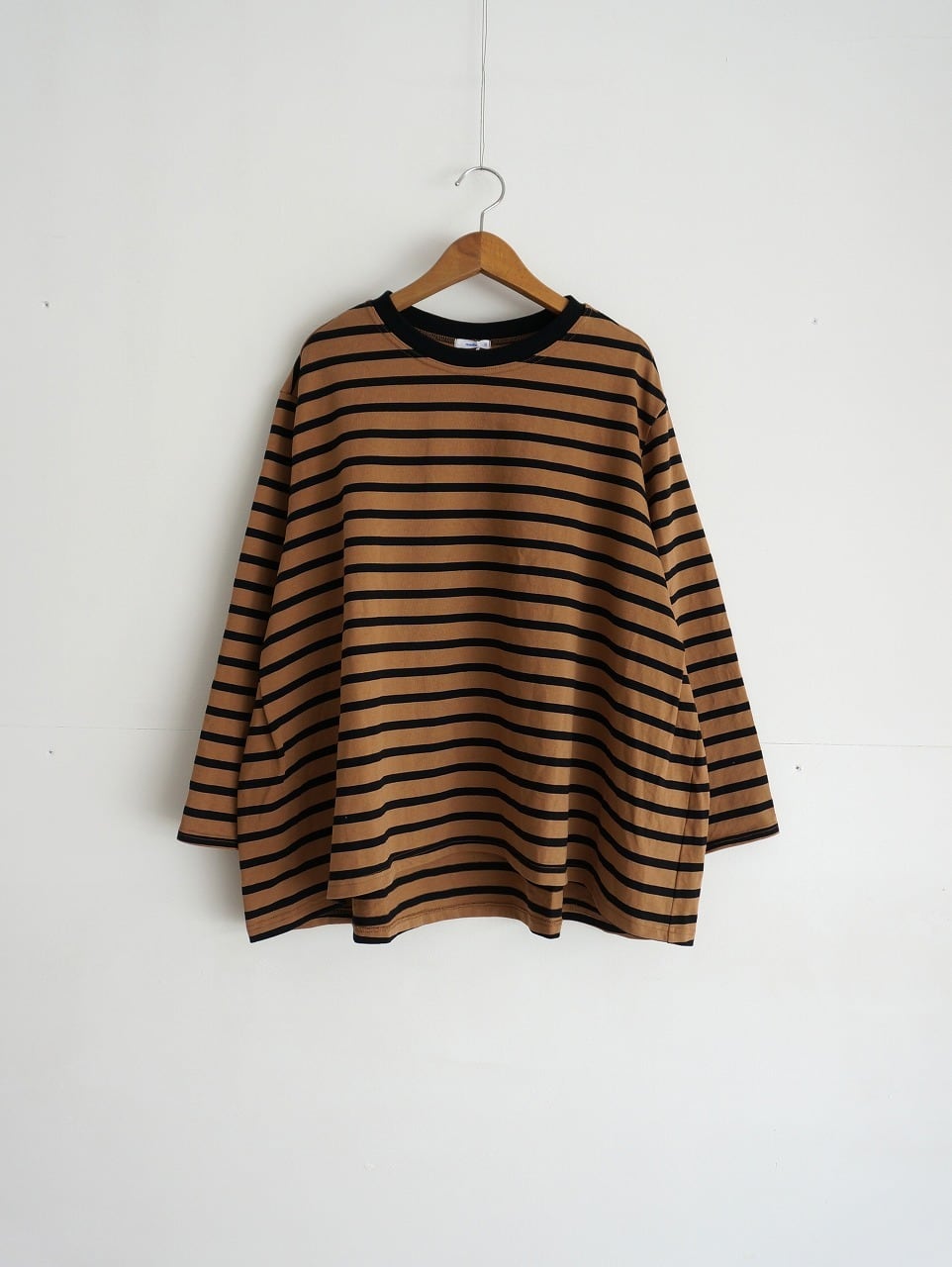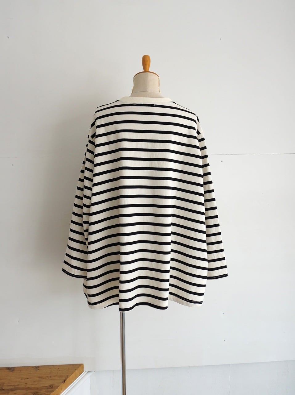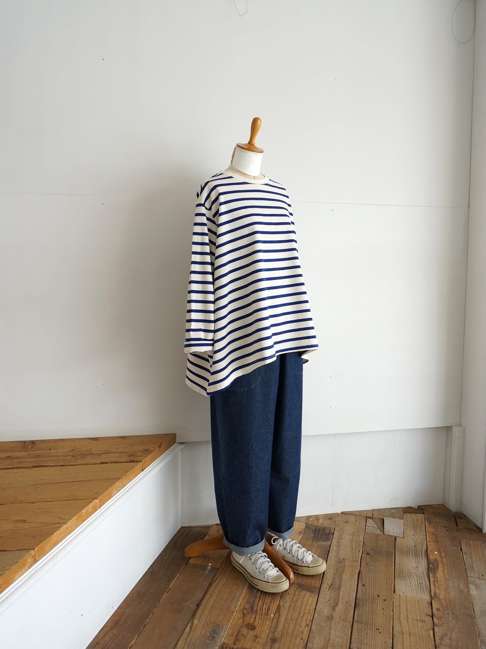 度詰めで編みたてられた天竺ボーダー。程よい厚みで張りがあり、ドライなタッチの生地感です。