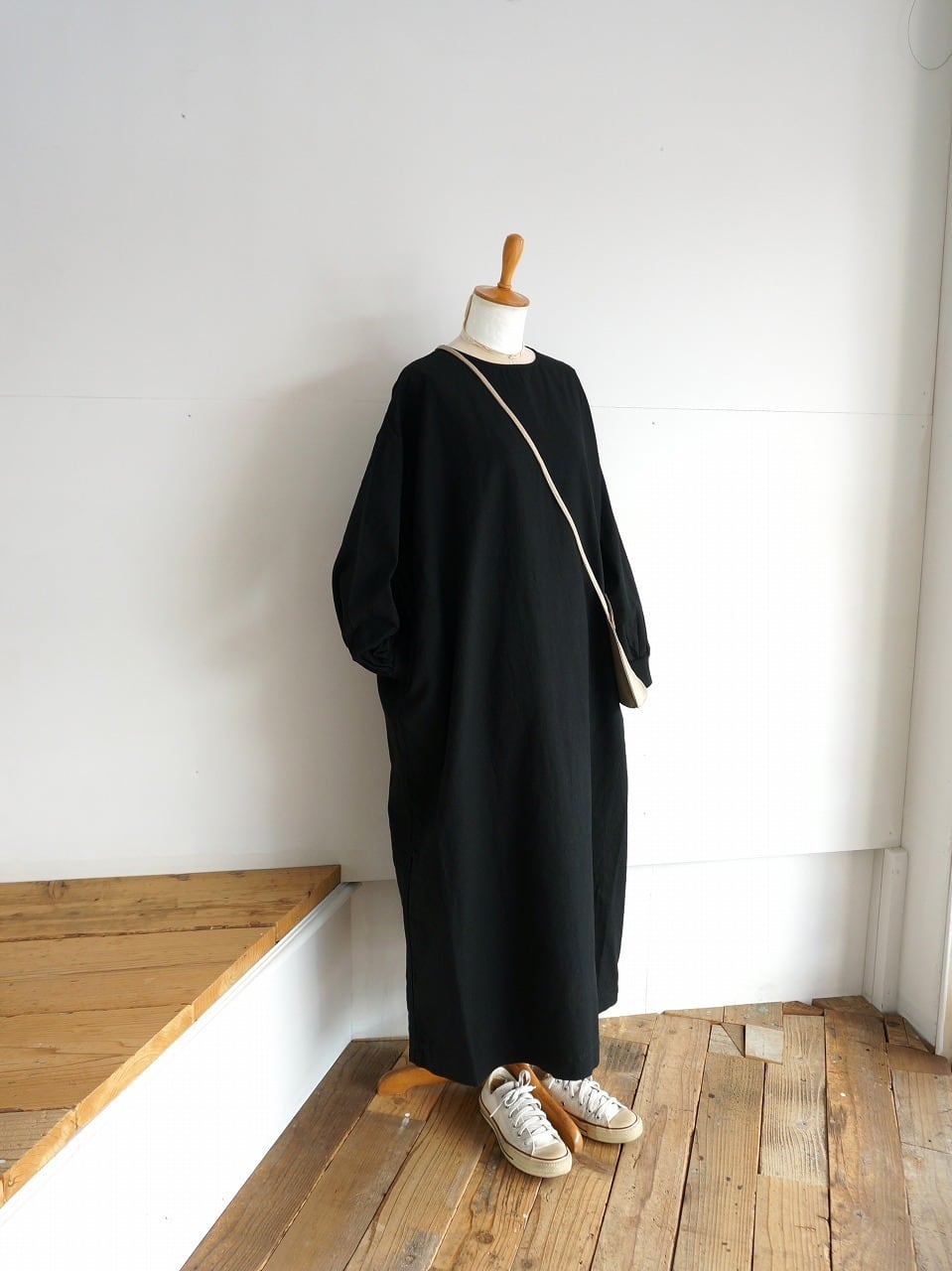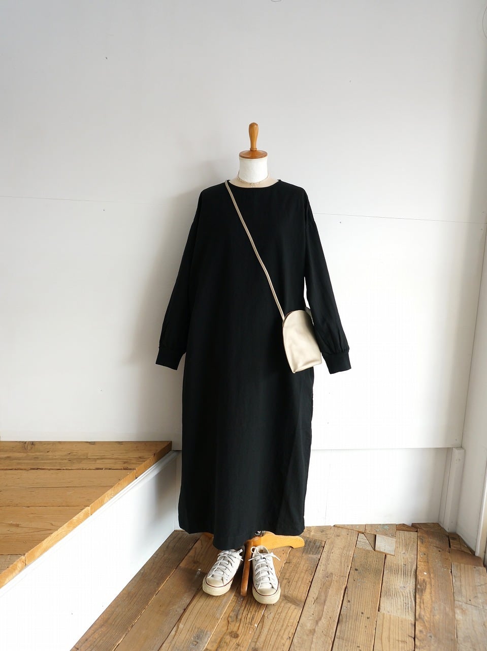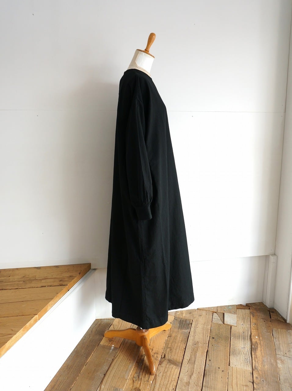 裾にかけてストンとしたシルエットのワンピースです。身頃には程よくゆとりがあり、すっぽり着られる形。袖口にはリブが付き、サイドには便利なシームポケットが配置されています。