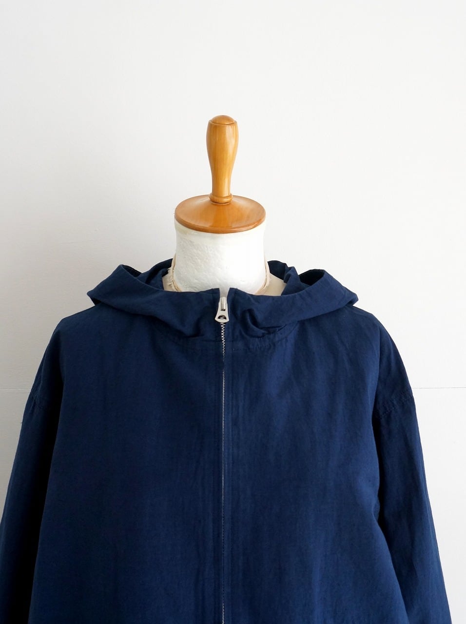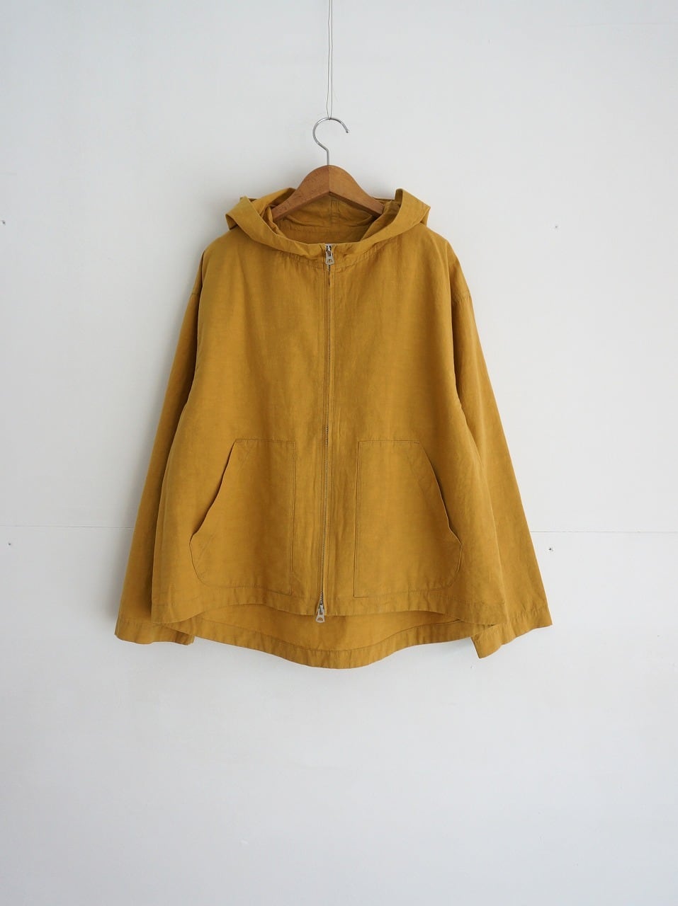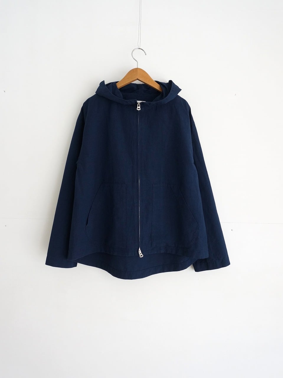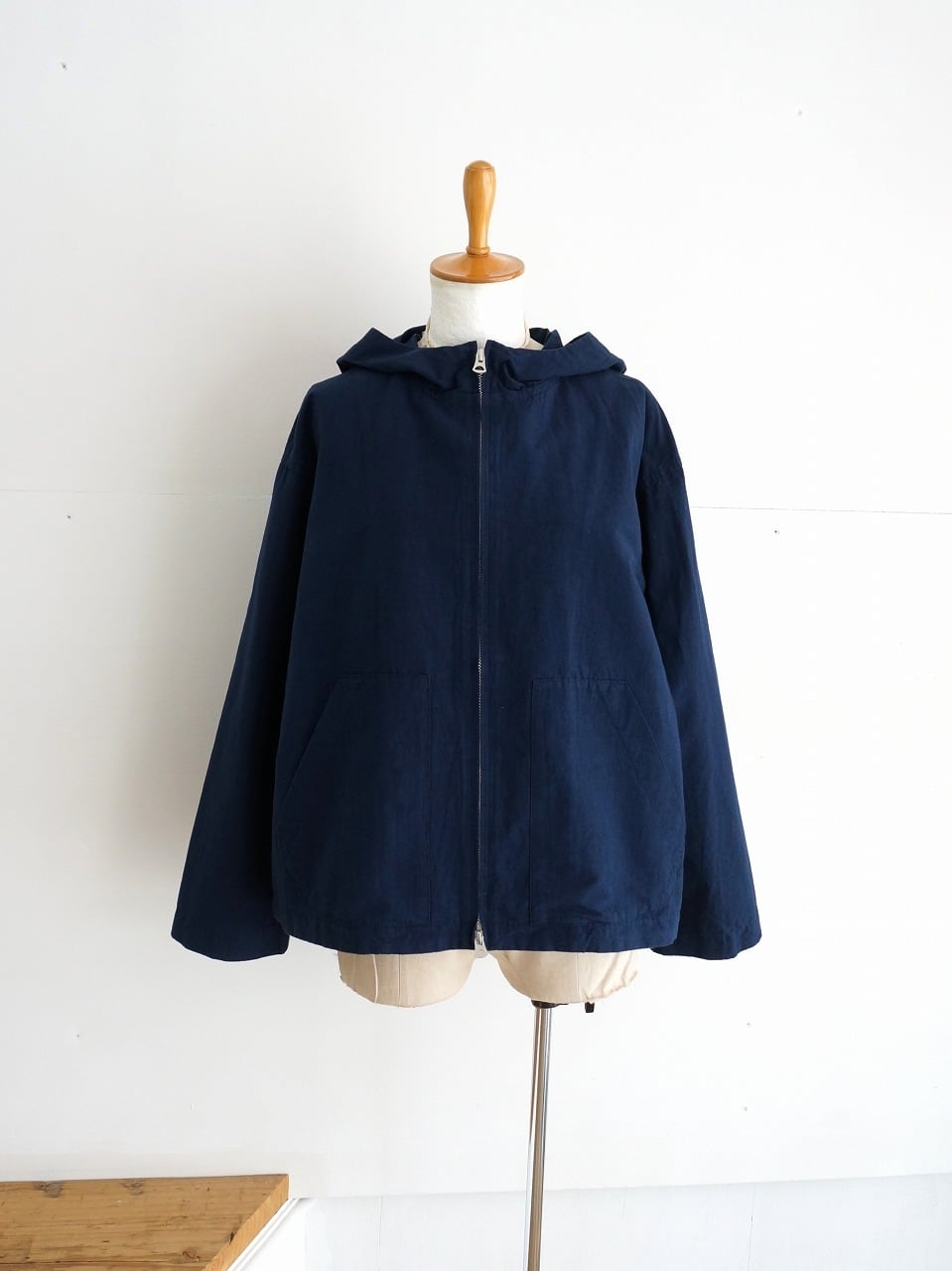 程よく張りのある中肉厚の生地を使ったフード付きブルゾン。フロントはダブルジップ、ゆるやかなAラインのシルエットです。