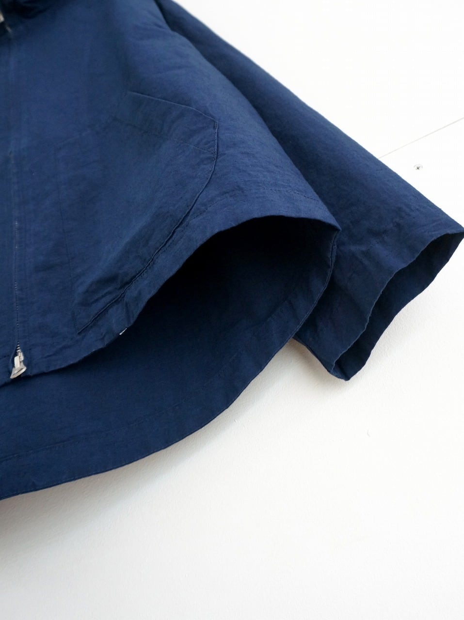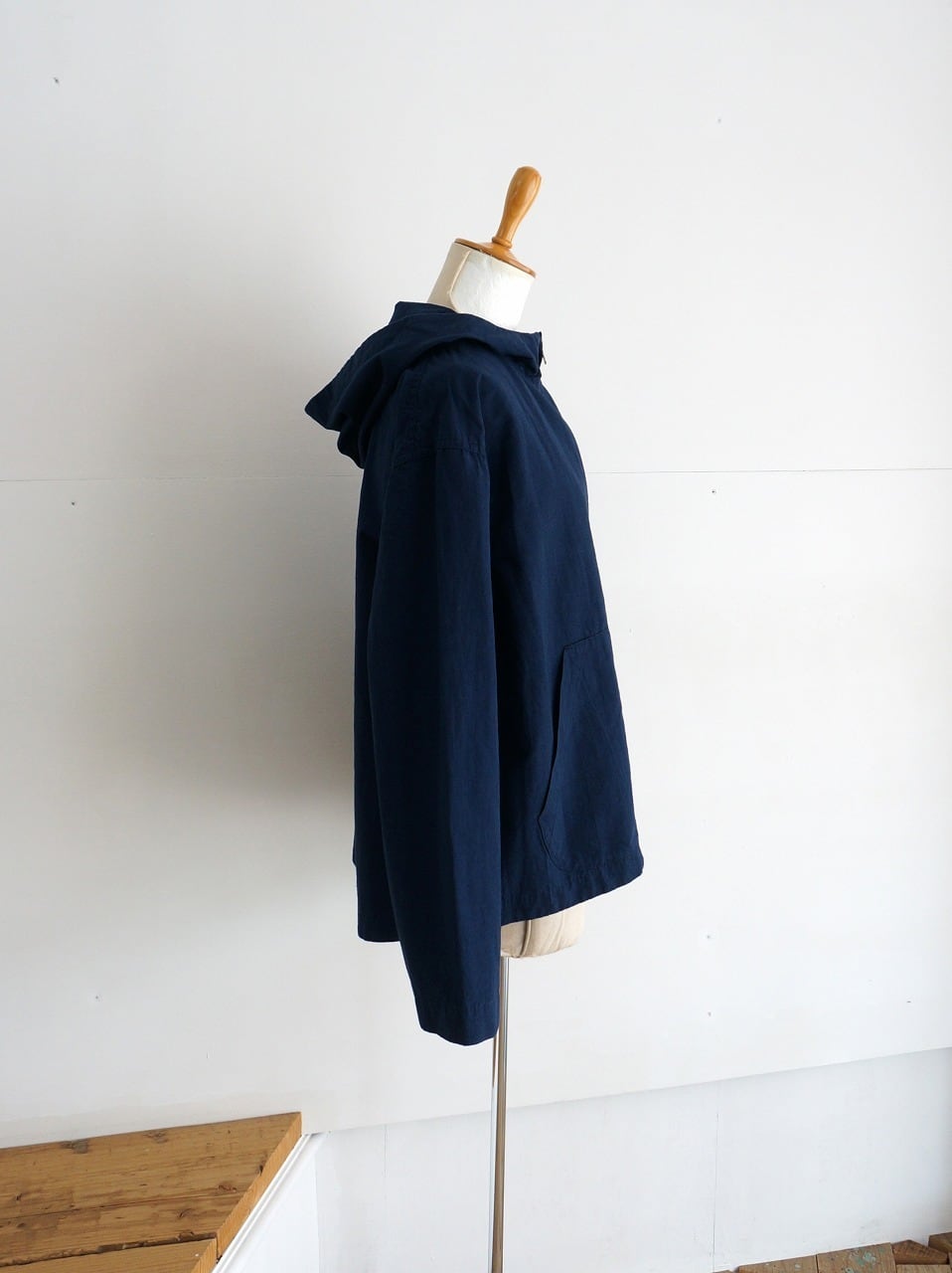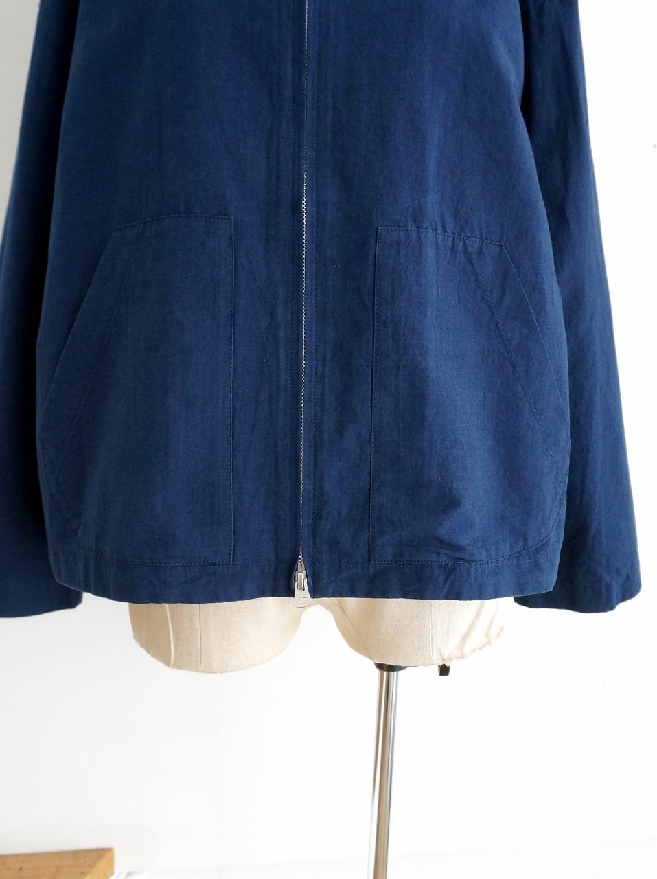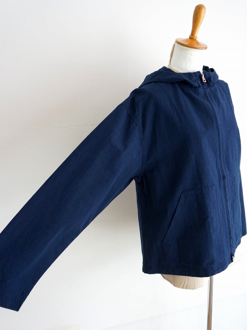 程よく張りのある中肉厚の生地を使ったフード付きブルゾン。フロントはダブルジップ、ゆるやかなAラインのシルエットです。