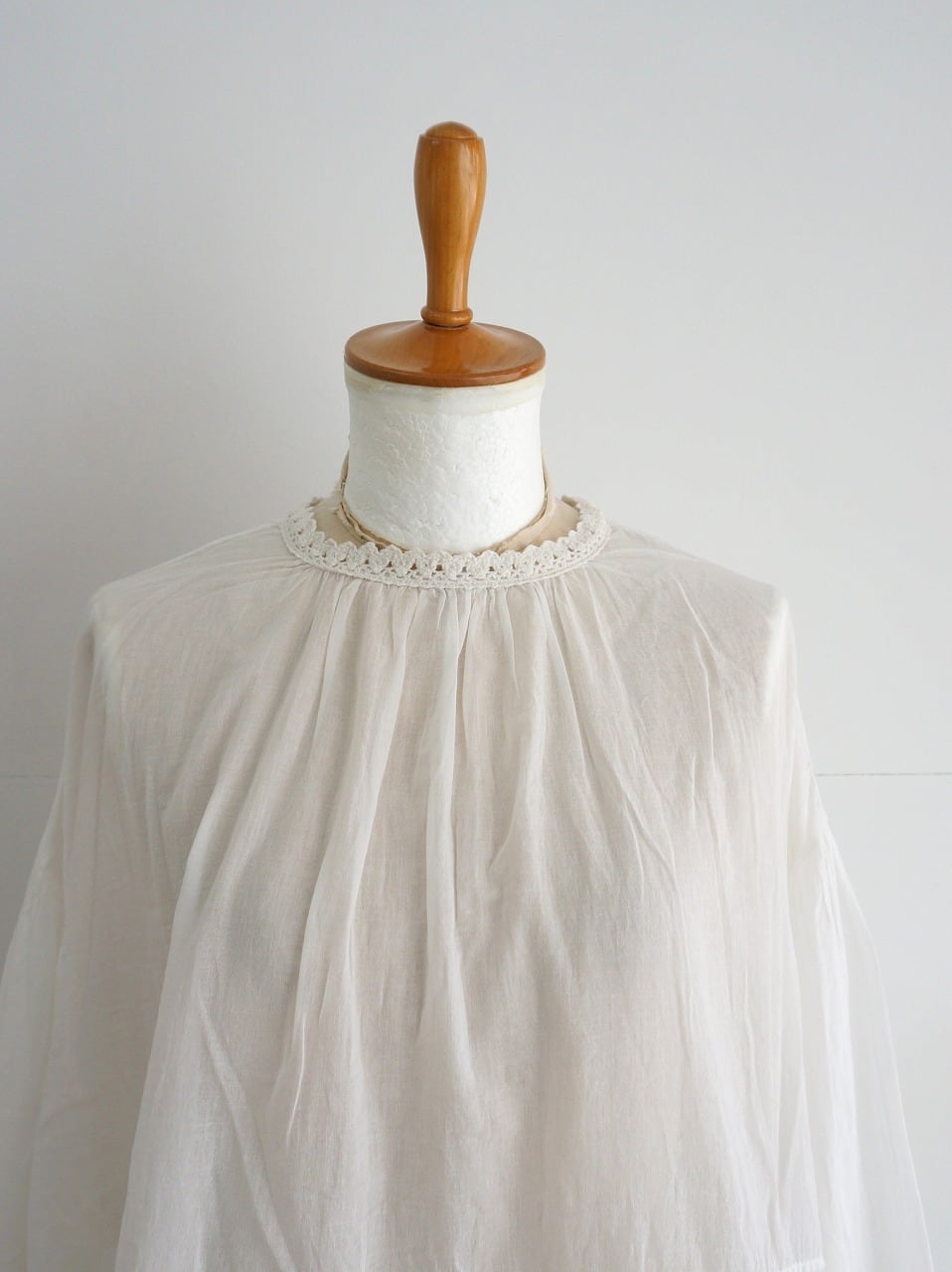 首回り、裾、袖口にレースをあしらい、さらにフリルやタックも施したデザイン。ふわっとした軽い素材感が雰囲気を持たせてくれます。ゆるやかに着られるサイズ感なので合わせ方はいろいろ。年間通して長く着回しに使っていただけます。