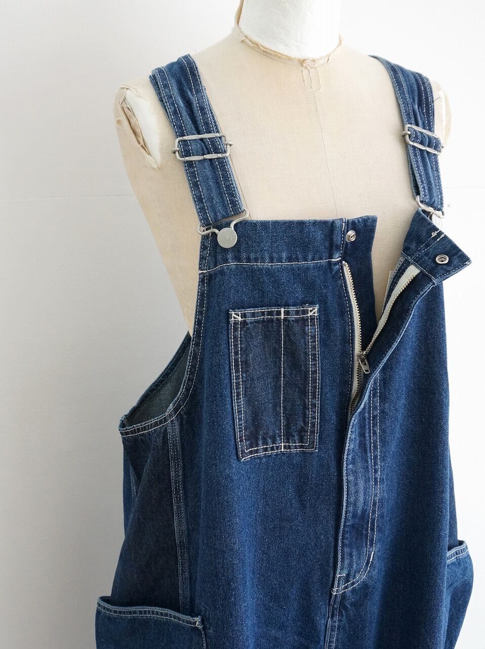 前身頃はジッパーで開閉できて、丈は肩ひもで調節可能。フェード感のあるインディゴブルーの色合いも雰囲気が出ていい感じ。やわらかくなじんだ風合いで、通年で着られる質感になっています。