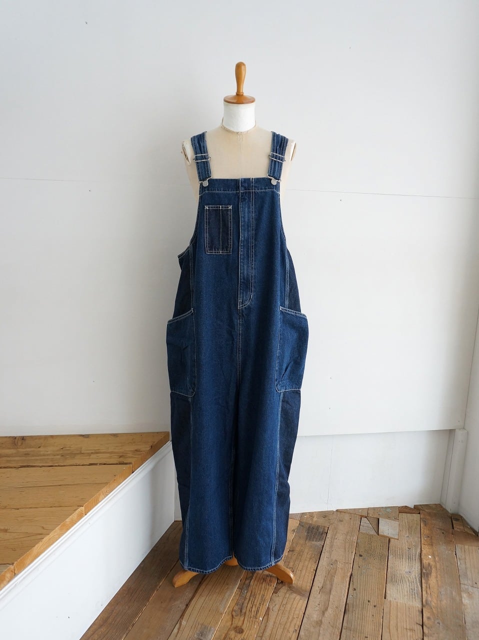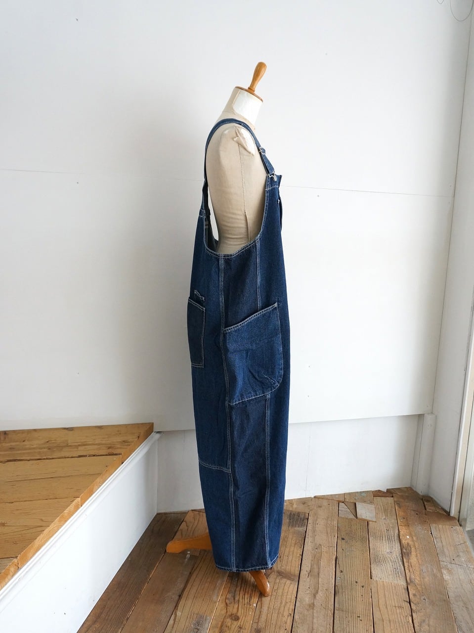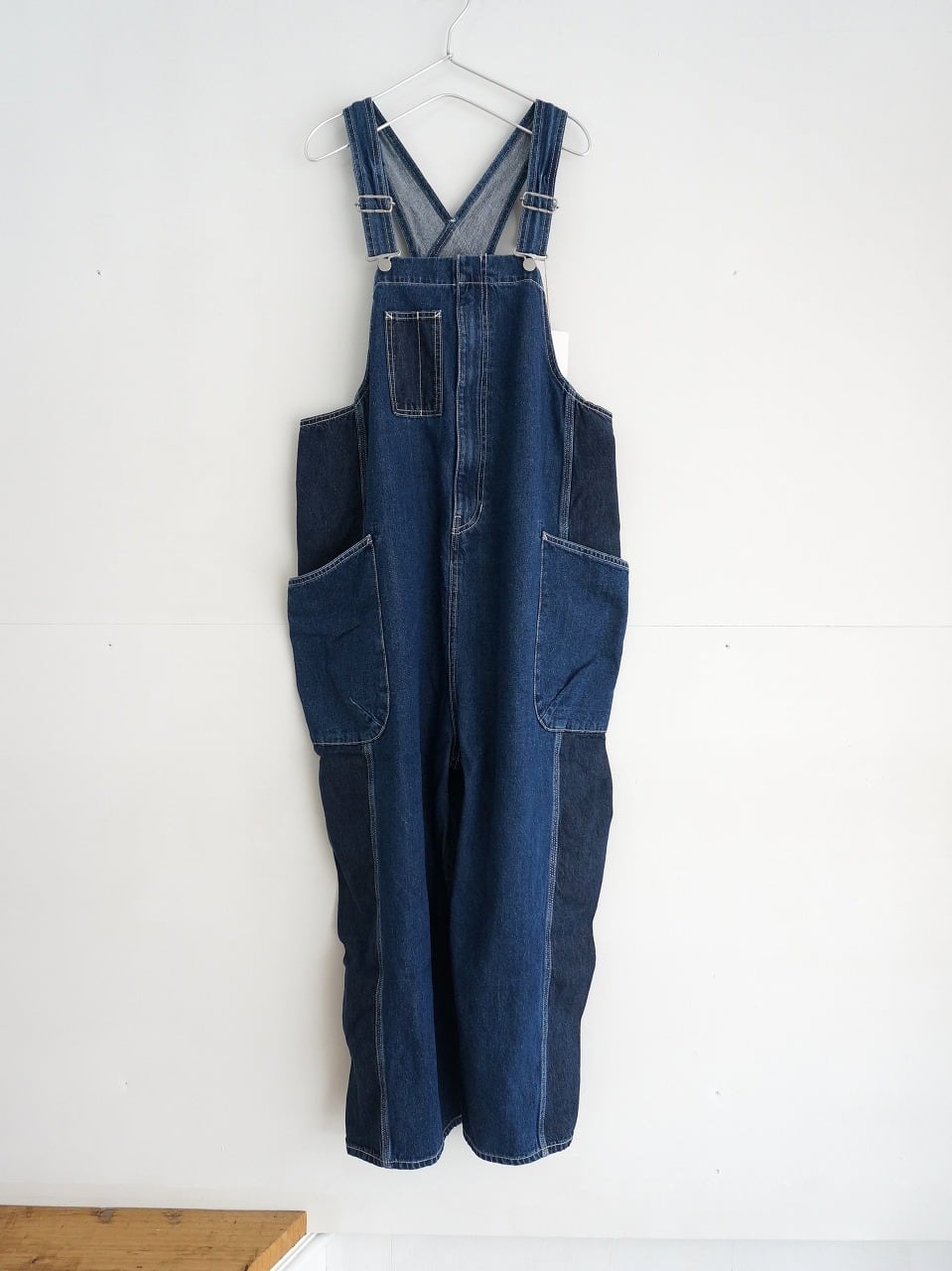 10ozデニムを使用したサロペットです。両サイドと胸と後ろポケットの別地使いがポイント。色の濃淡がアクセントになった一枚です。