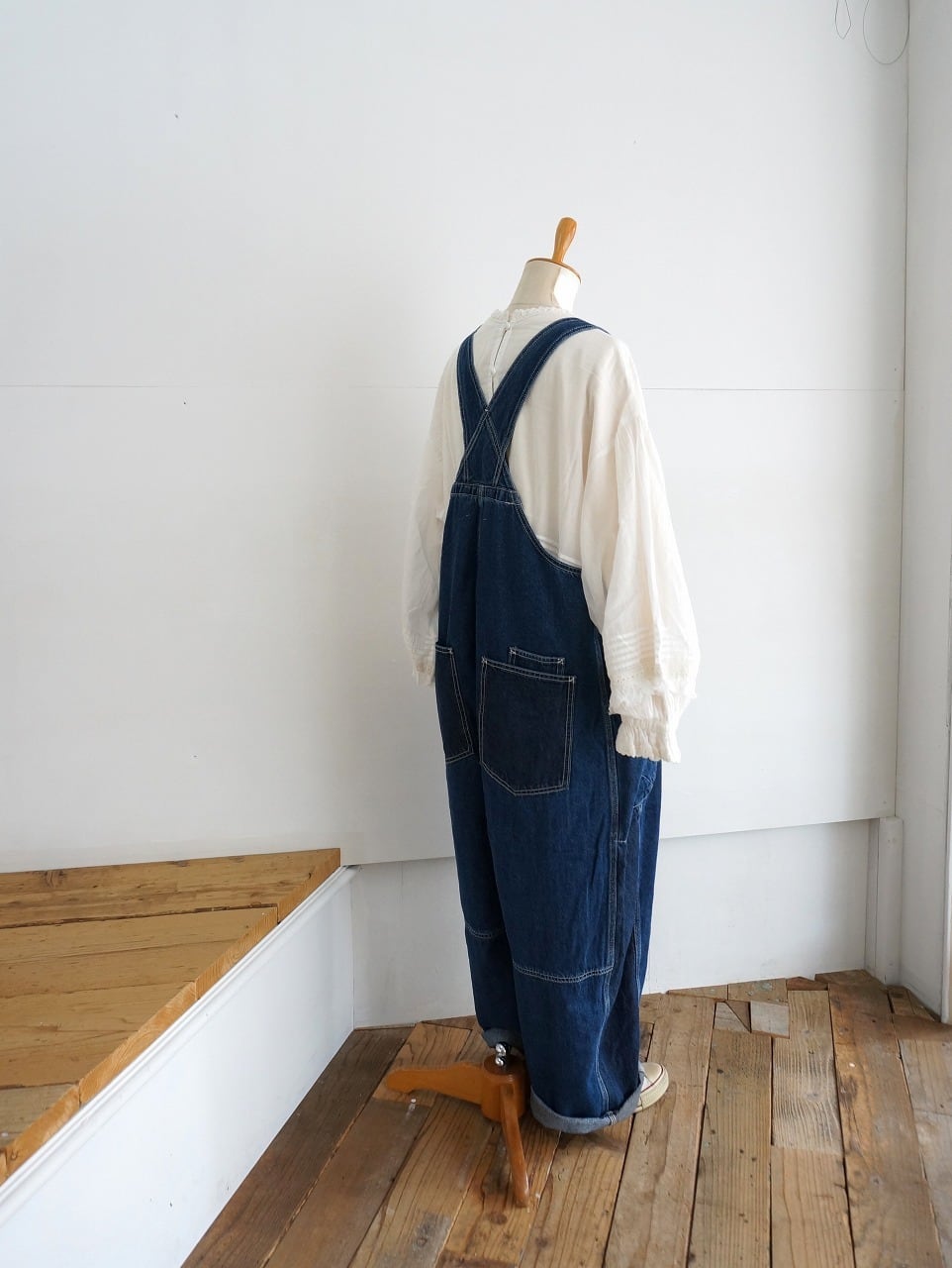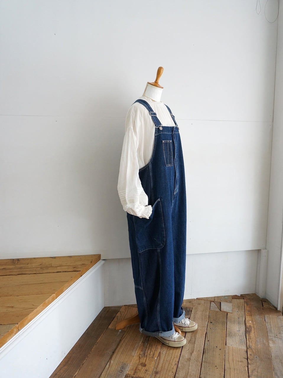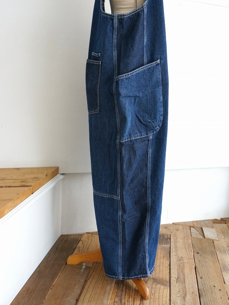 10ozデニムを使用したサロペットです。両サイドと胸と後ろポケットの別地使いがポイント。色の濃淡がアクセントになった一枚です。