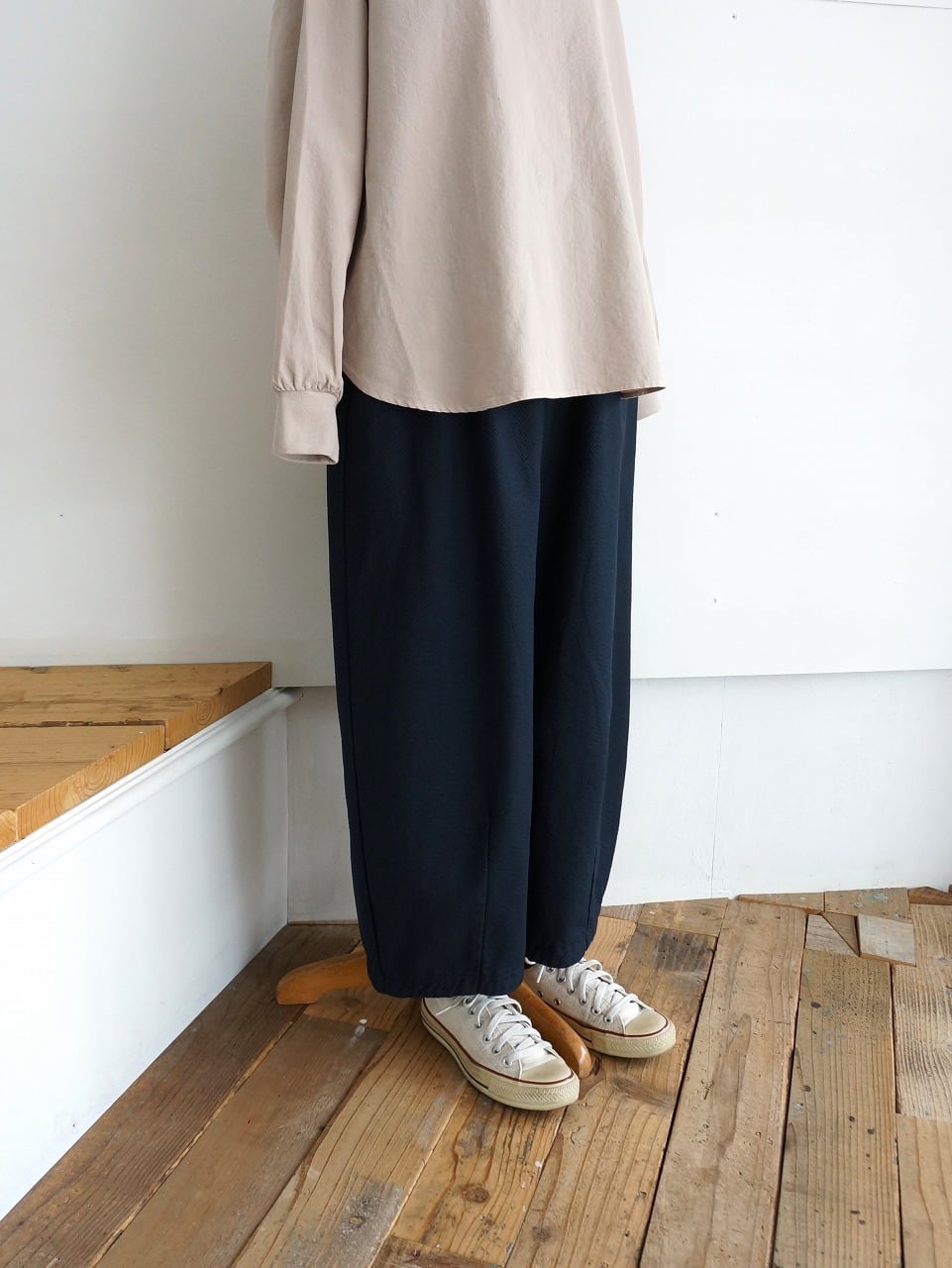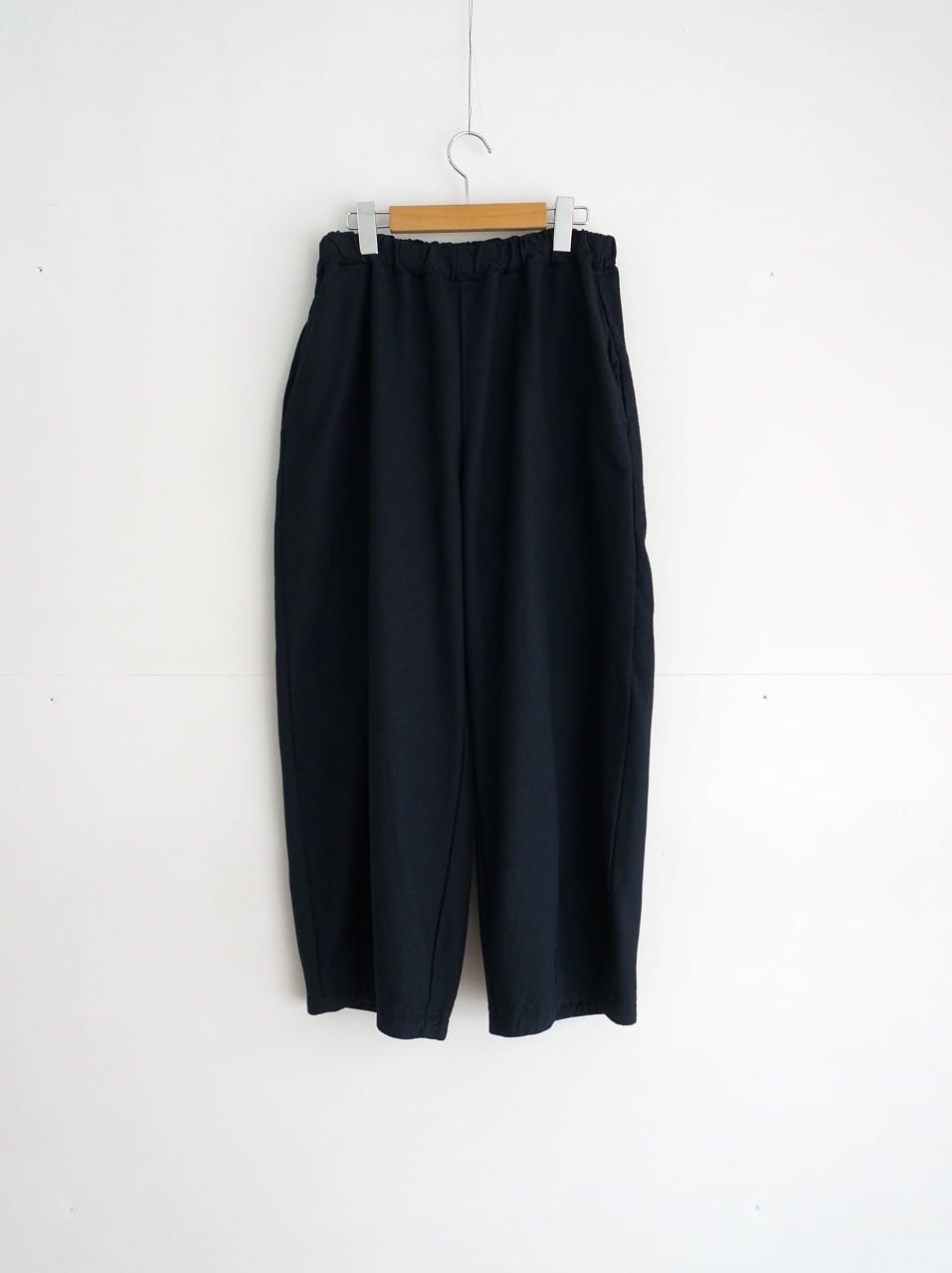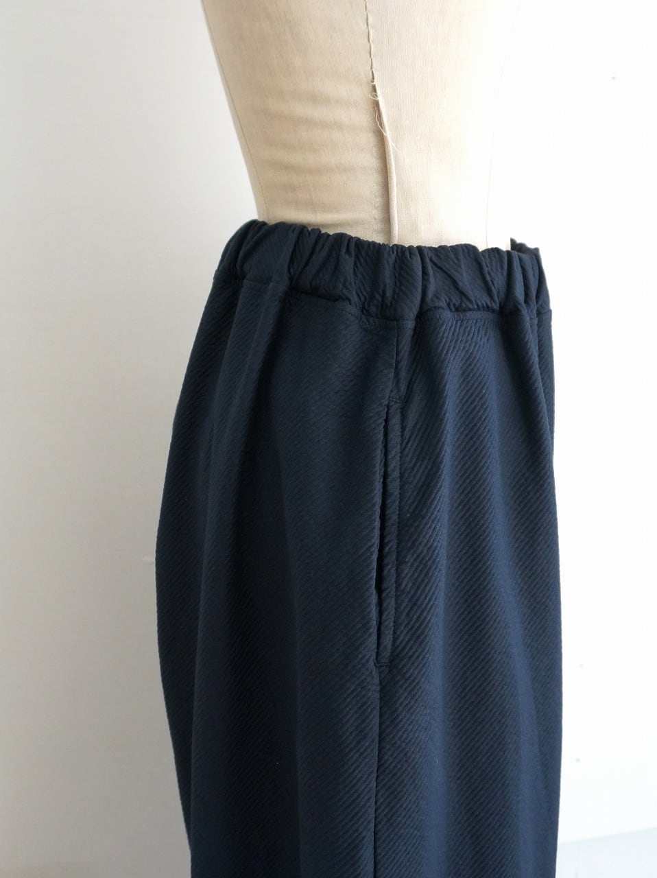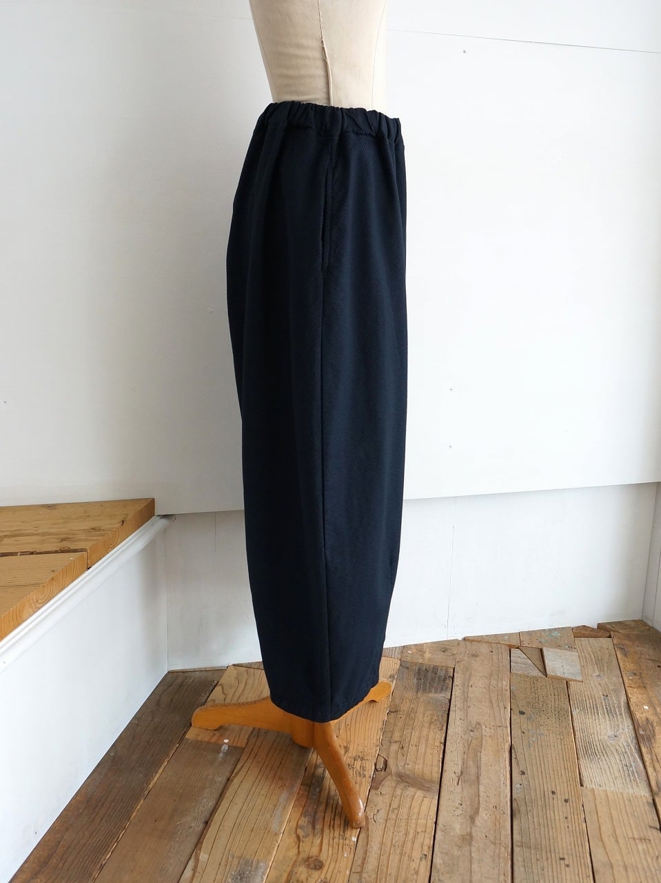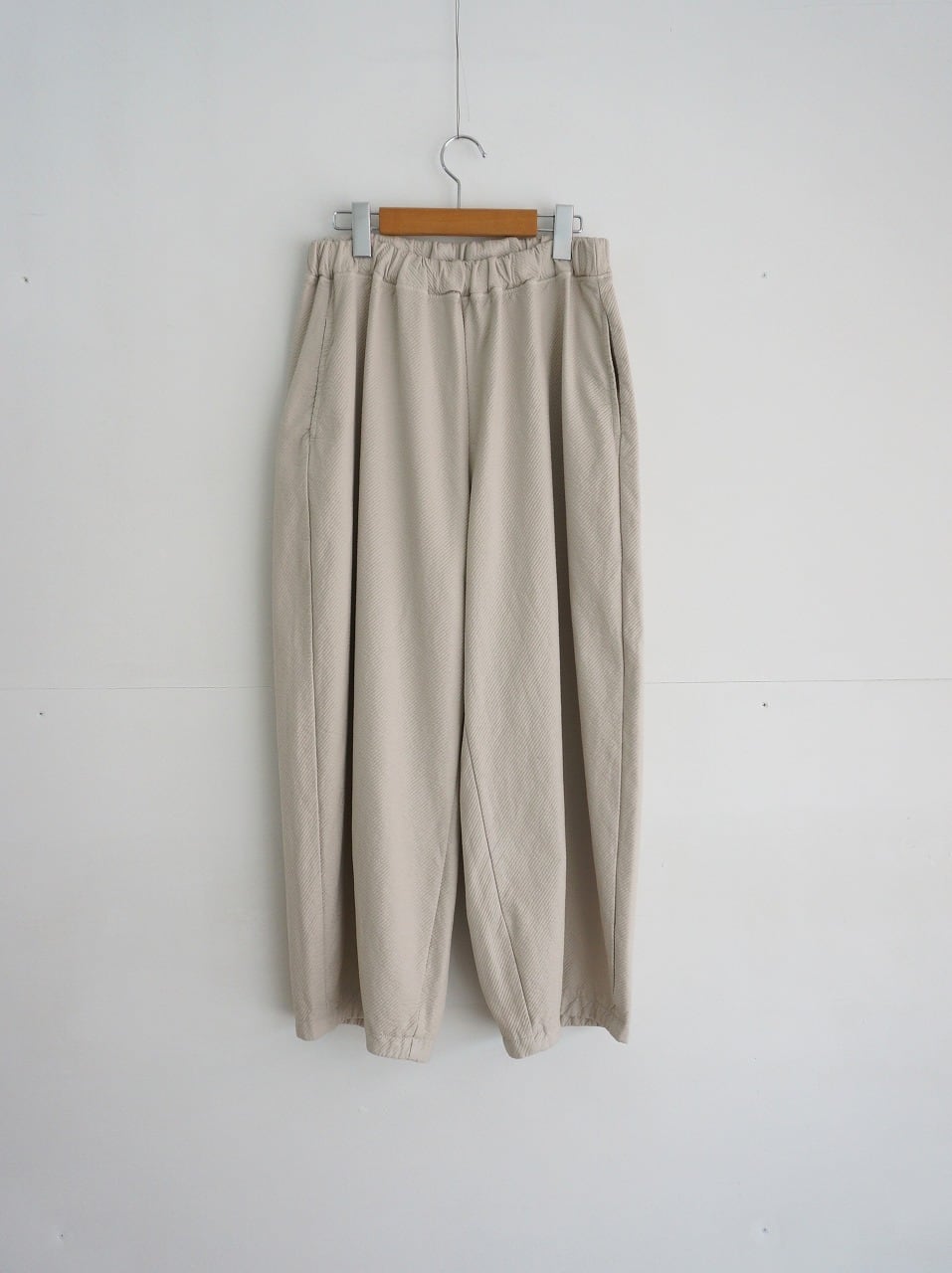 腰周りにゆとりを持たせ、裾にダーツを入れたまるみのあるシルエット。生地には程よく張りがあり、適度なボリューム感をキープ。カットソーなのでフィット感もよく、ラクチンに穿いていただけます。