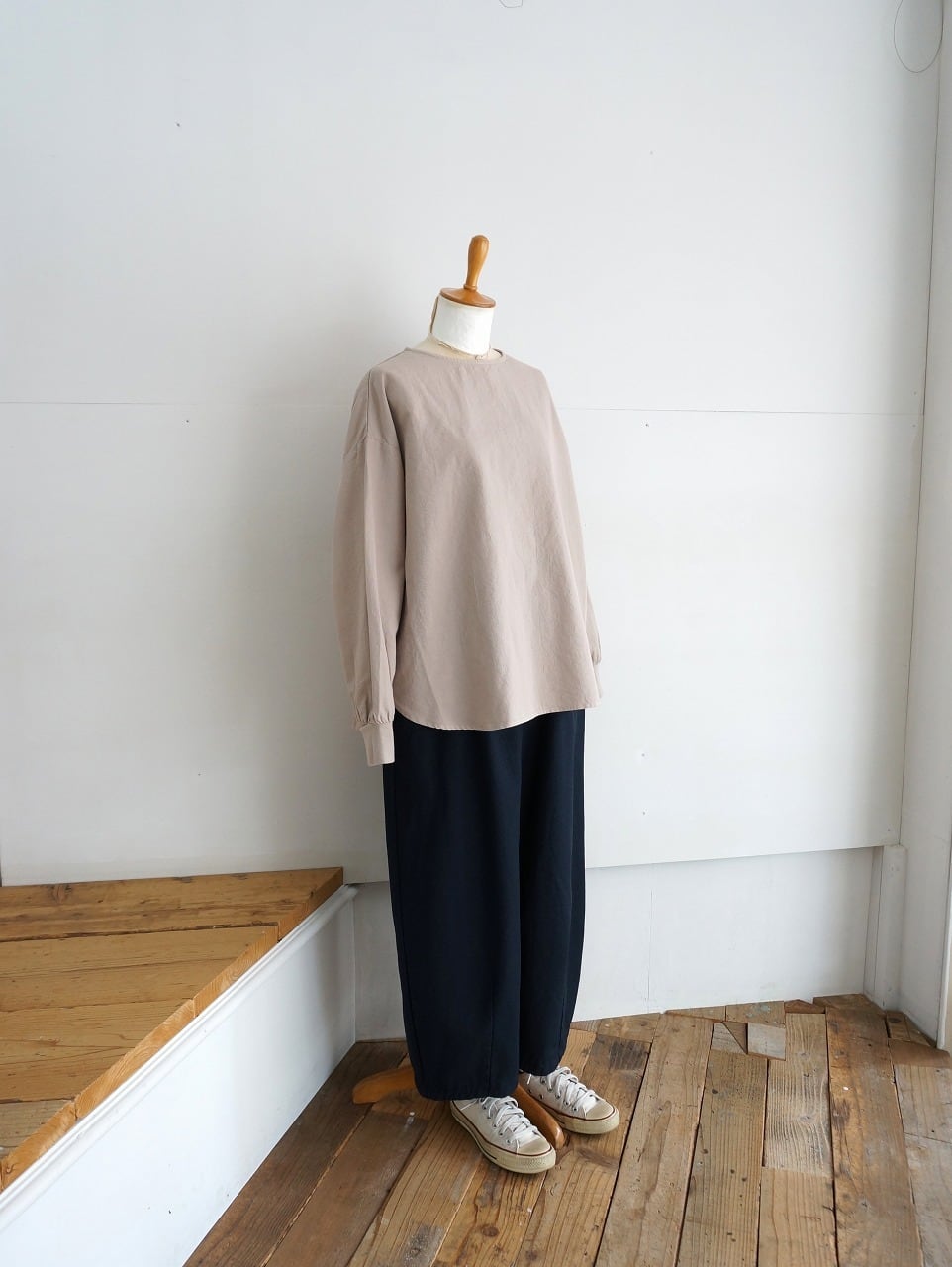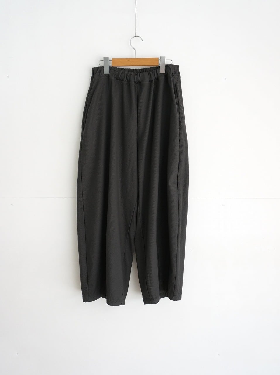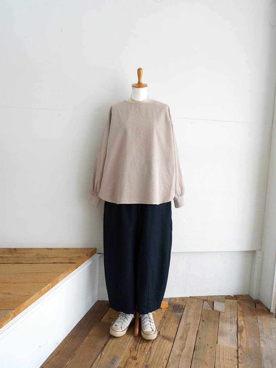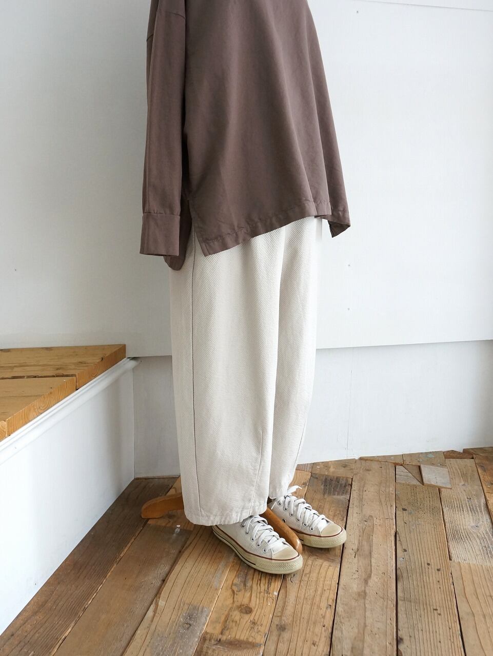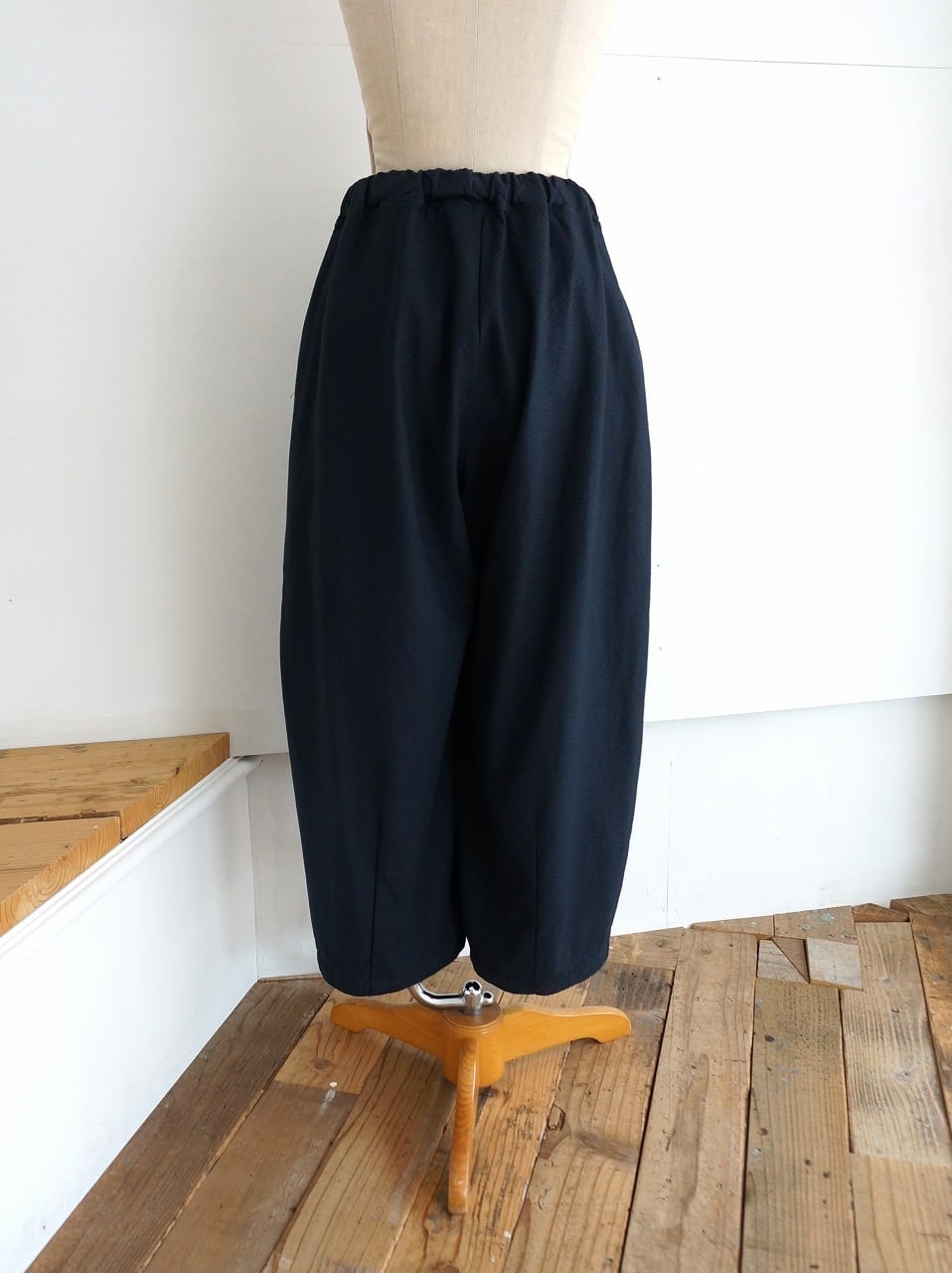 腰周りにゆとりを持たせ、裾にダーツを入れたまるみのあるシルエット。生地には程よく張りがあり、適度なボリューム感をキープ。カットソーなのでフィット感もよく、ラクチンに穿いていただけます。