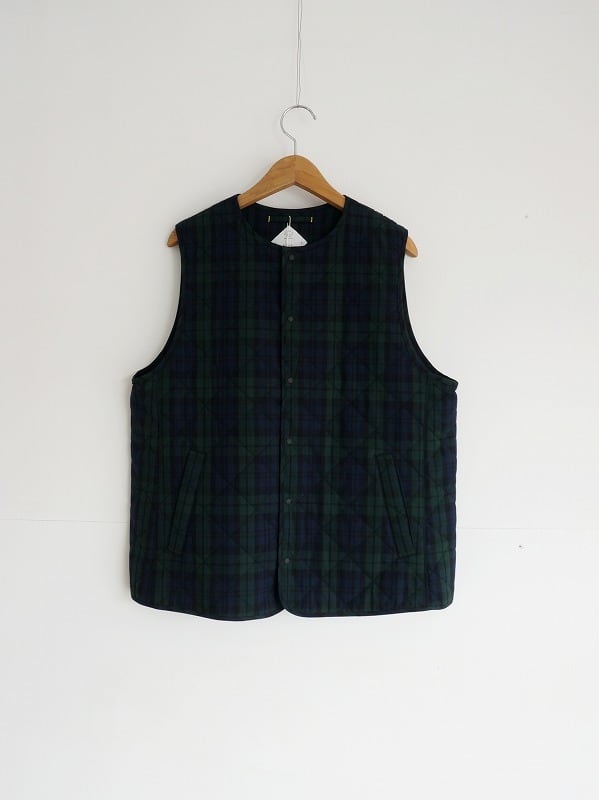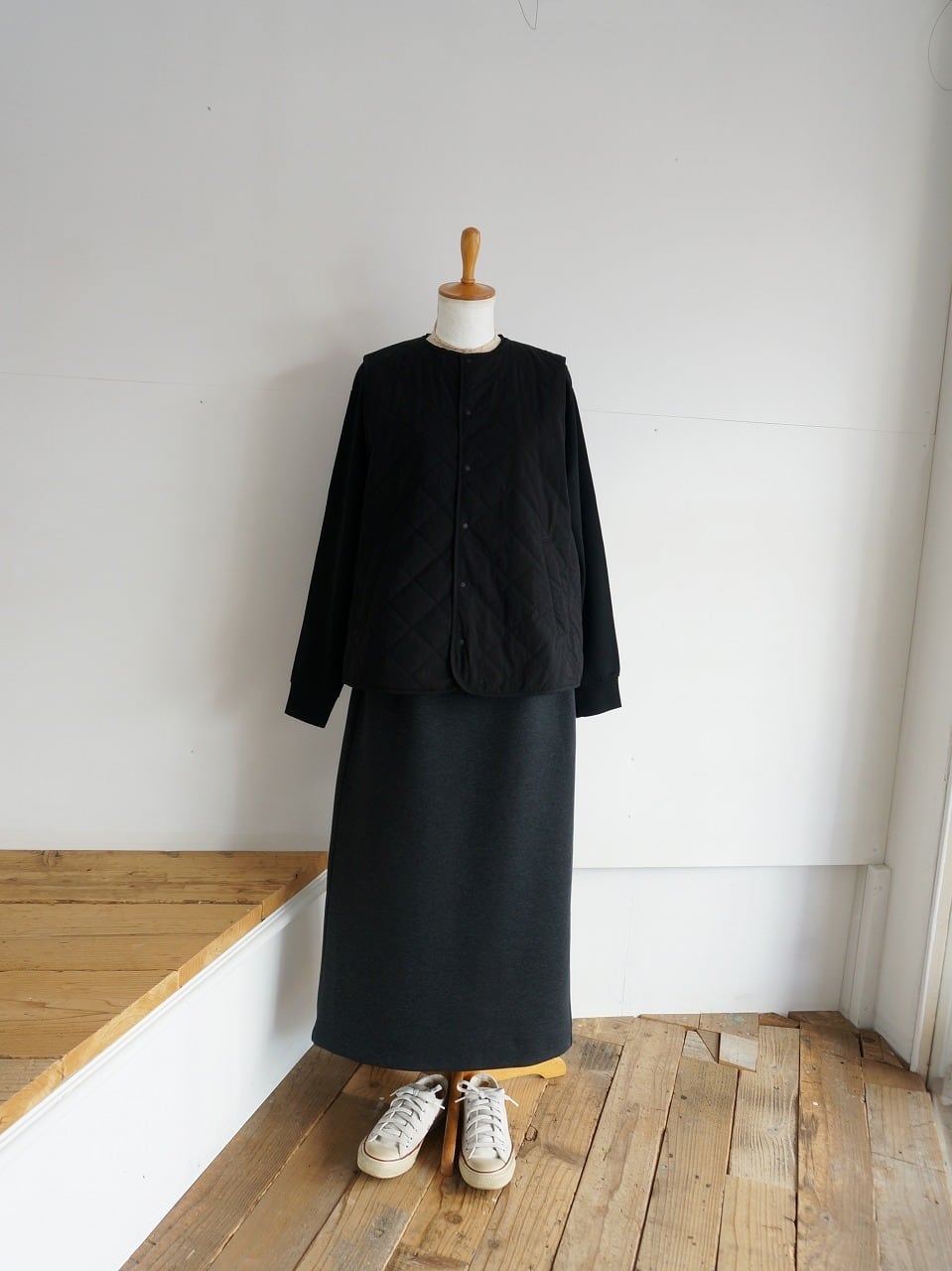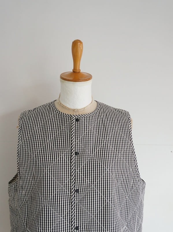 極薄の中綿を挟み込んだキルティングを使用しています。パイピングで縁取りされたクルーネックのベストです。