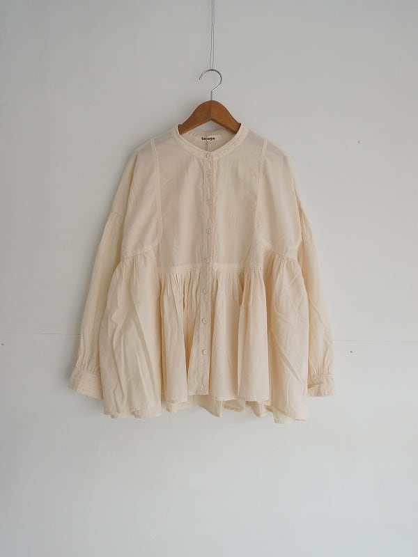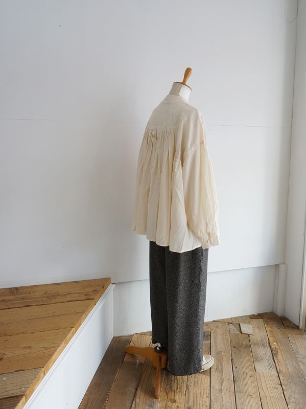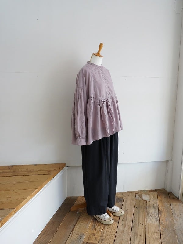 ふっくらやわらかな綿素材のブラウスです。切り替え部分にタックをたっぷりとって、軽さを生かしたふんわりシルエットで仕上げています。