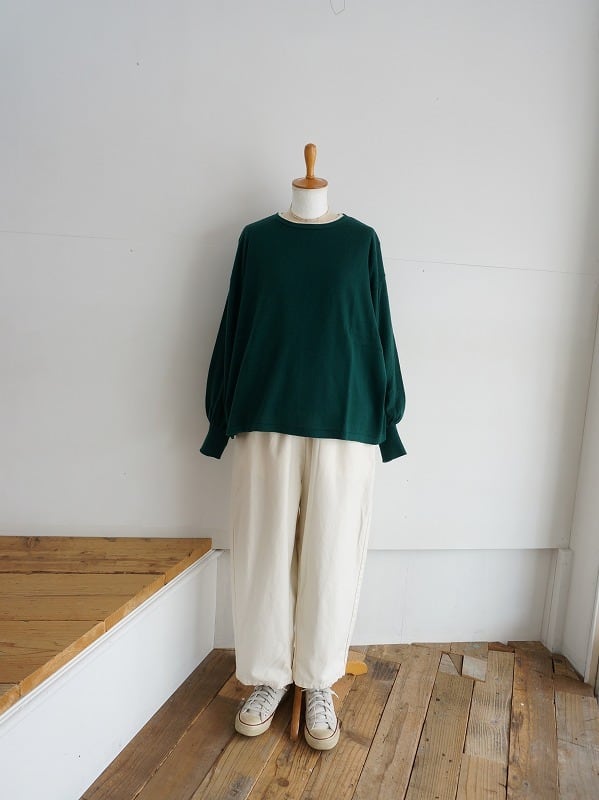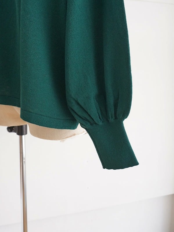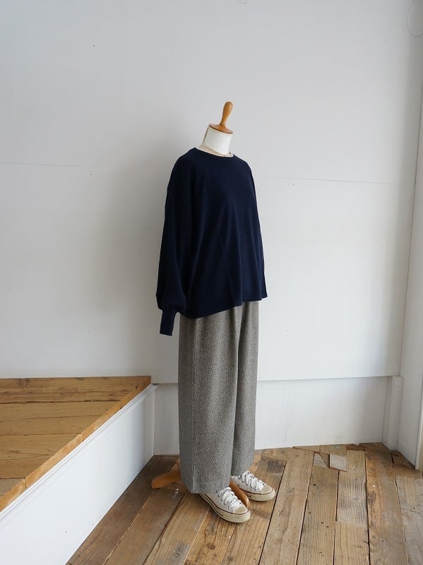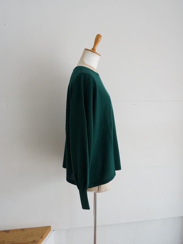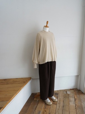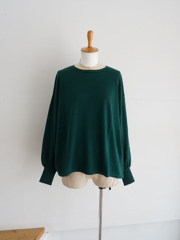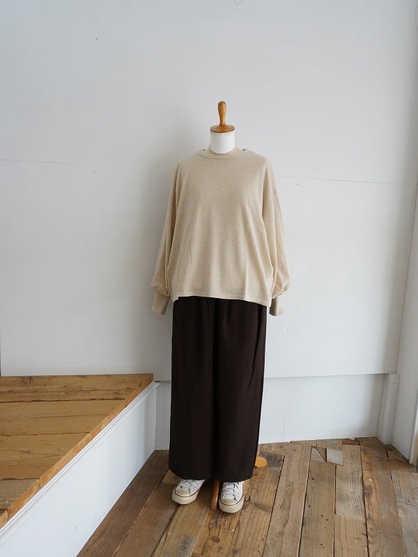袖口にリブをつけてギャザーを寄せて、ややふくらみを持たせた袖の形がポイント。少したくし上げてもいい雰囲気です。ニットならではのやわらかな着心地で、シンプルに着回しの利くアイテムです。
