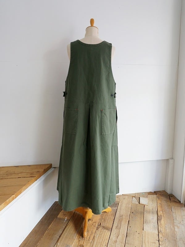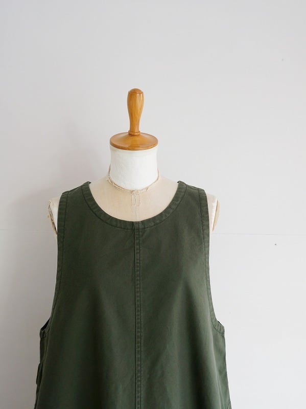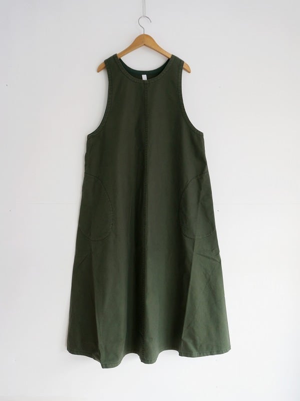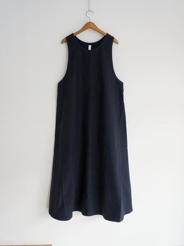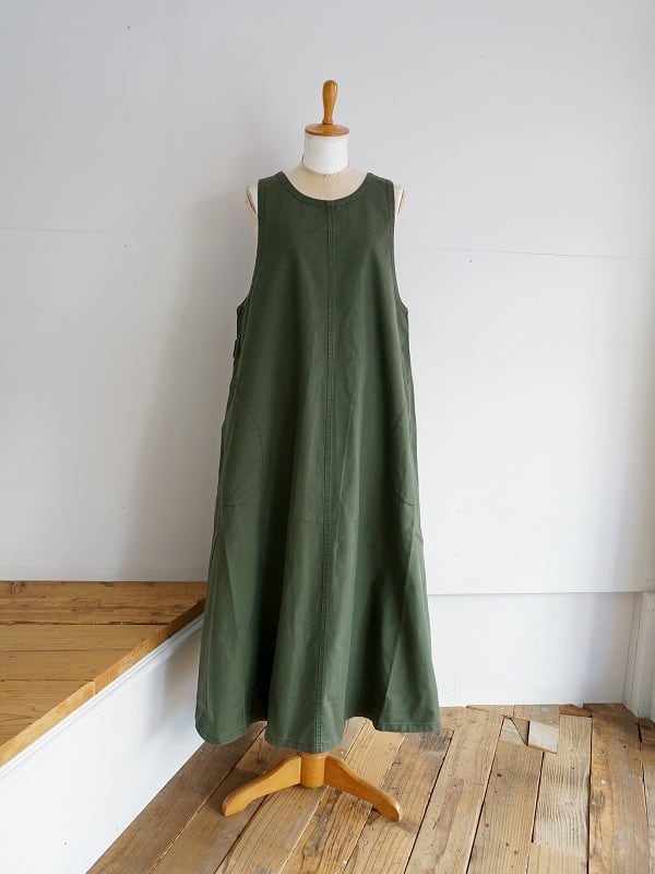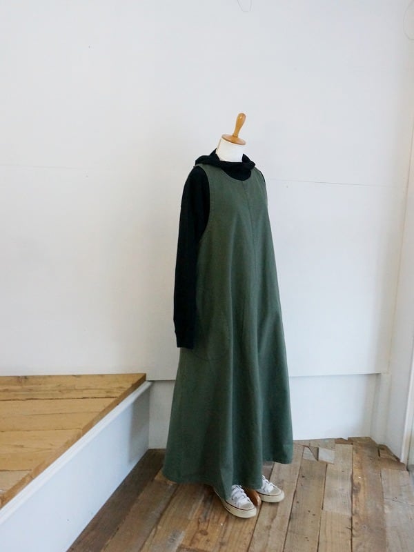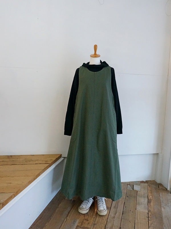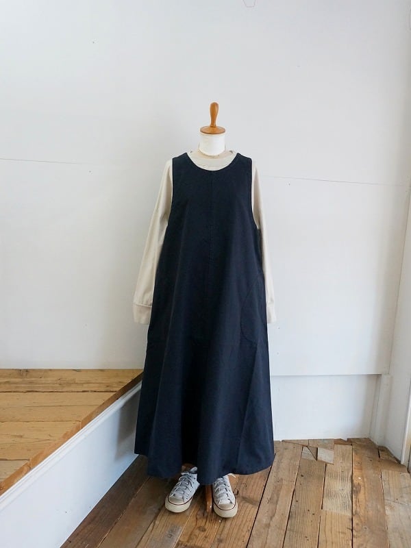 張りとコシのある綾織りの生地を使用したジャンパースカート。スカート部分がフレアになった形が特徴の一枚です。