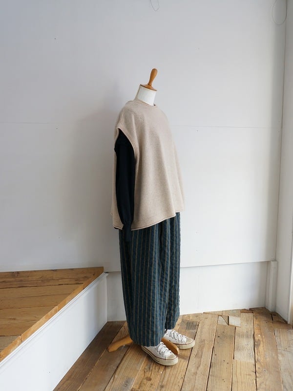 ウールとコットンがブレンドされたシボ感が特徴の生地です。ワイドシルエットのイージーパンツ。程よいボリュームのストンとした形、丈はやや短めのつくりです。