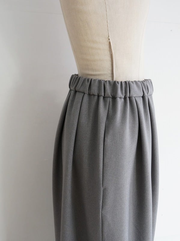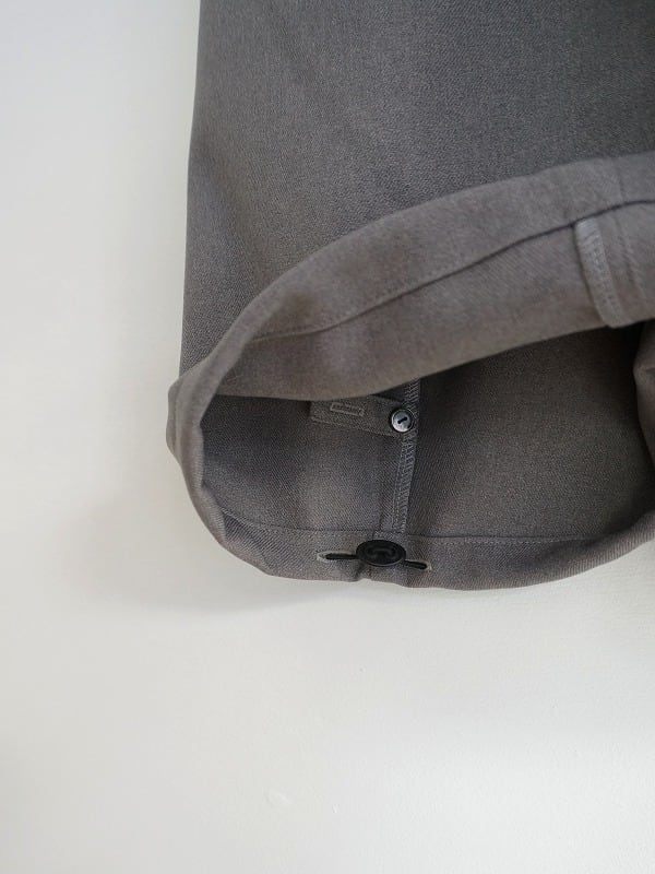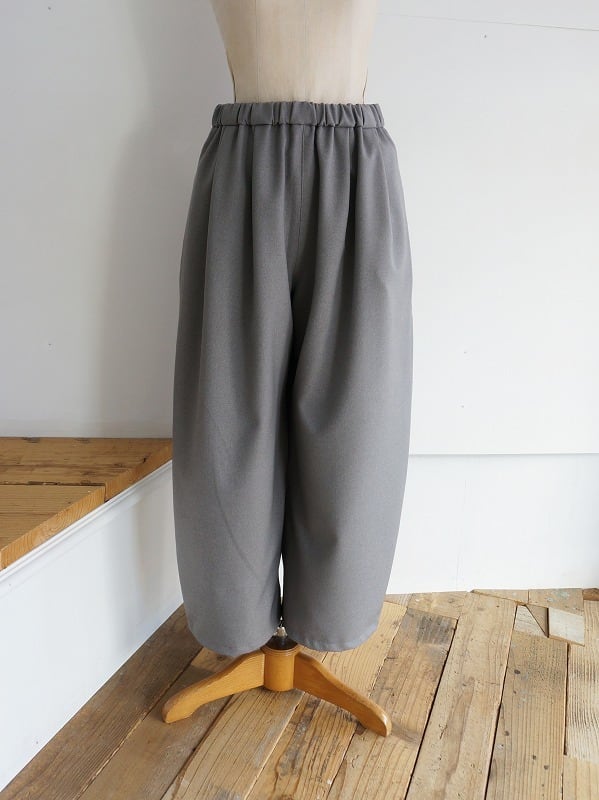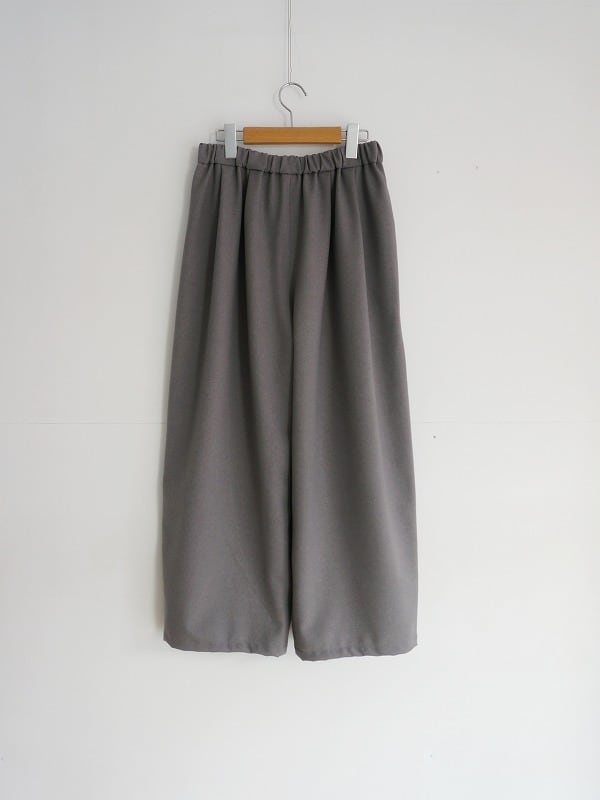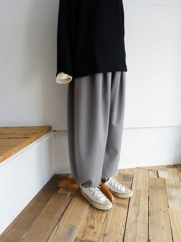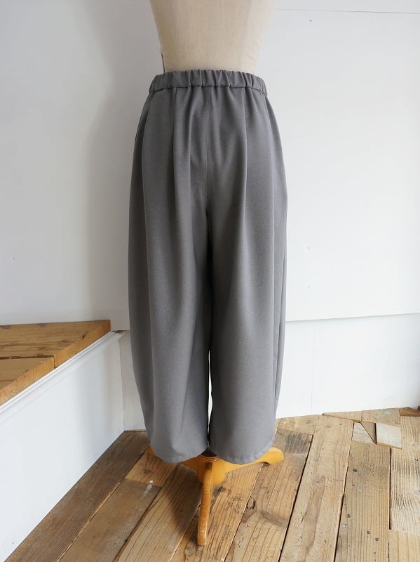 ウールライクなポリエステル素材を使ったパンツです。ワタリにボリュームを持たせたコクーンシルエット。裾に通されたコードで裾幅が調節できるようになっています。