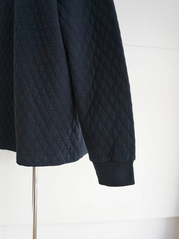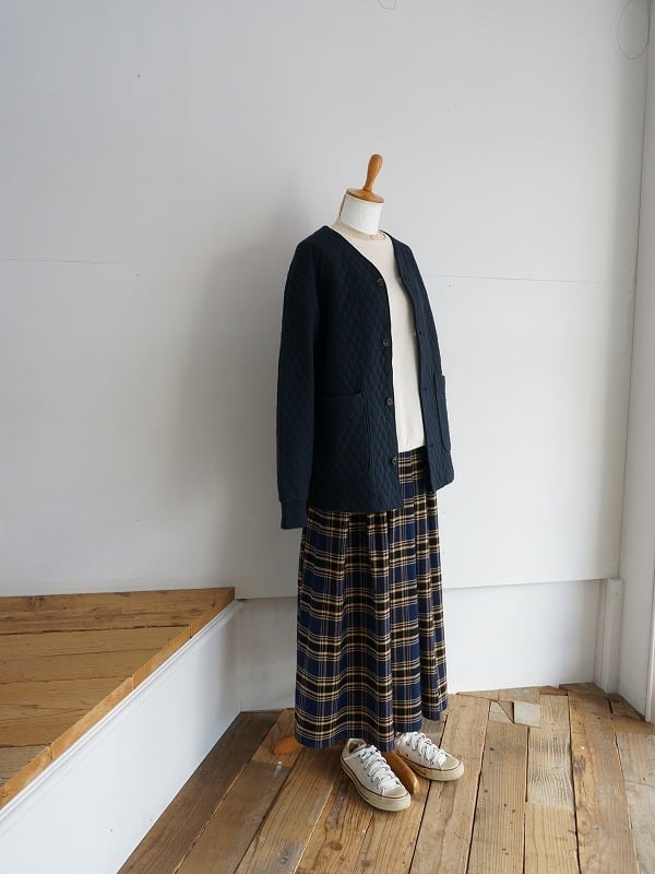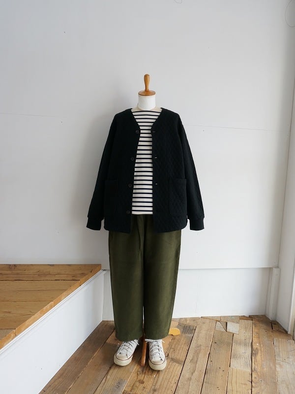 コットン100%の生地を二枚重ねて、そのあいだに薄手の中綿を挟み込んだ保温性のあるキルティングのジャケットです。
