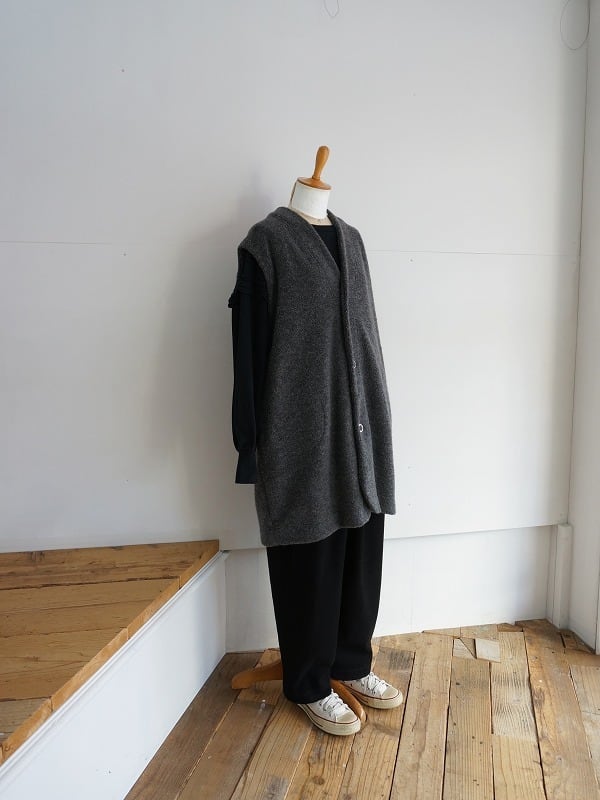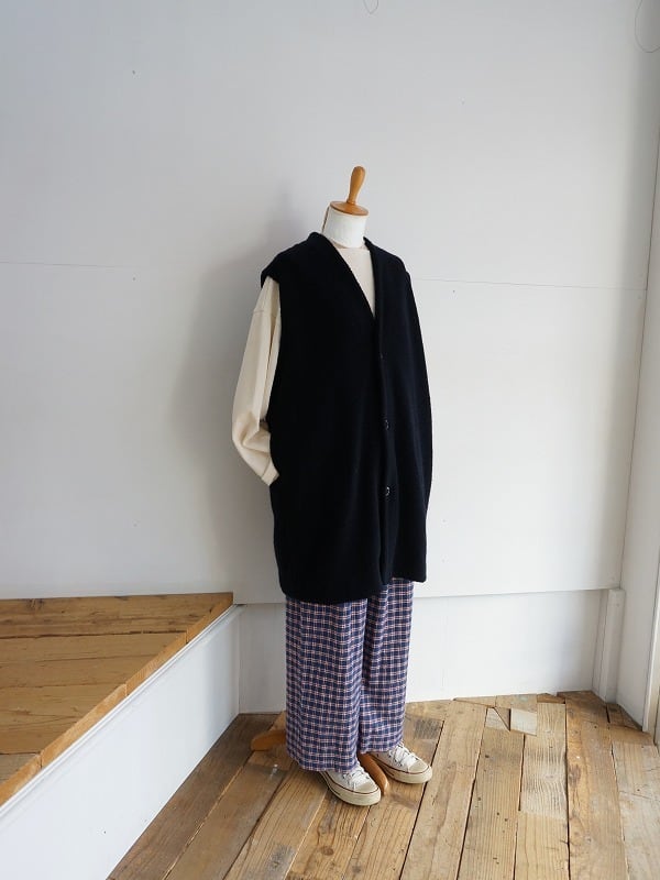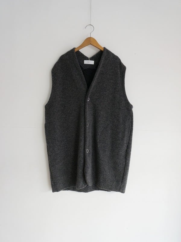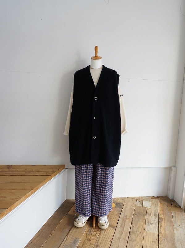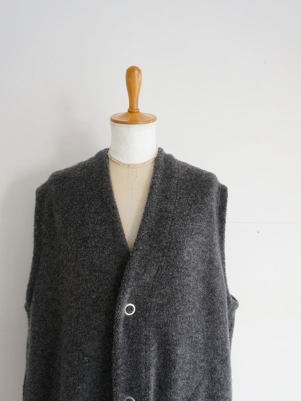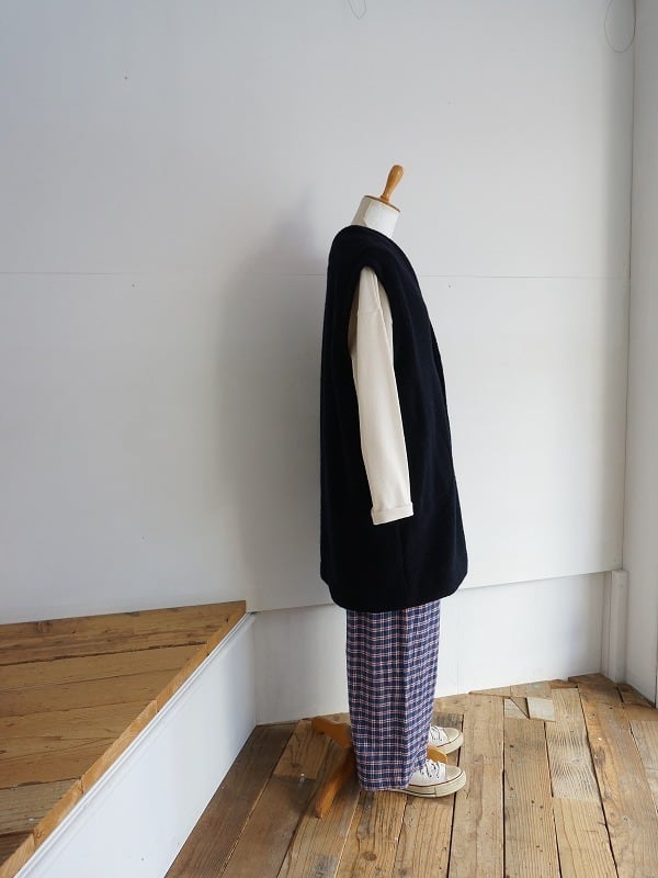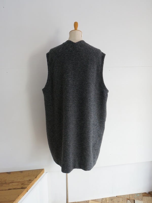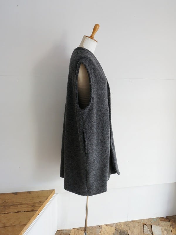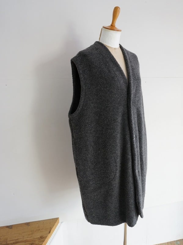 ウールの混率が多めの上質感のあるボアを使用しています。おしりまですっぽりくるんでくれる軽くあたたかなロングベスト。室内でも着ていられる寒い時期に安心感のあるアイテムです。