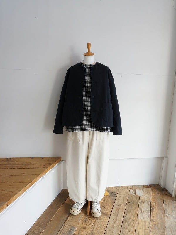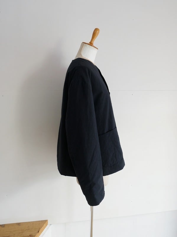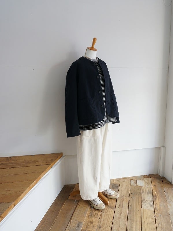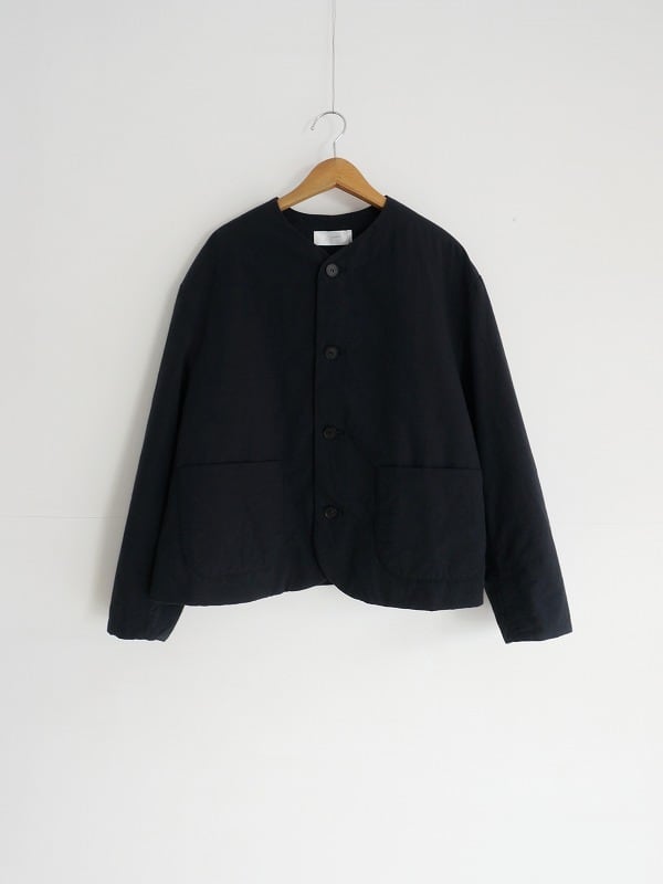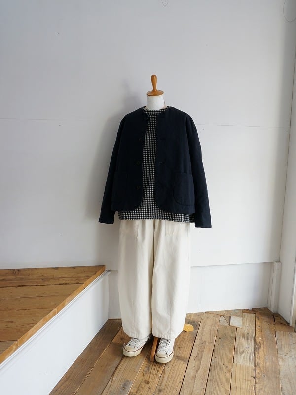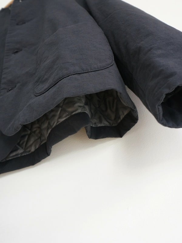 表地にナチュラルな風合いがとても良い綿麻の生地を使い、裏地に中綿のキルティングをあてたジャケットです。ノーカラーで丈はやや短め。ちょっとラウンドした裾のカットもポイントです。