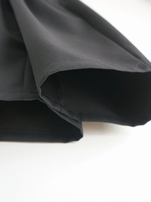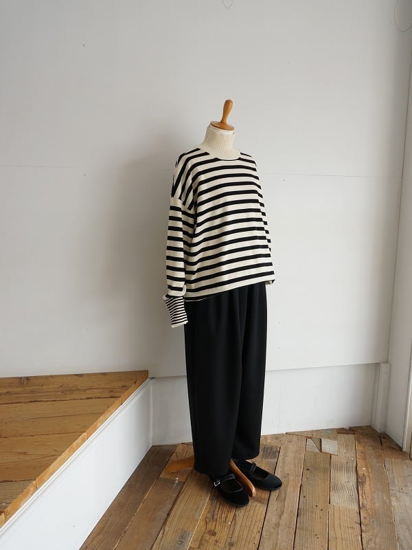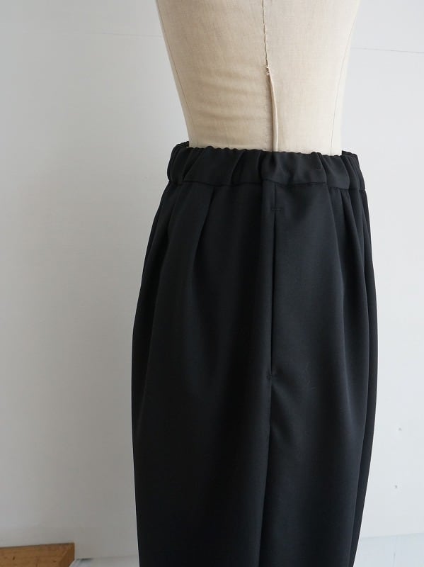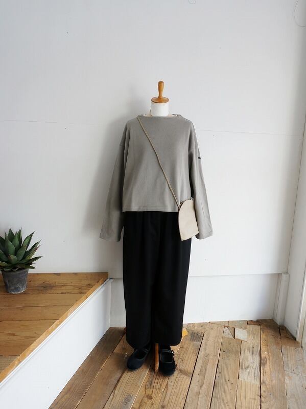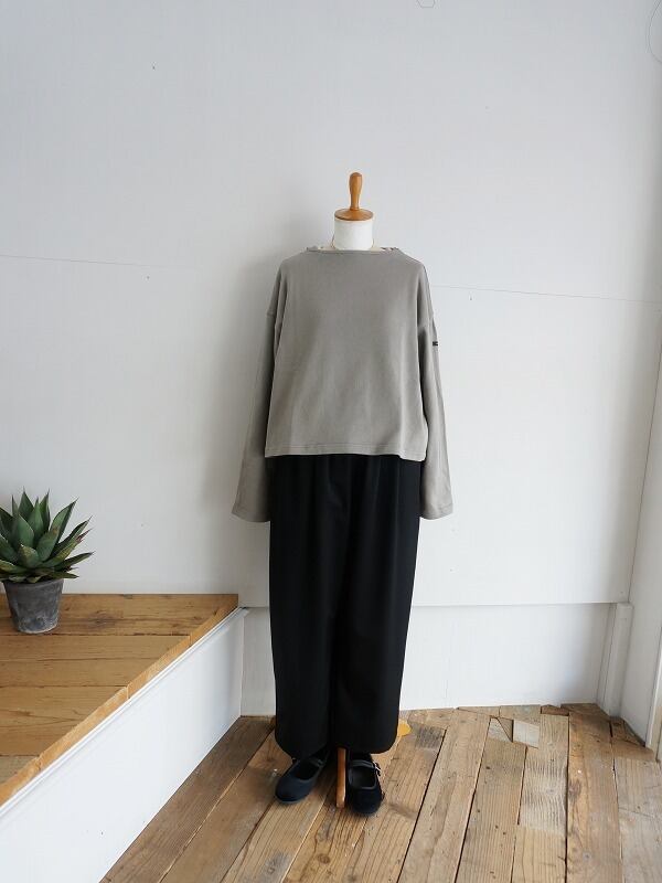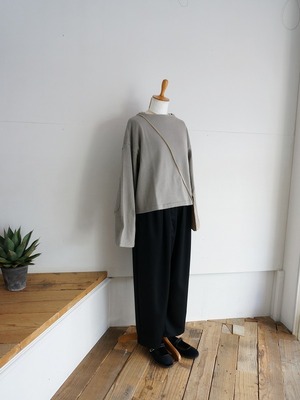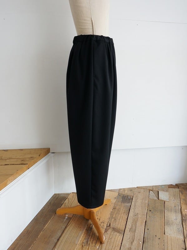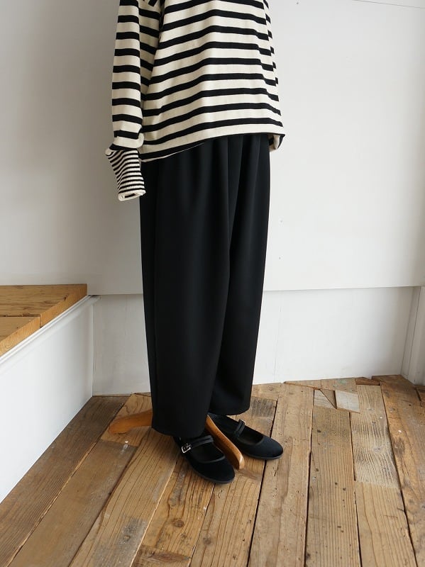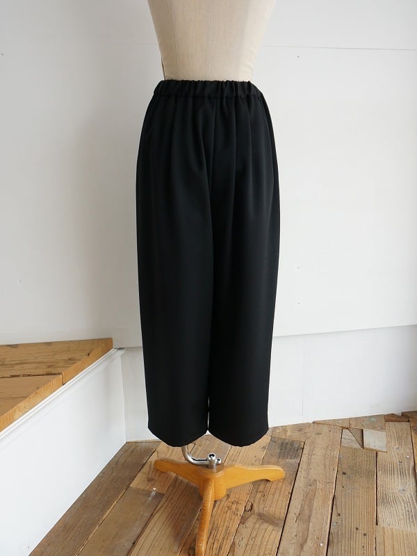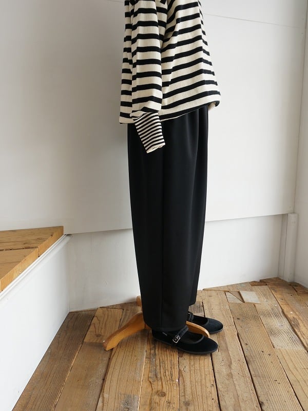 しなやかでさらっとした質感のウール素材を使っています。きちんとした雰囲気がありつつ、穿きやすさも兼ね備えたタックパンツです。程よいボリュームで、裾へ少し細くなったシルエット。レングスは9分丈くらいになっています。