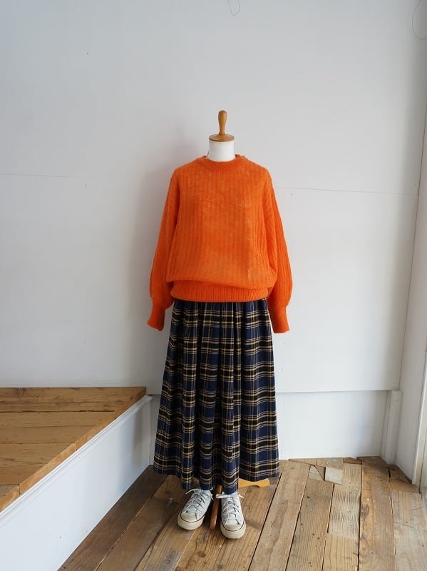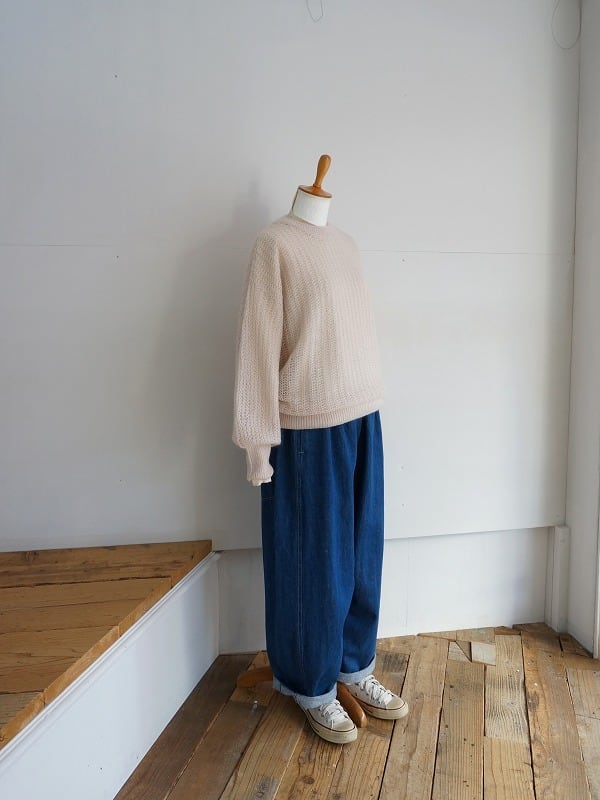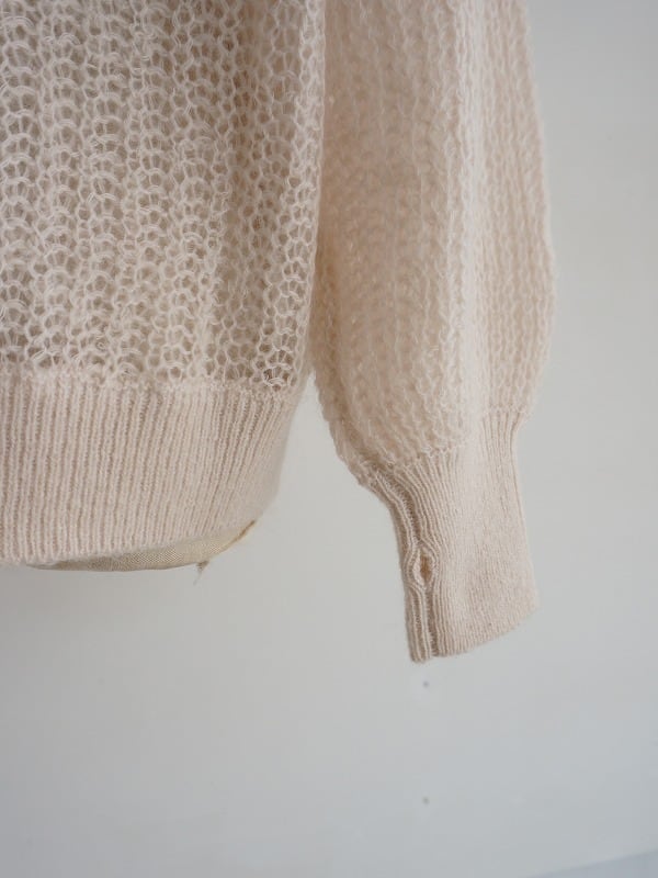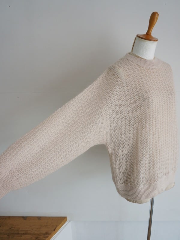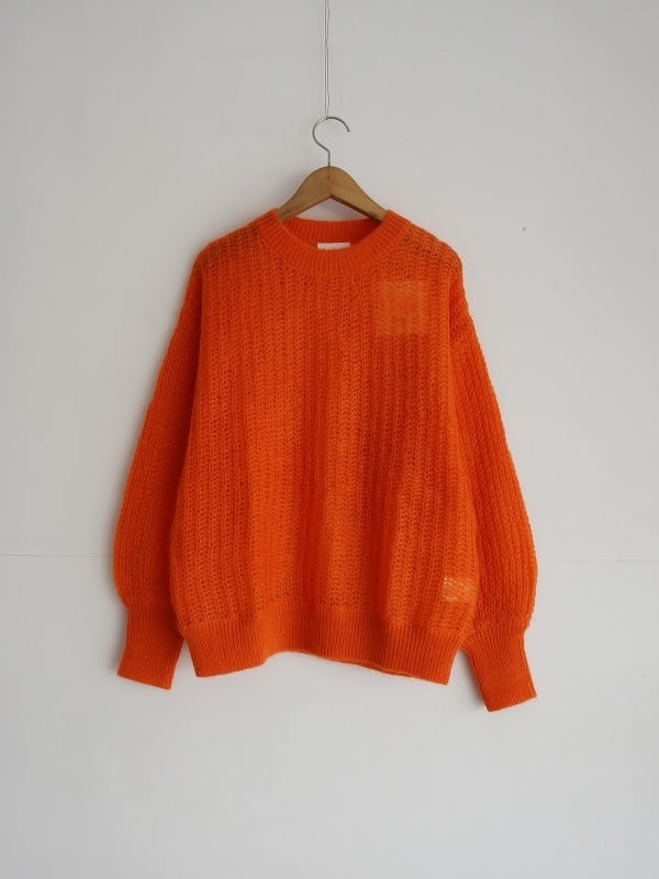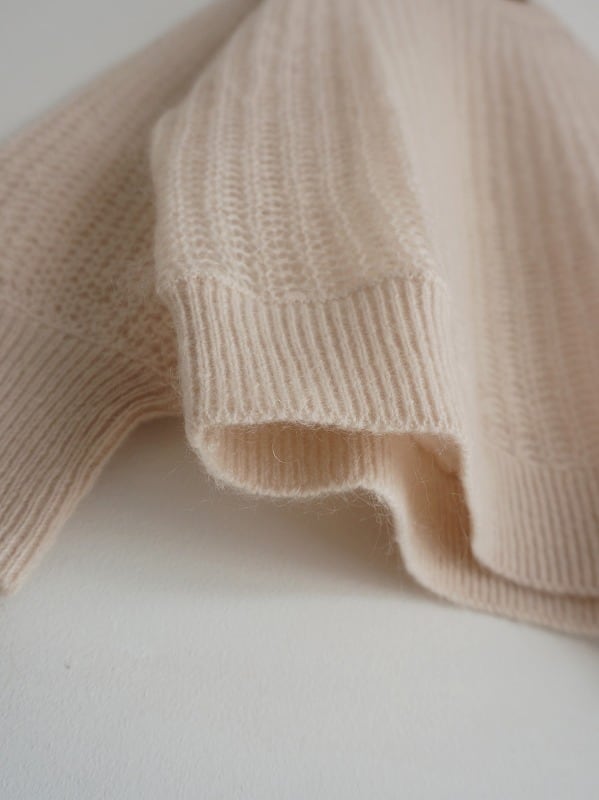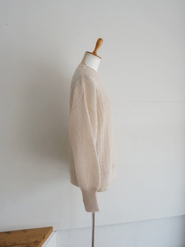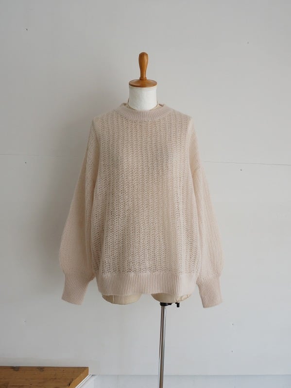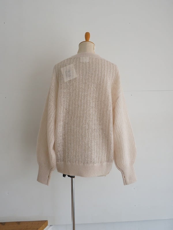モヘア混の毛足のあるニットです。ふっくら軽く、透け感のある編地がポイントです。