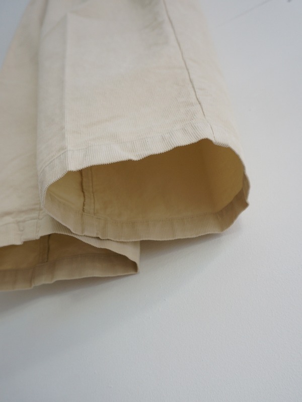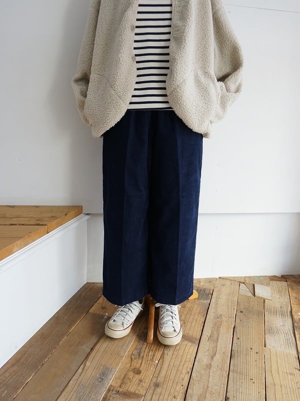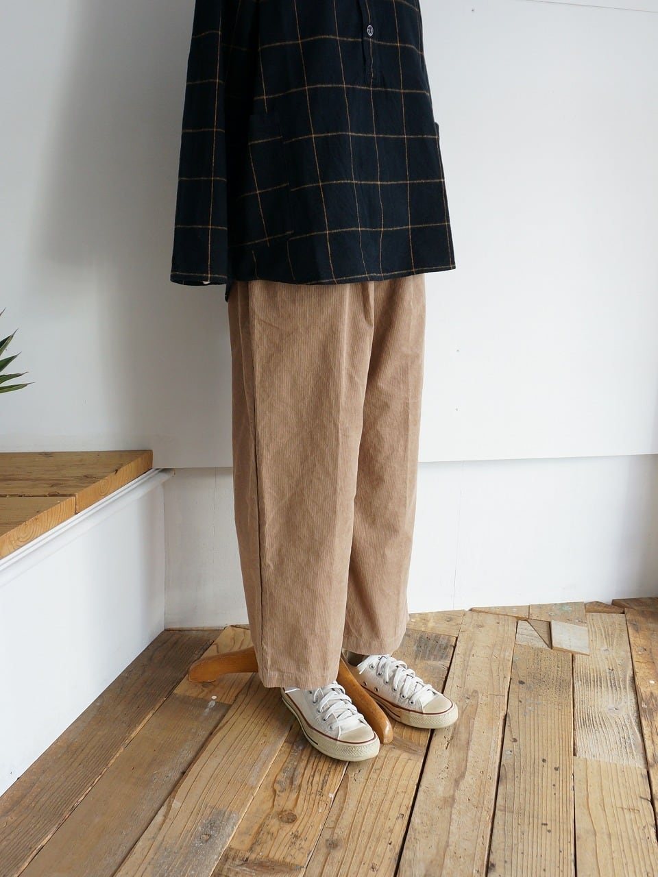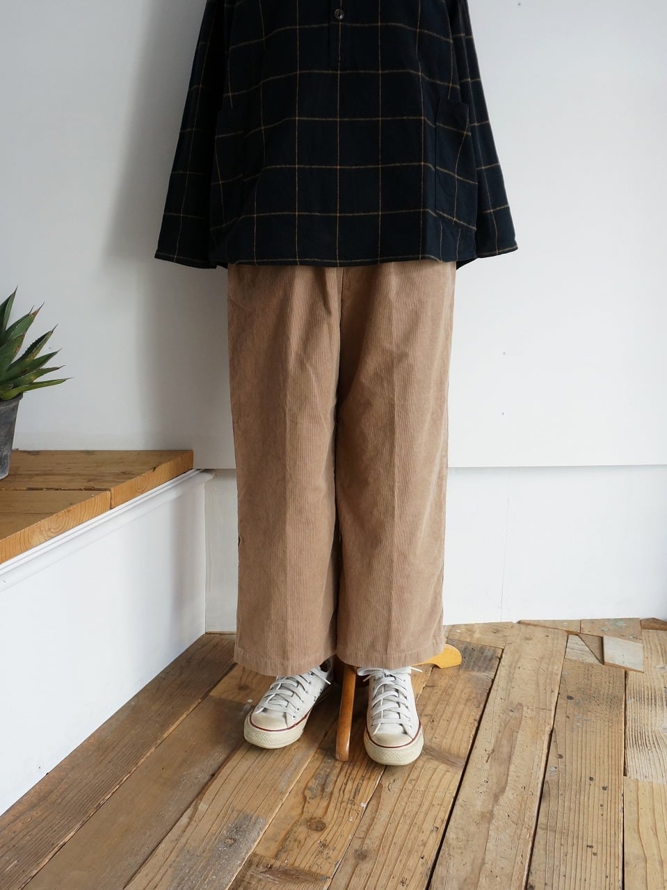 ウエストはゴム仕様で腰周りに程よくゆとりのある形。裾へはストンとしたワイドテーパードのシルエットです。レングスは8分から9分丈くらいになっていて、程々のボリューム感でコーディネートに取り入れやすい仕上がり。コーデュロイの風合いが季節感を引き立ててくれます。