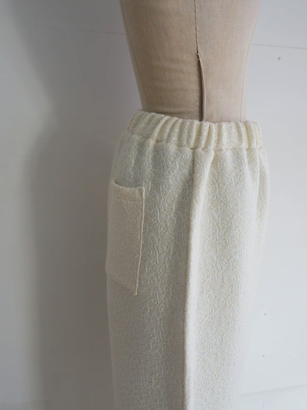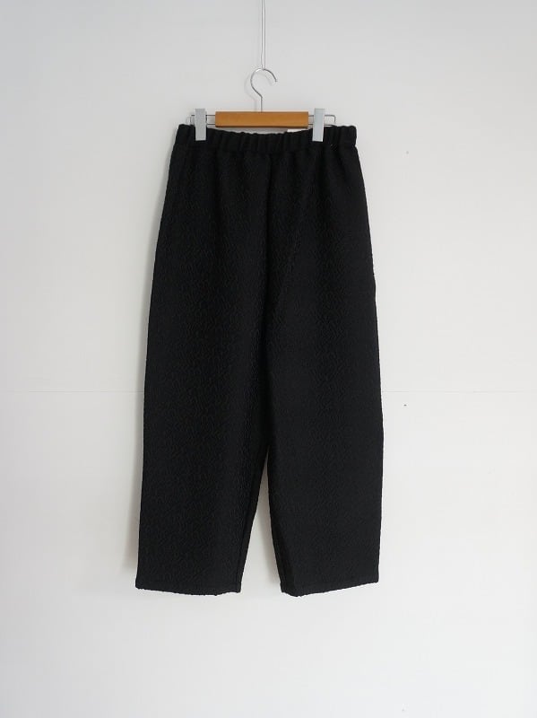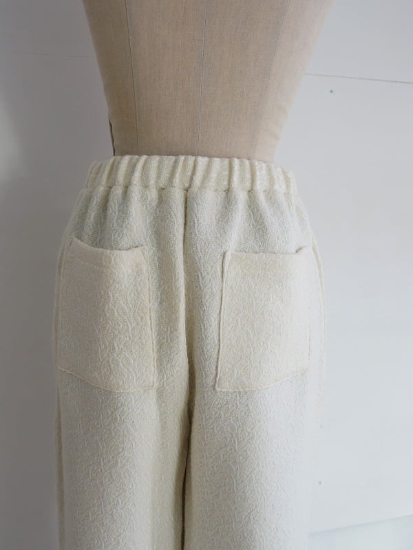 同色で構成されたジャガード織りの生地を使ったパンツです。程よいボリューム感のテーパードシルエット。レングスは9分丈くらいのつくりです。ふっくらした生地に浮かび上がるジャガードの織り柄が素敵な雰囲気。コーディネートのアクセントに、シンプルなつくりなので、いろいろなアイテムと組み合わせていただけます。