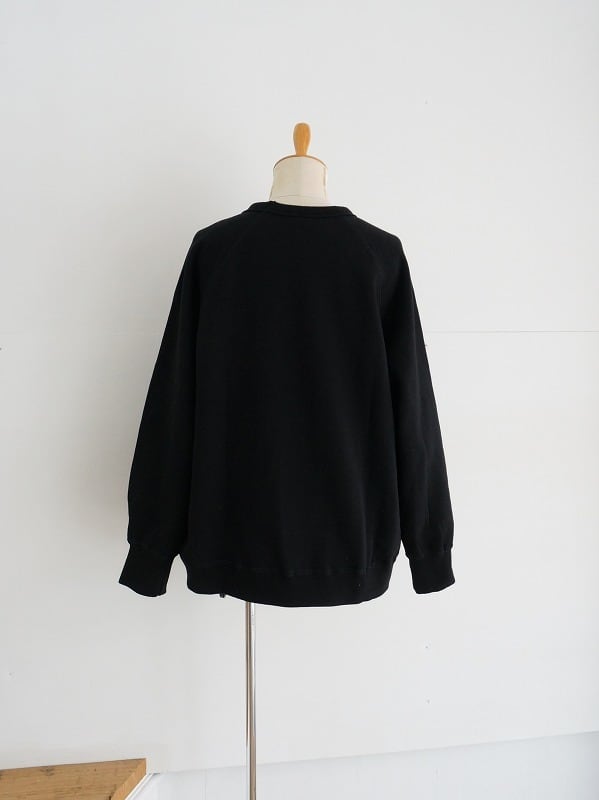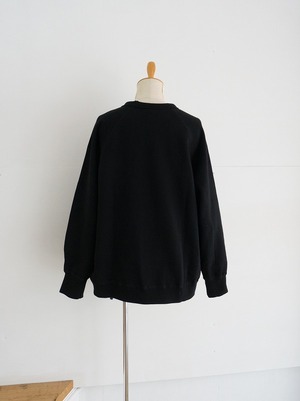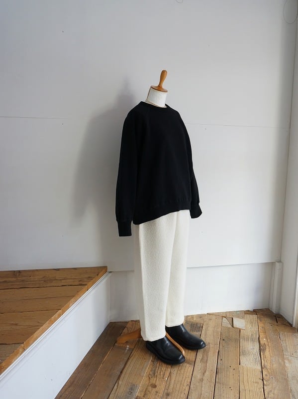 クルーネックに袖付けはラグラン。裾にやや前後差があって立体感のあるシルエットになっています。やさしい肌触りであたたかな着心地の一枚です。