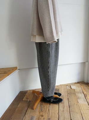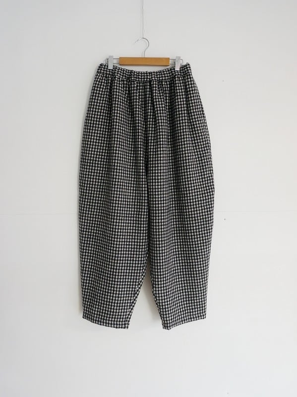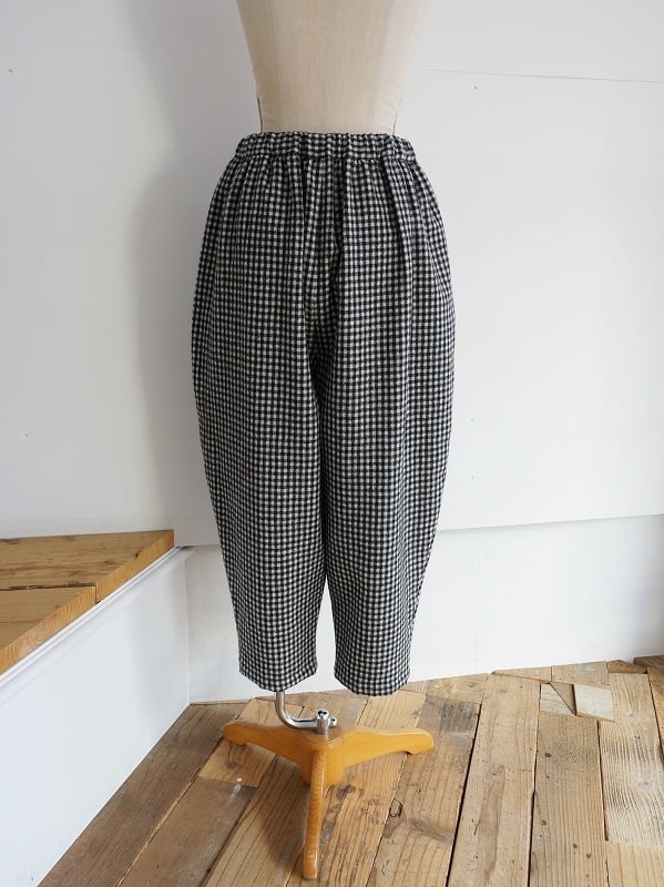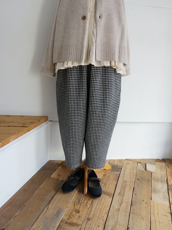 洗いをかけてふっくらさせたウール素材の生地を使っています。ウエストにたっぷりギャザーを寄せでワタリにふくらみを持たせ、裾へ強めにテーパードしたまるみのあるシルエットが特徴のパンツです。レングスは8分から9分丈の足首が出るくらい。チェックはモノトーンで構成され、ウールの風合いと相まって雰囲気よく仕上がっています。