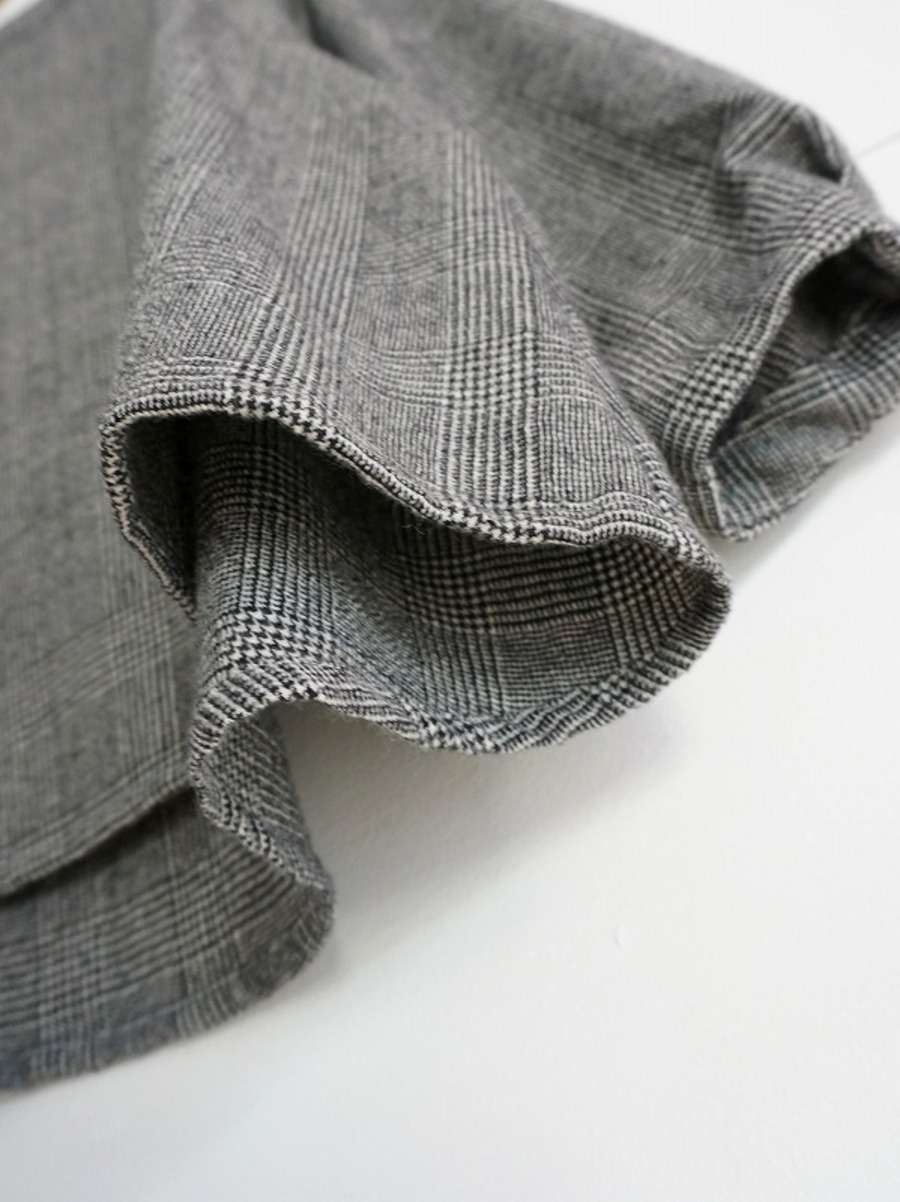 ウール素材のチェックの生地です。洗いをかけてふっくらさせて仕上げています。ご家庭での洗濯はできませんのでご注意ください。