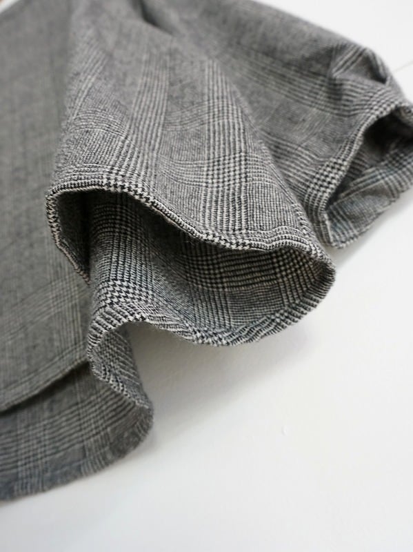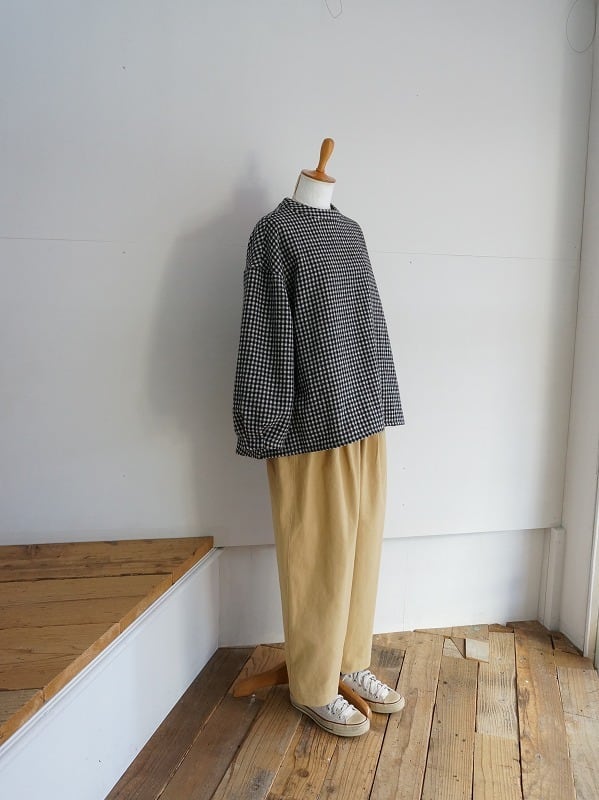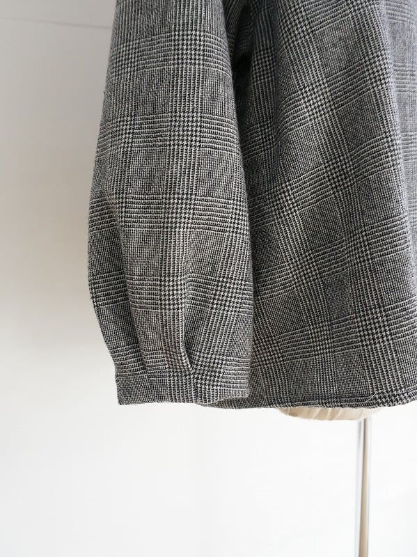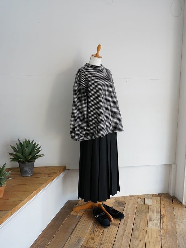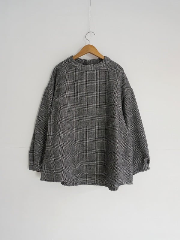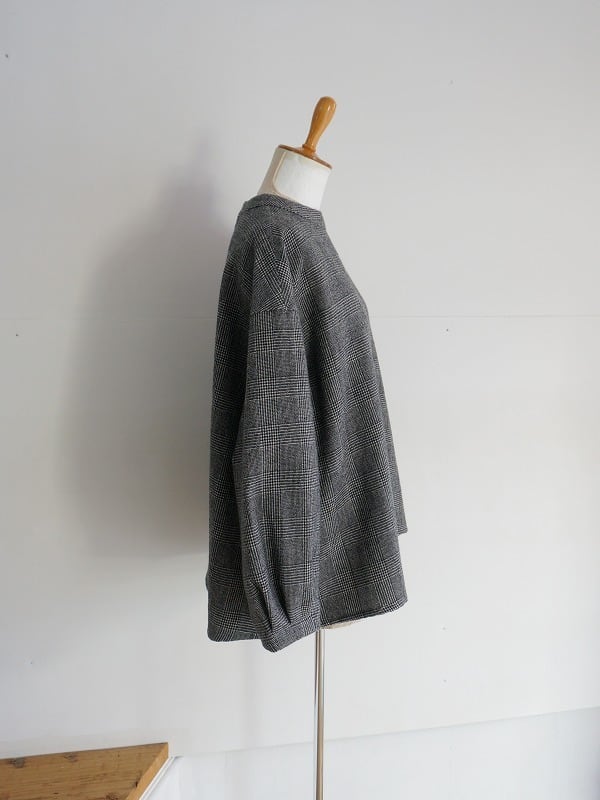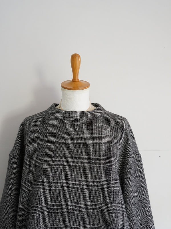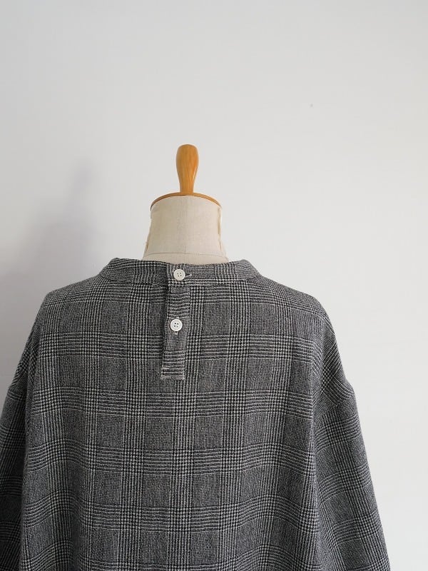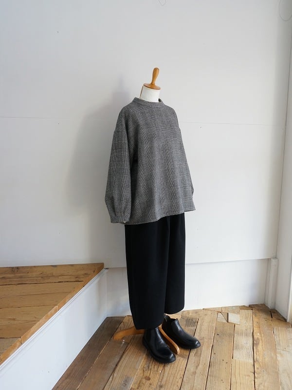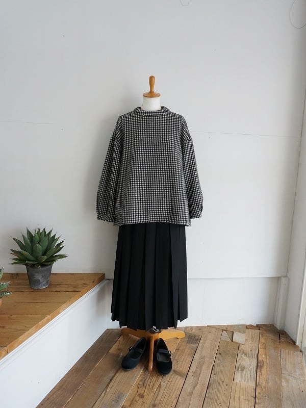 洗いをかけてふっくらさせたウール素材の生地を使っています。モノトーンで構成されたチェックがポイントのプルオーバーブラウスです。