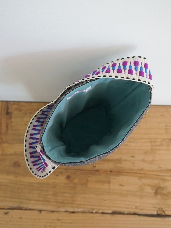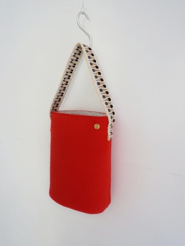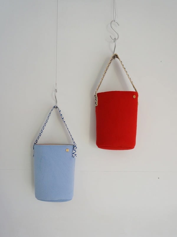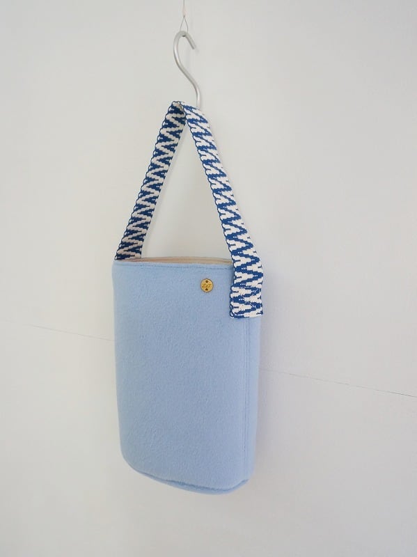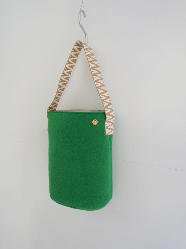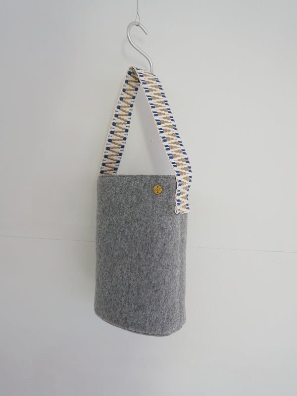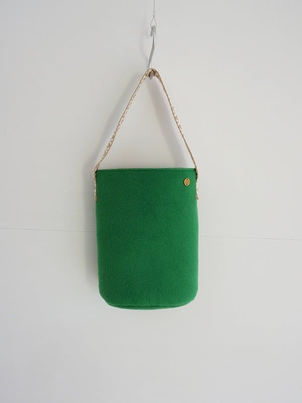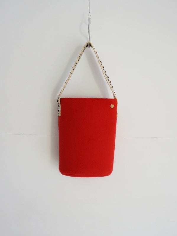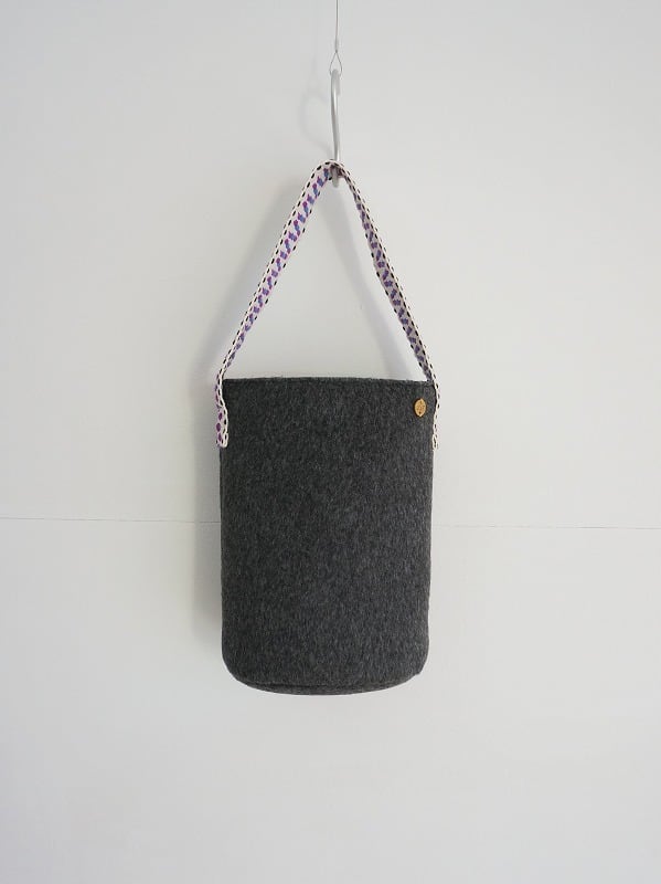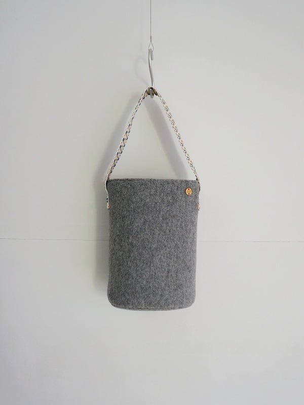 フェルトの生地を使ったシングルハンドルの円柱型バッグです。ちょこっと持ちに便利なハンドバッグ。編みこみの持ち手も凝ったつくり。片側にメタルチャームが付いています。