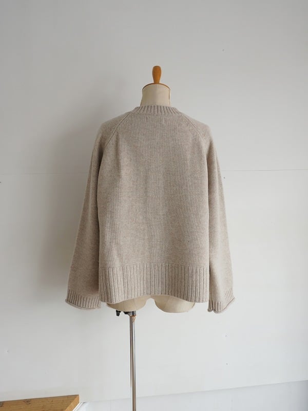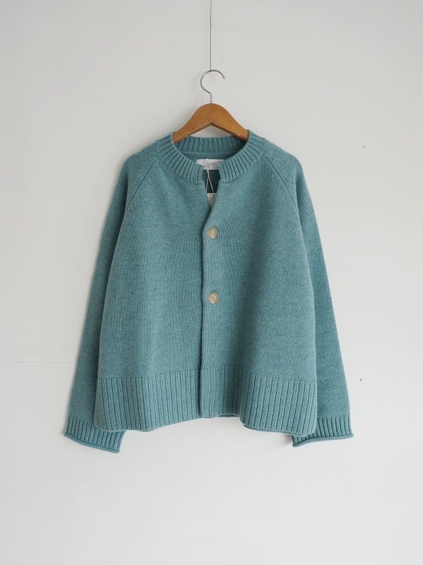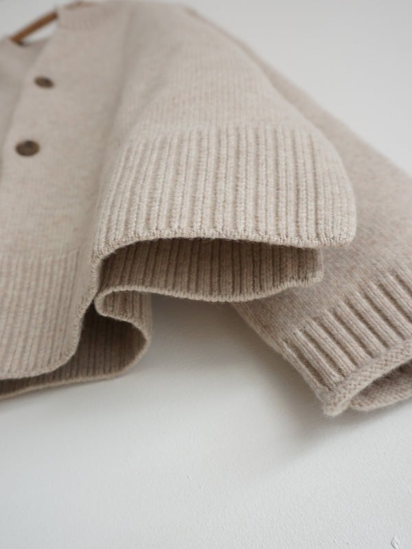 メリノウールを使ったカーディガンです。2本取りで編みたてられ、ざっくり厚みのある質感に仕上がっています。