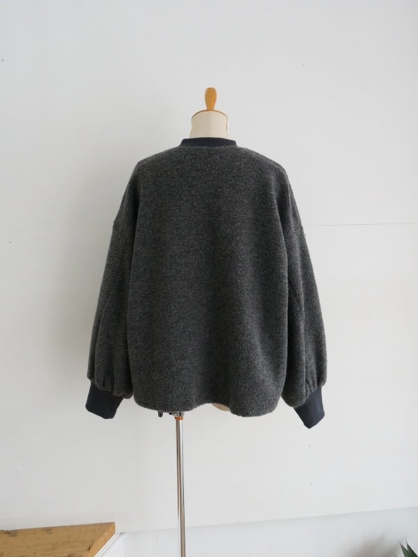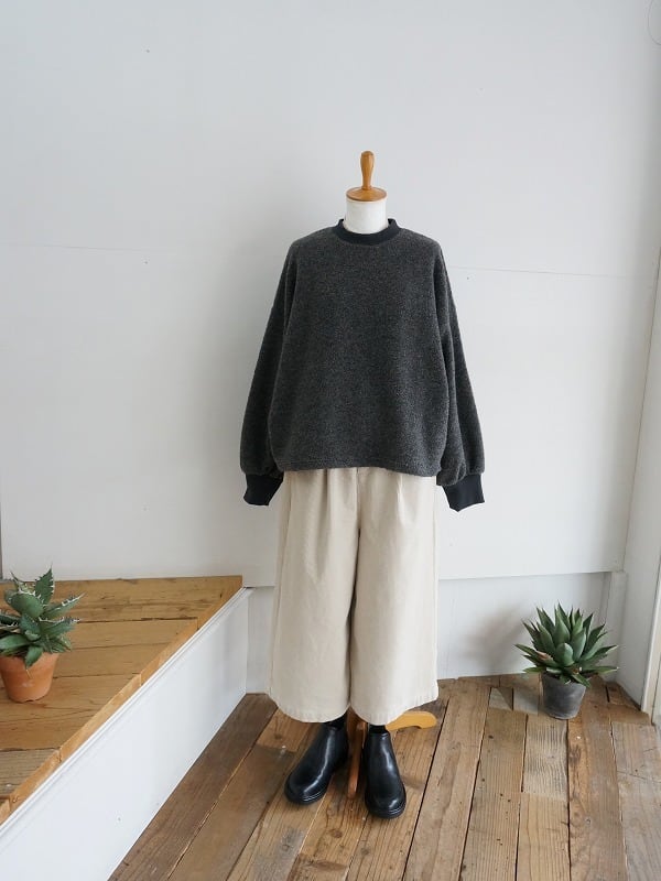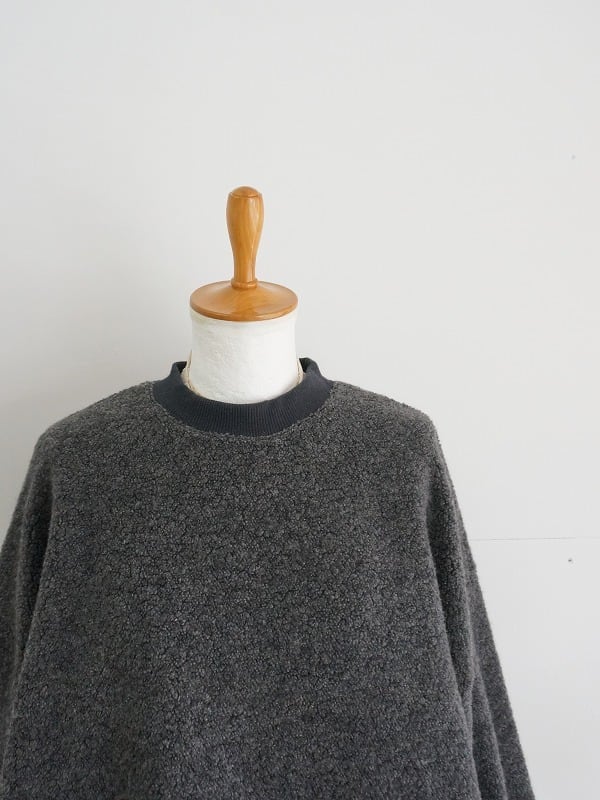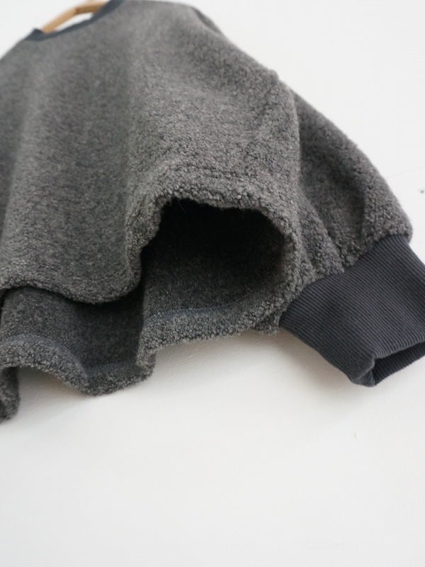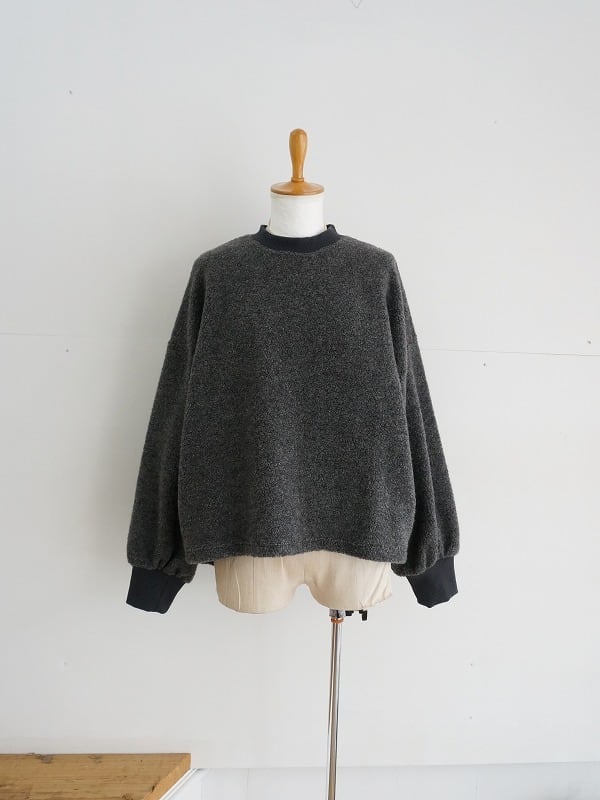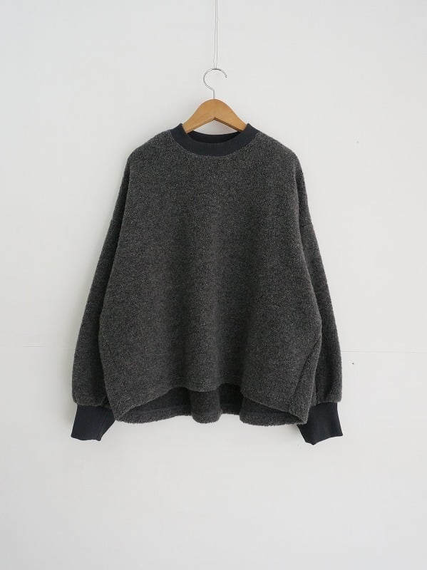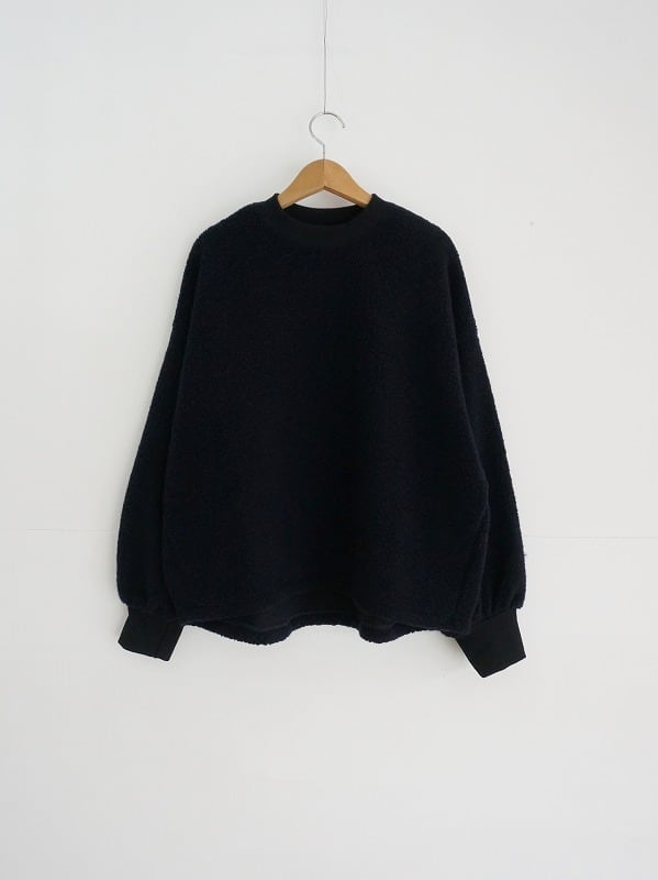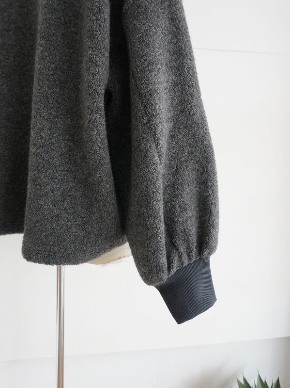 もこもことした素材感がポイントです。軽くてあたたかなボア素材のプルオーバー。ネックと袖口はリブ仕様。裾に前後差があり、まるみを帯びたシルエットになっています。