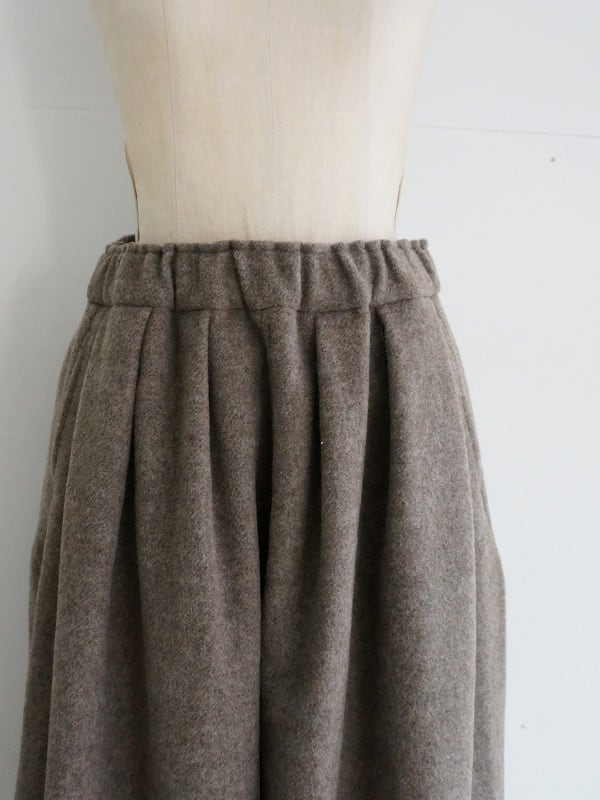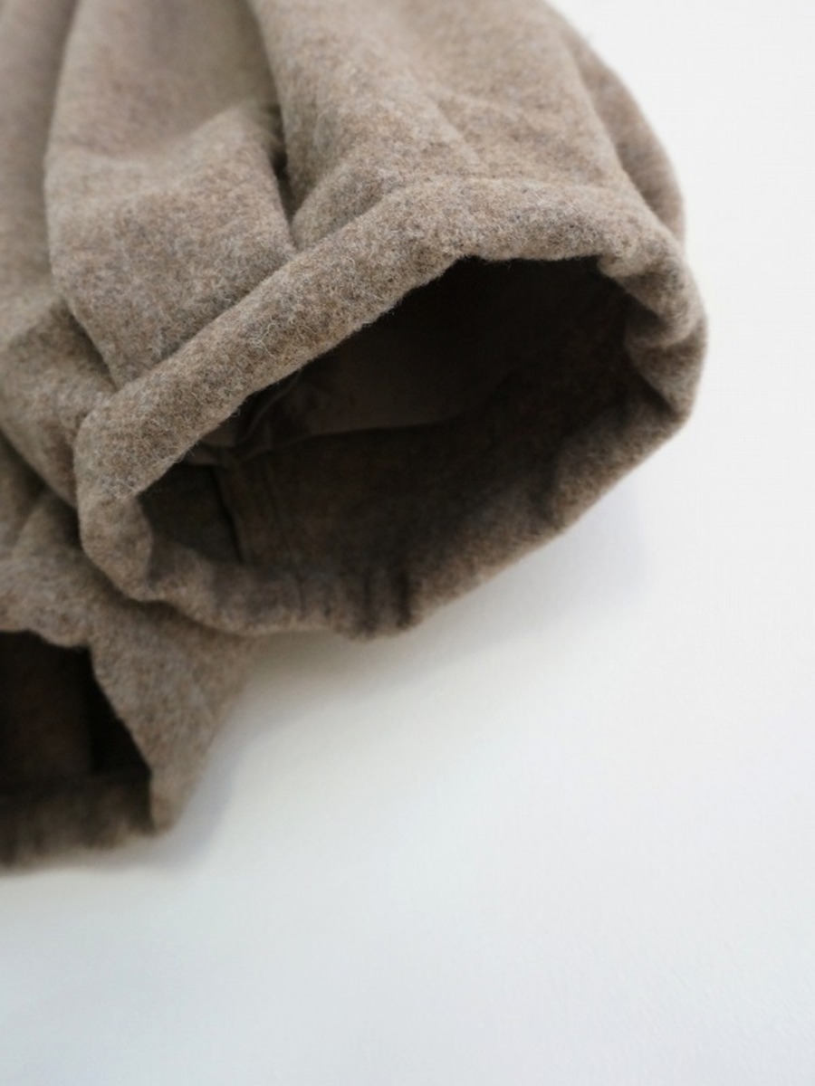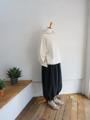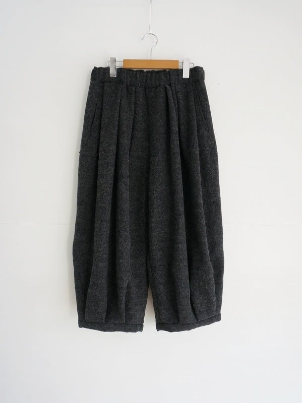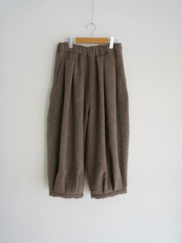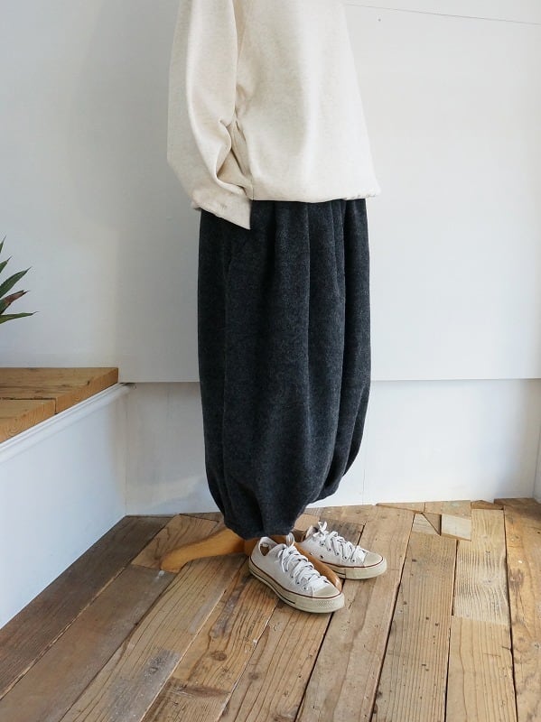ウエストと裾にタックを取り、ワタリにはボリュームを持たせたバルーンシルエット。ぷくっとしたまるみのある形が特徴です。レングスは8分丈くらい。冬ならではの素材感で存在感もたっぷり。ぬくもりのあるコーディネートが楽しめます。
