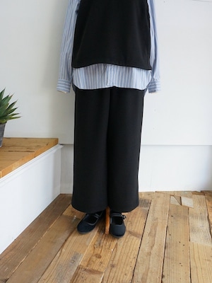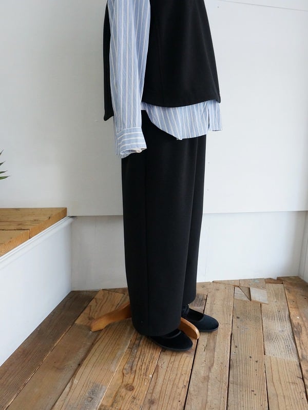 形はストンとしたワイドストレートのシルエット。シンプルにすっきり合わせていただけます。同素材のベストとセットアップでも着用できます。