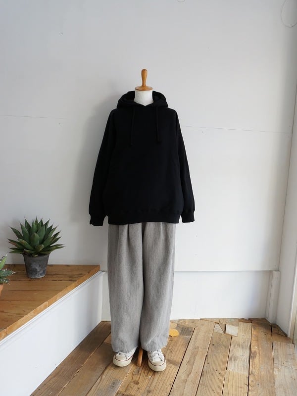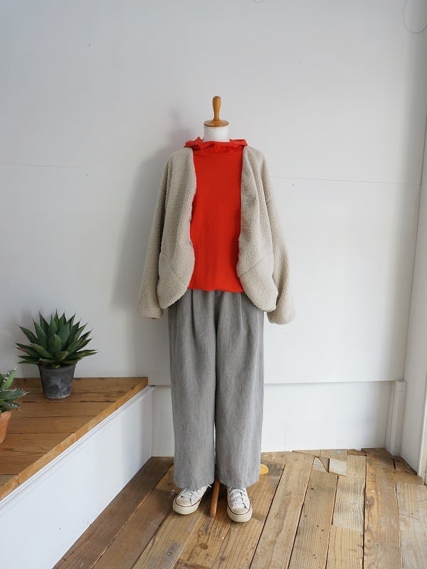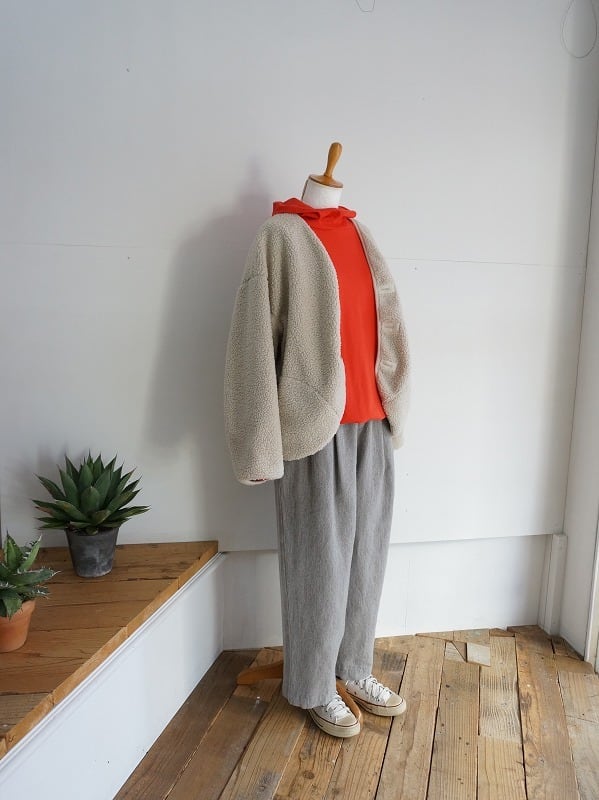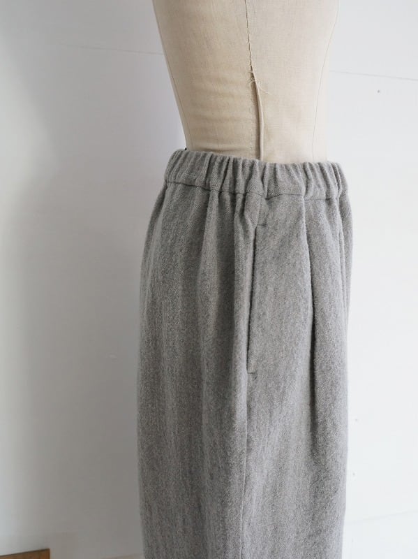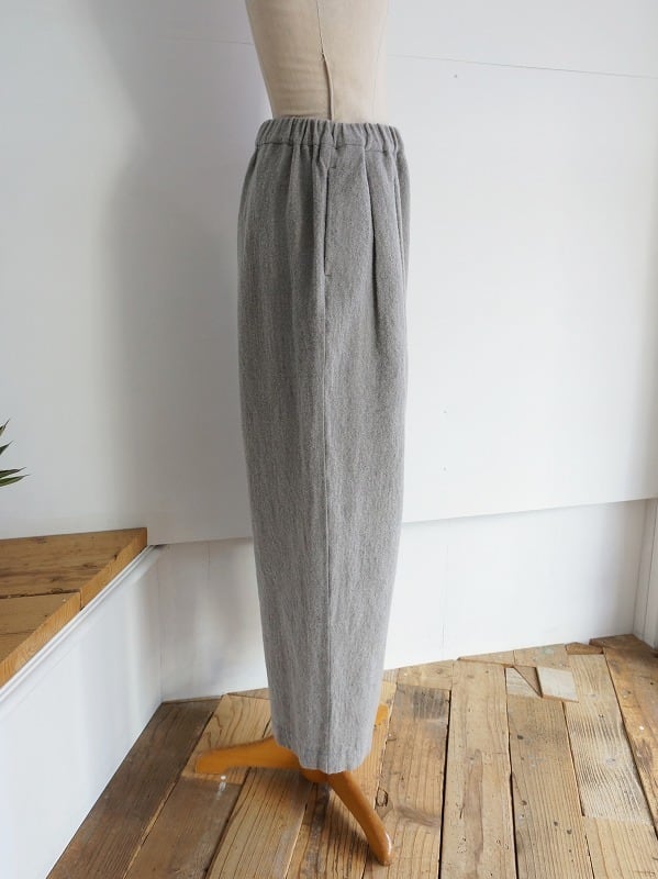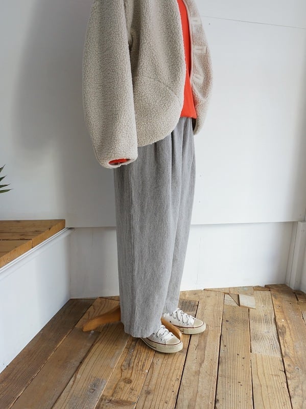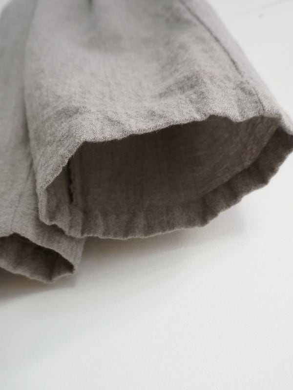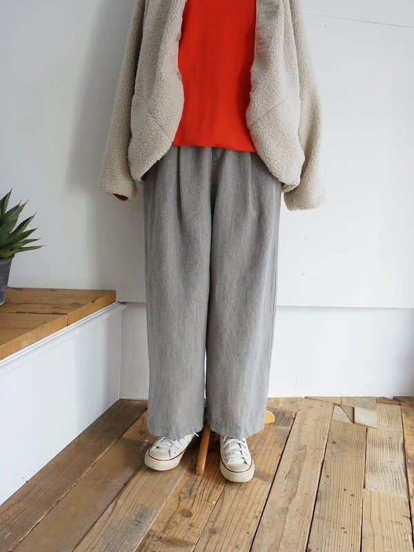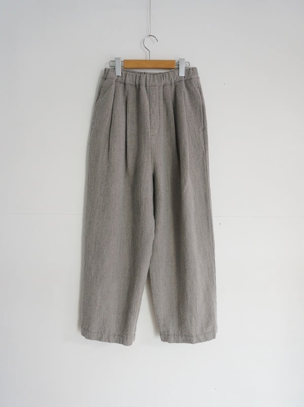 ウールとリネンの混紡素材を縮絨加工の後に起毛させた独特の風合いが特徴です。2タック入りのセミワイドパンツです。