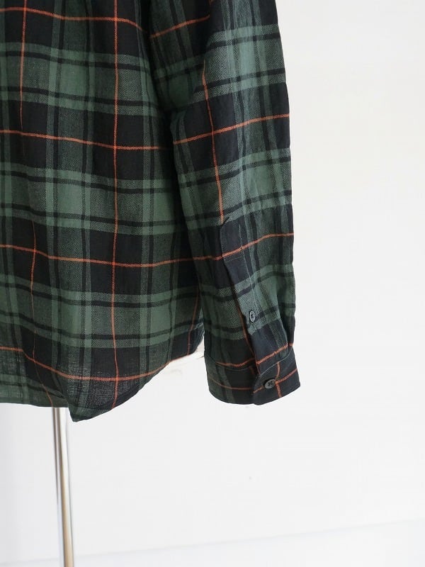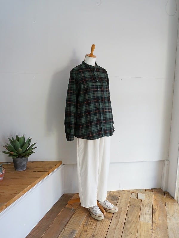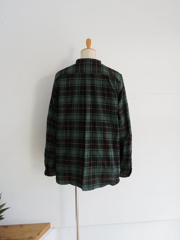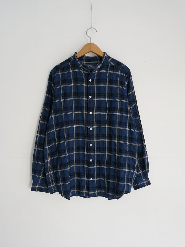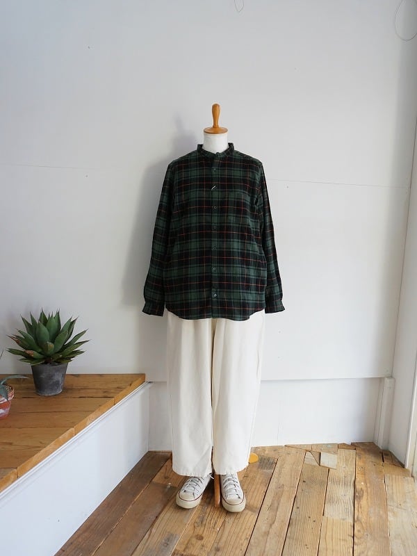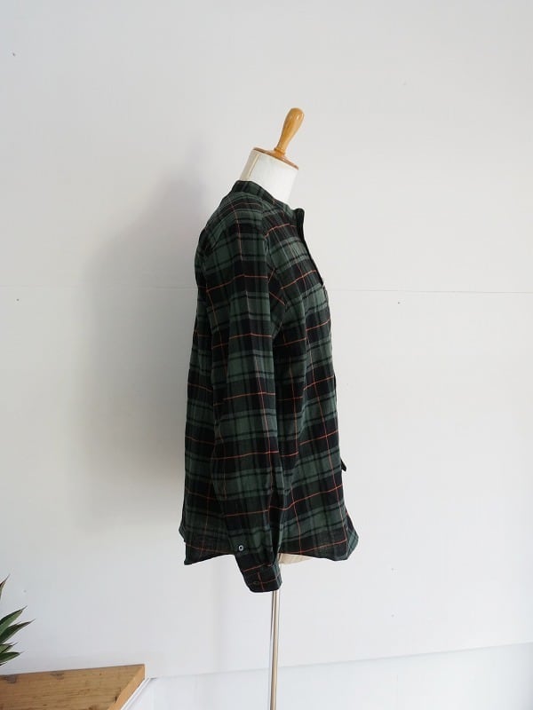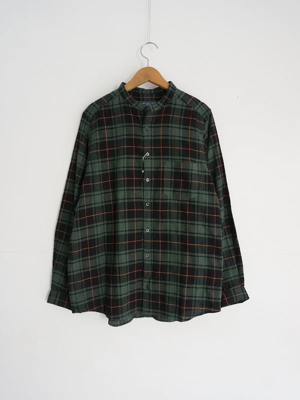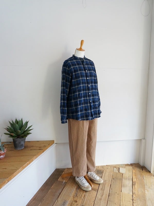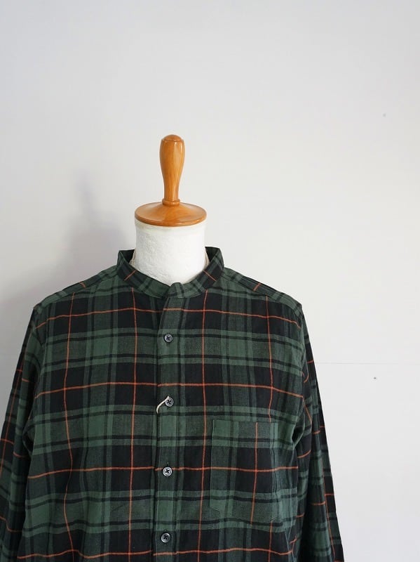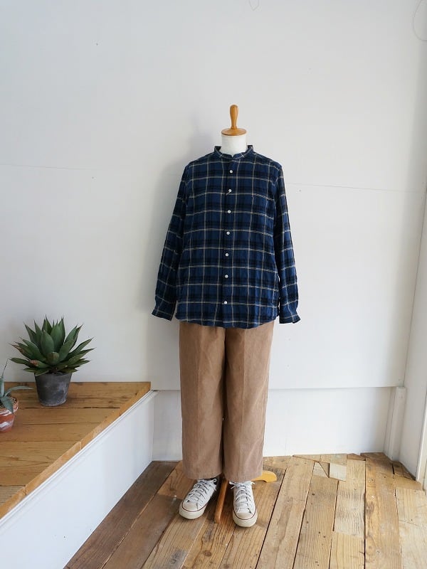 うっすら起毛感があり、やわらかくなじみの良い生地を使っています。しわ感を持たせたヘリンボン地のチェックシャツ。低めのスタンドカラーのシンプルなつくりの一枚です。