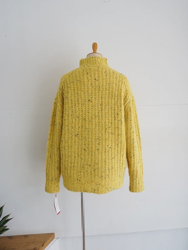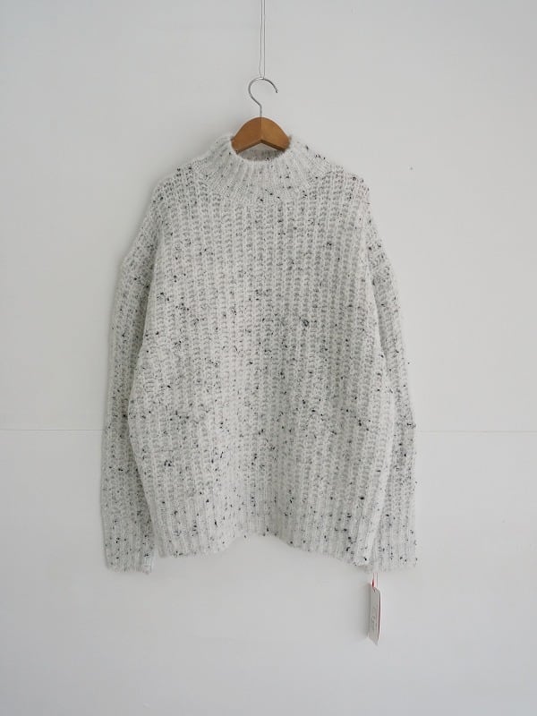 カラーネップの混ざった糸で編みたてれらたハイネックのプルオーバー。凹凸のあるワッフル状の編地もポイントです。