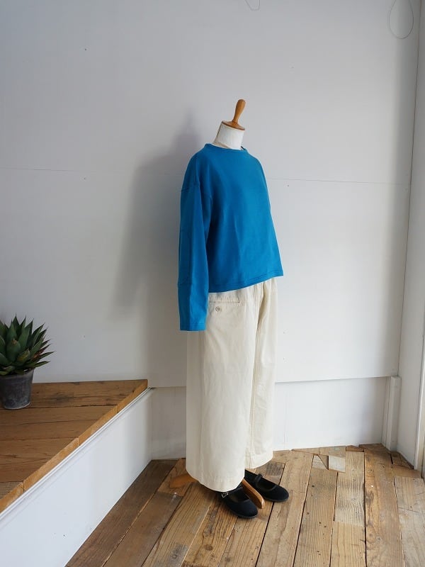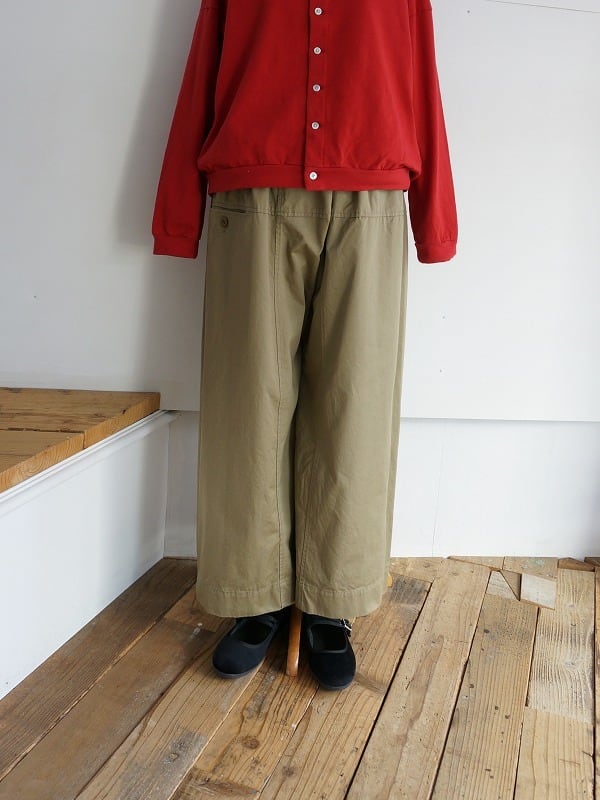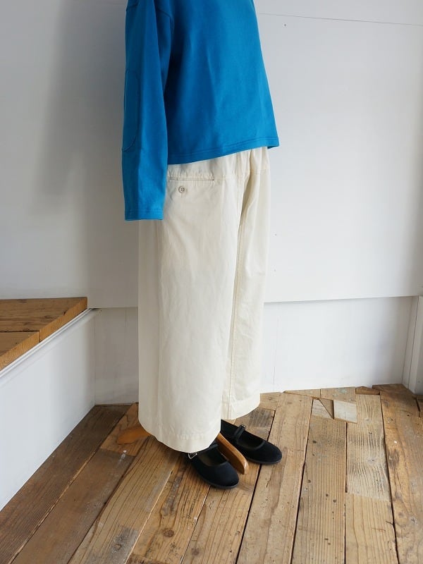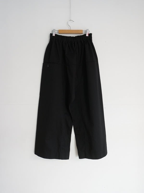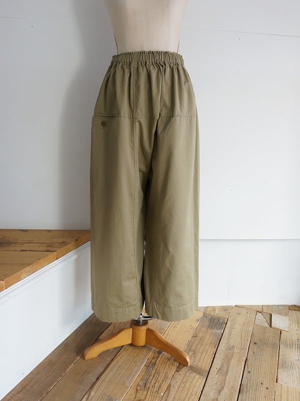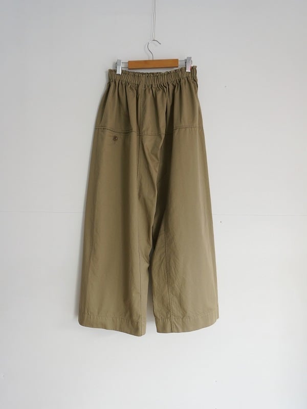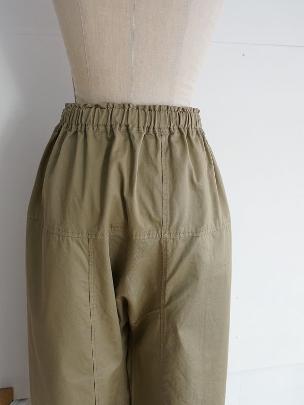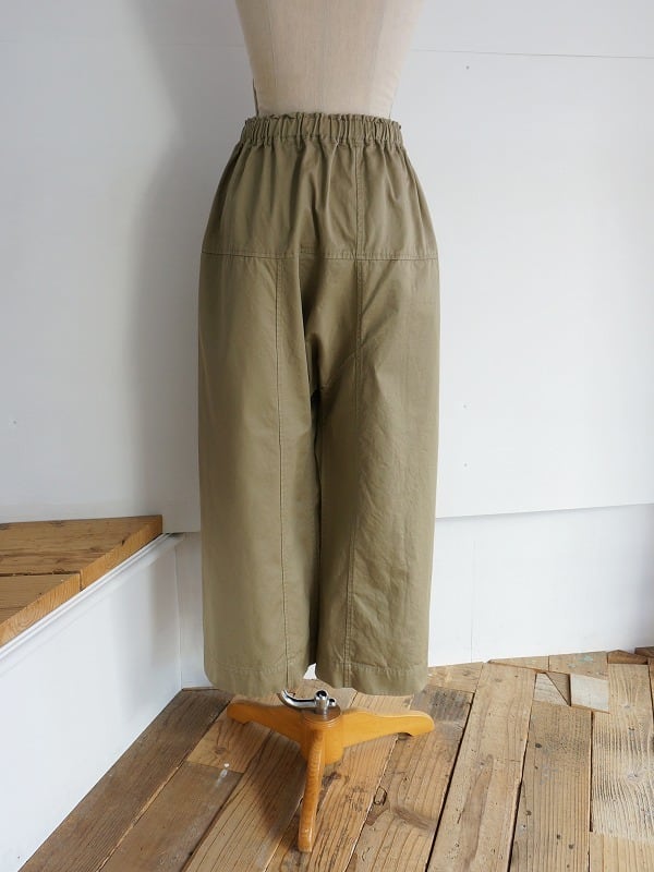 タイパンツがモチーフの切り替えが特徴的なパンツです。総ゴムのウエストに、裾までストンとしたワイドシルエット。9分丈くらいのレングスで仕上げられています。