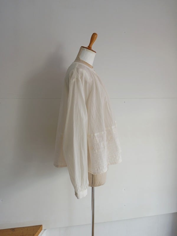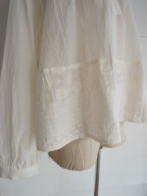 無地の部分はやや透け感のあるコットンキュプラの生地を使い、目指したのは日常でも気軽に着られるおめかし着。形はふわりとしたAラインのプルオーバータイプ。軽くスキッパーになった襟とループボタンもポイントです。