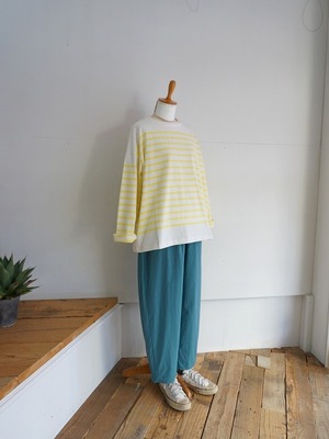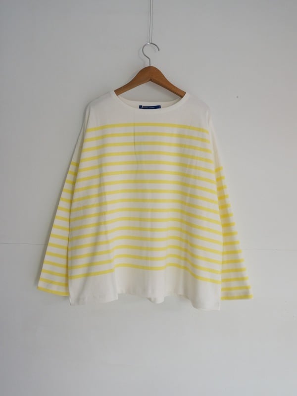 形はあえての幅広ボックスシルエット。立体感がいい雰囲気で、一枚ではもちろん、ハイネックやシャツに重ね着するのもおすすめです。白地にイエローとブルーのボーダーがさわやかに映えています。